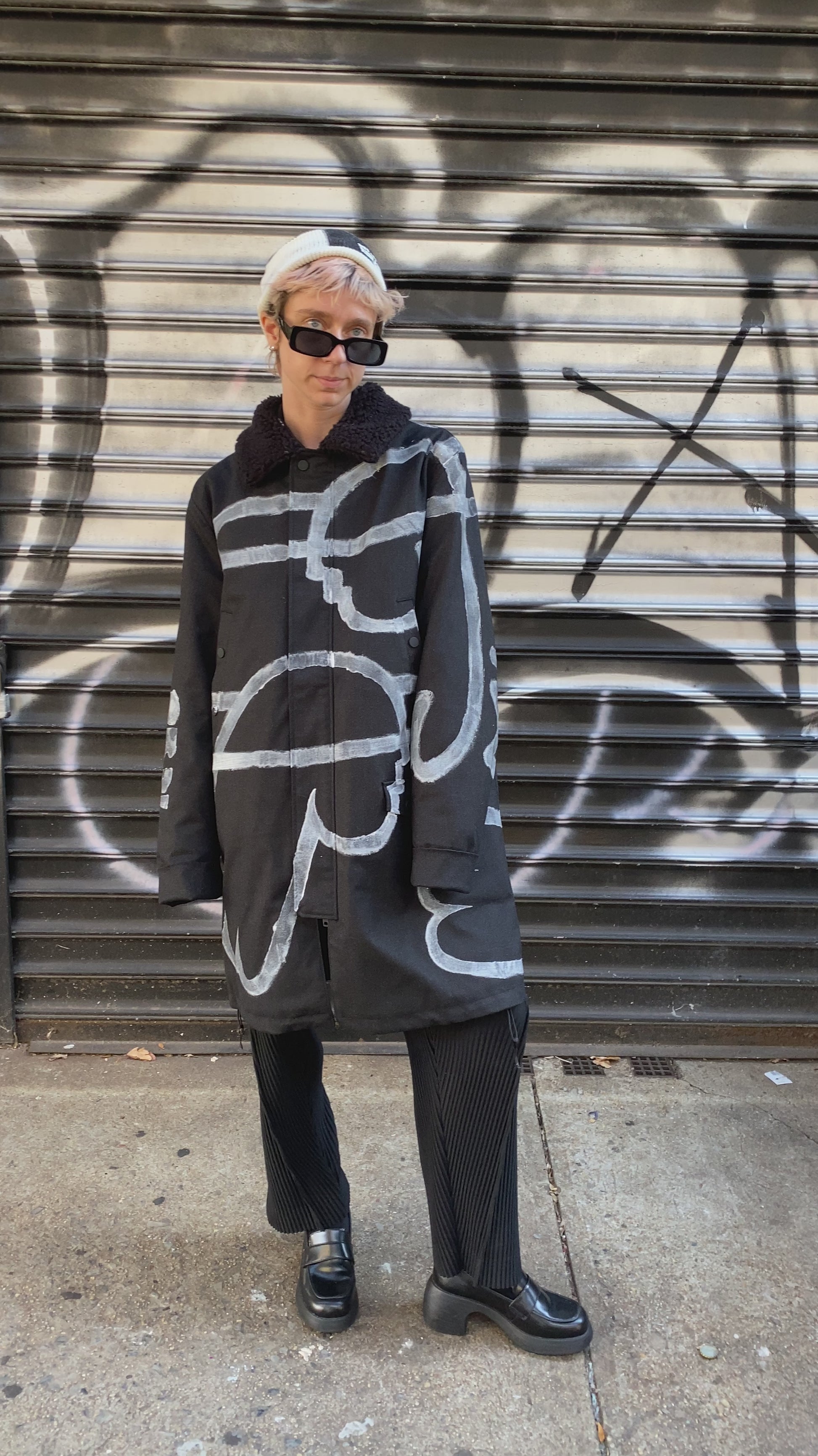 Instead of letting these sleek & technical jackets gather dust in storage, we are painting them for new life! Design features OR?!'s angels motif hand-painted with sheer white paint. These black coats feature a warm and fuzzy collar, plus three interior and three exterior pockets. Made to order, please allow up to 2 weeks for creation.