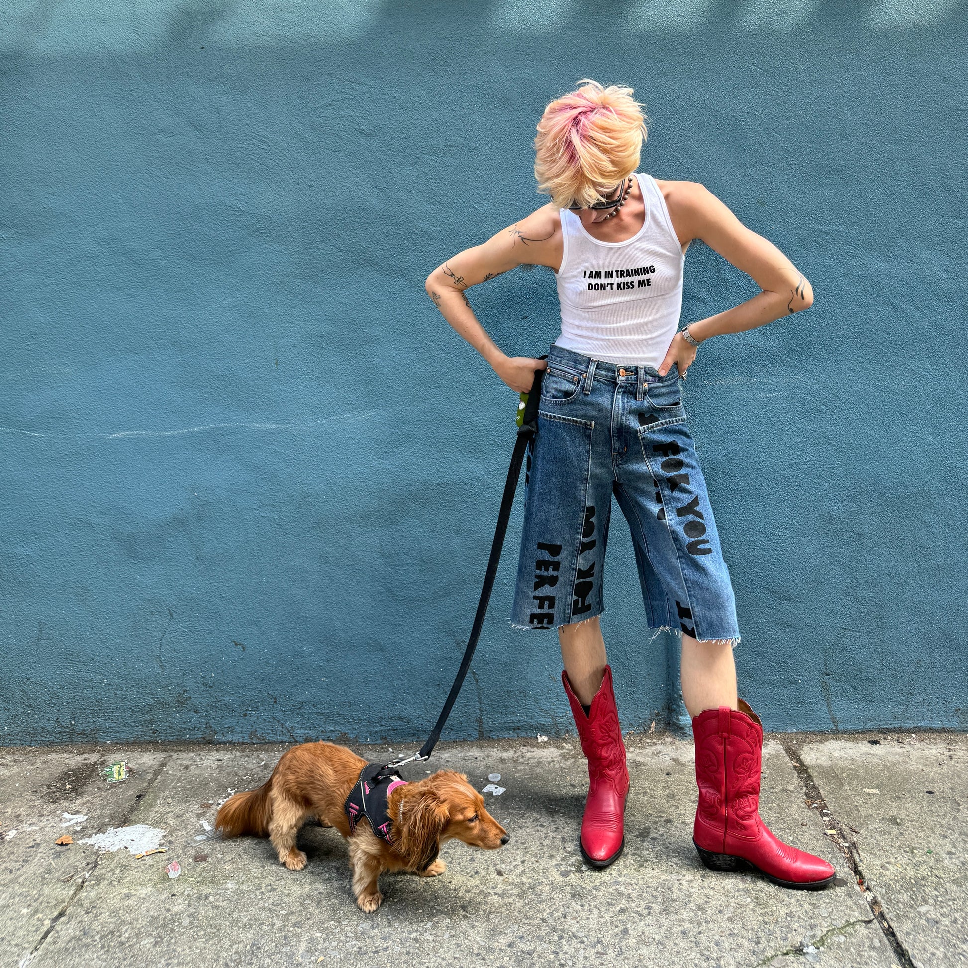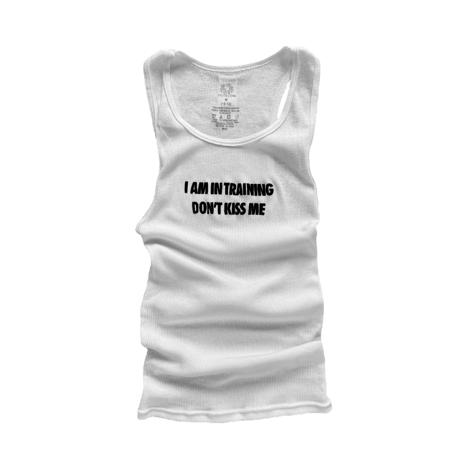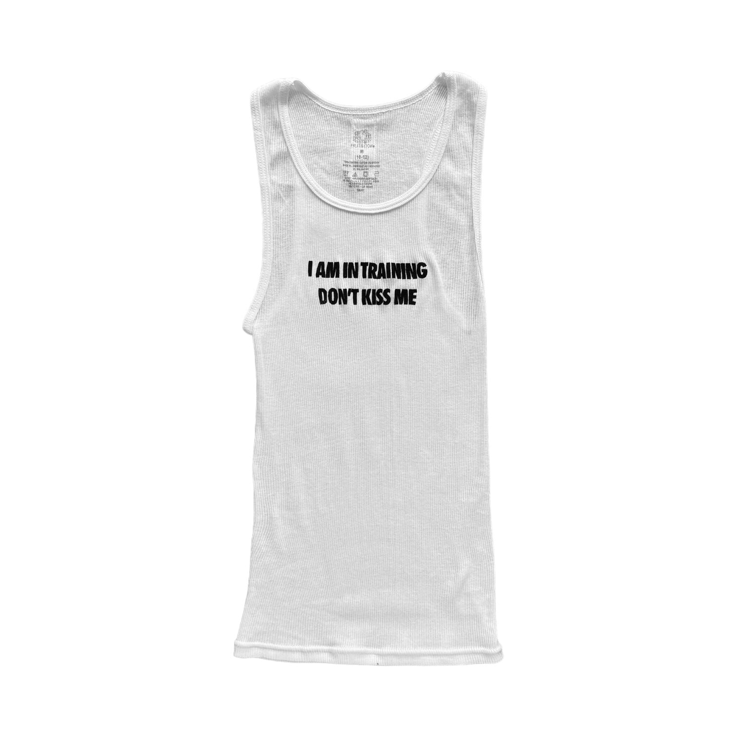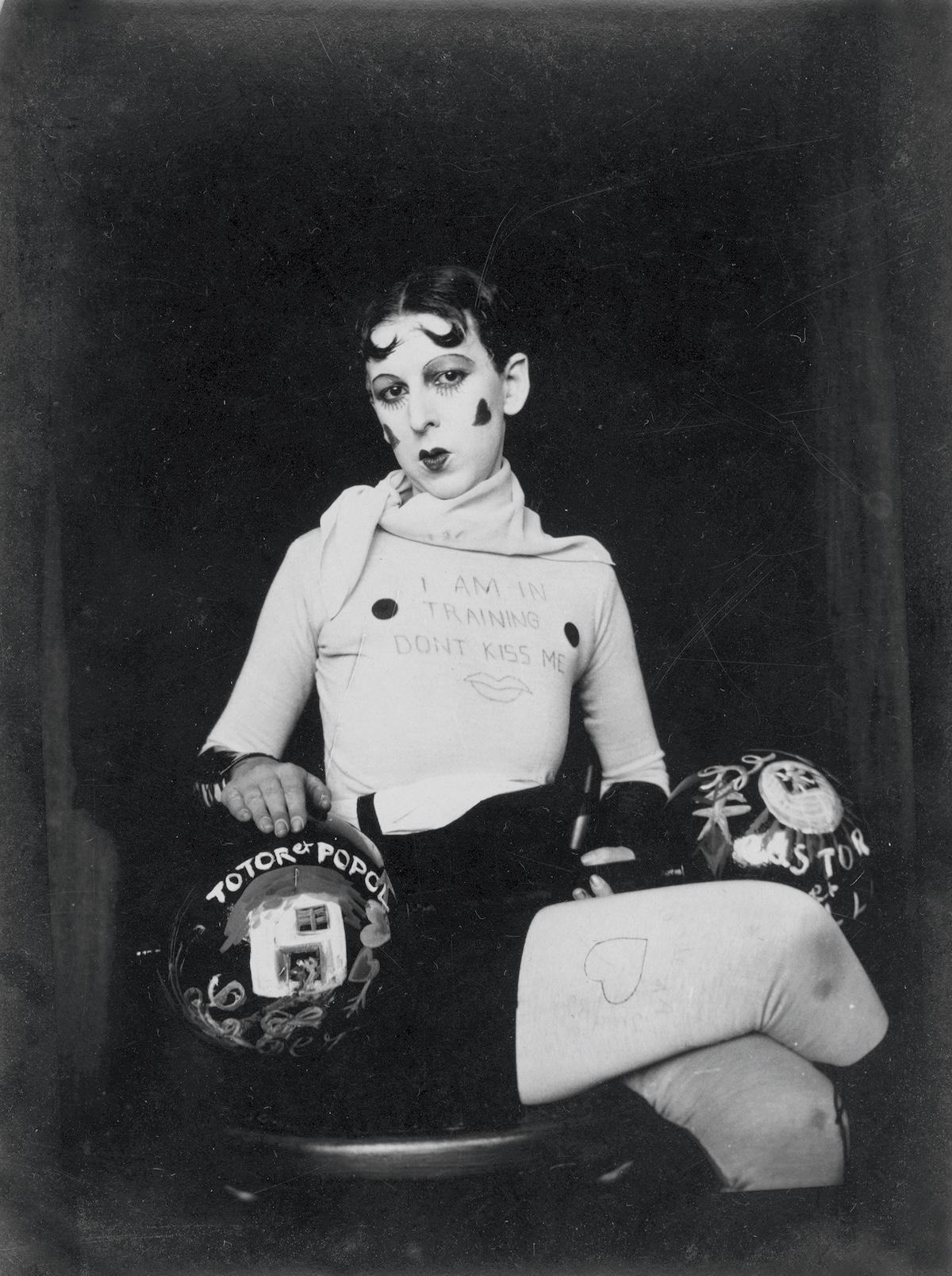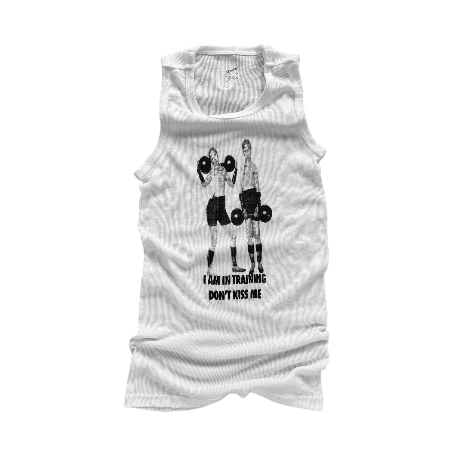 For this design we took two alternate shots from this 1920s self portrait series, less well-known than the leading image (included in this product images) and made an additional print with the text on Cahun's shirt "I AM IN TRAINING DON'T KISS ME". Pick your favorite version and we'll hand print it on a ribbed tank just for you. Just the text, just the image, or both together.
