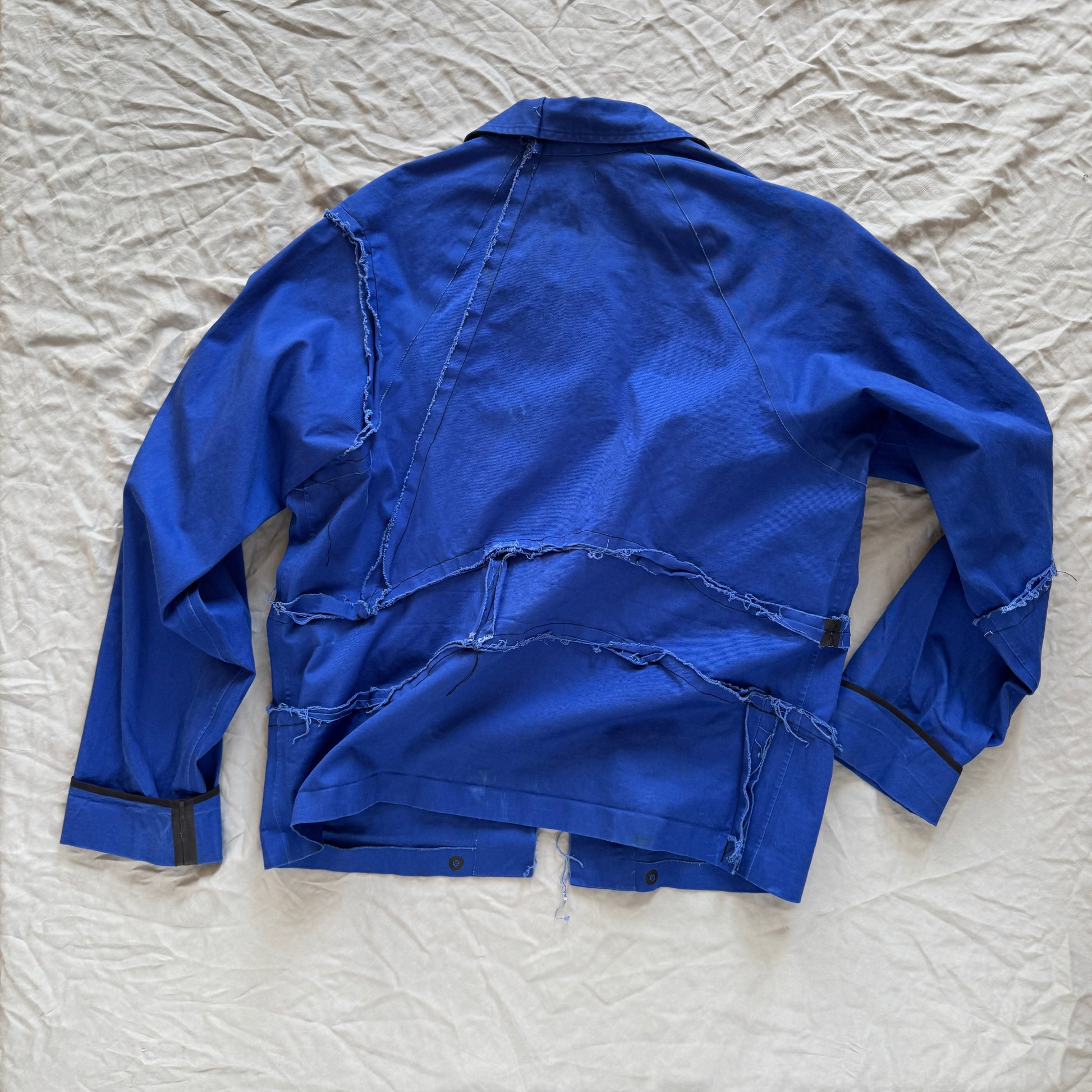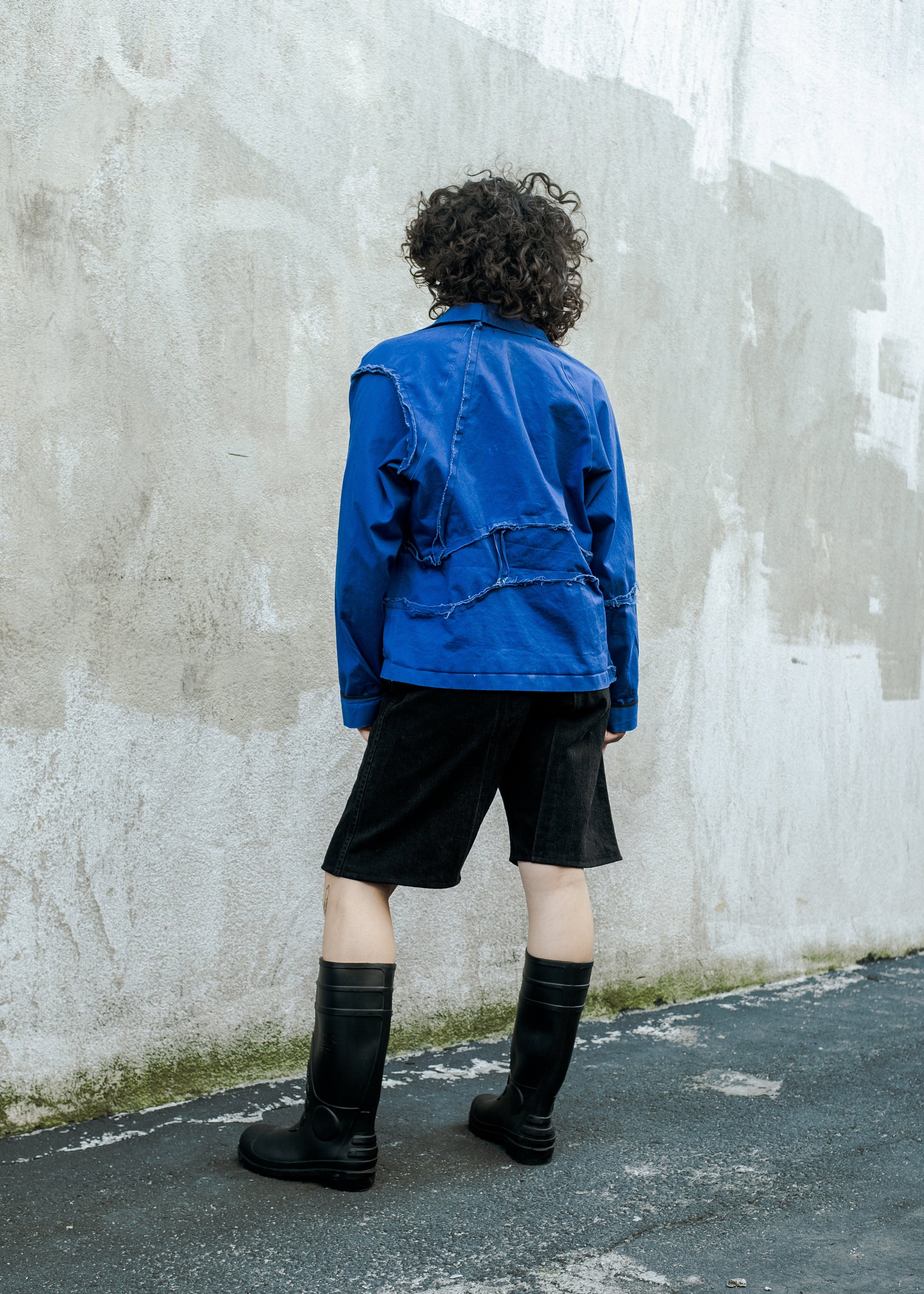 Reconstructed cobalt blue deadstock jacket with a front pocket and half zip. This piece was altered for a new genderless look with a shorter, boxier silhouette by cutting off defective areas and re-constructing the fabric with a curved seam, forming a wave across the back.