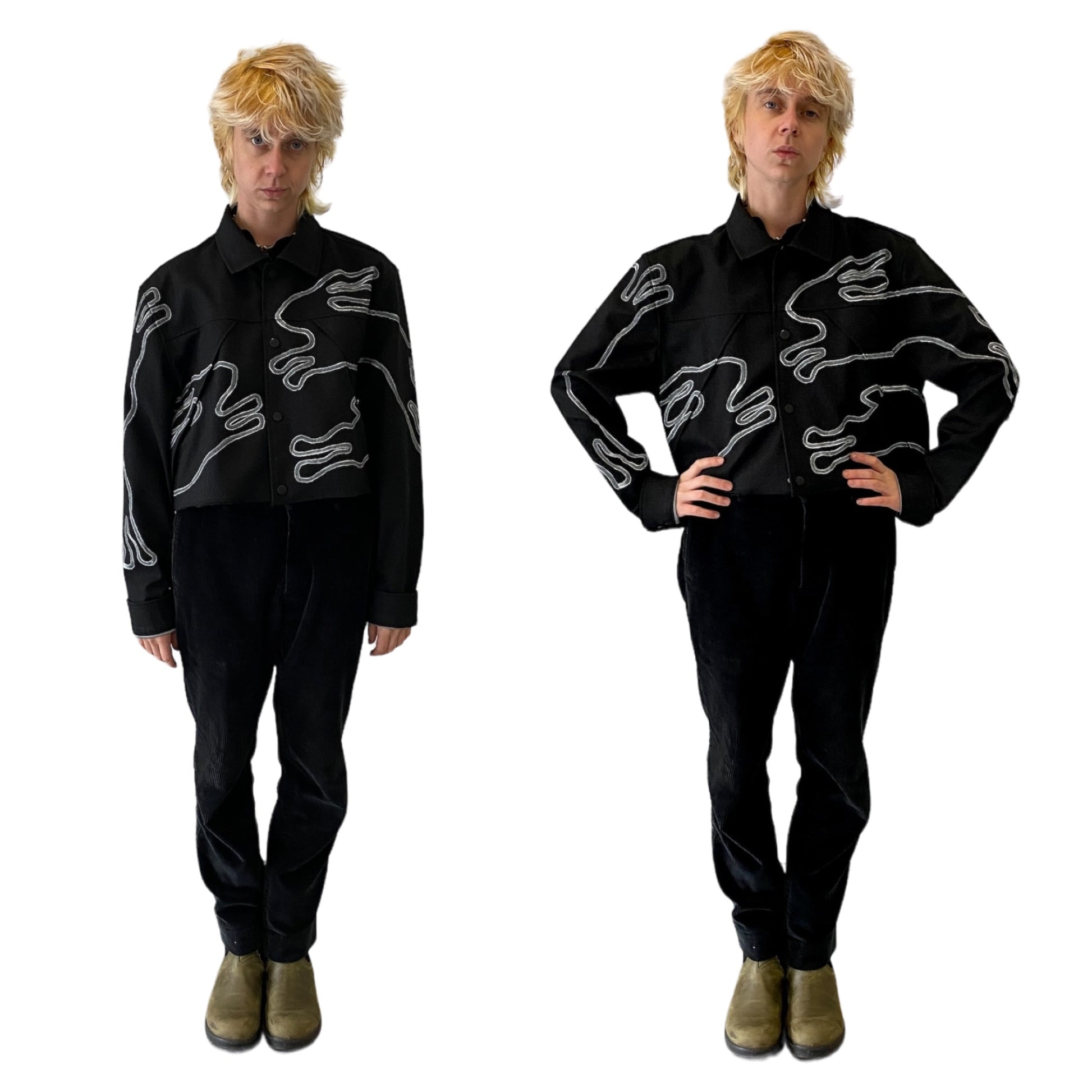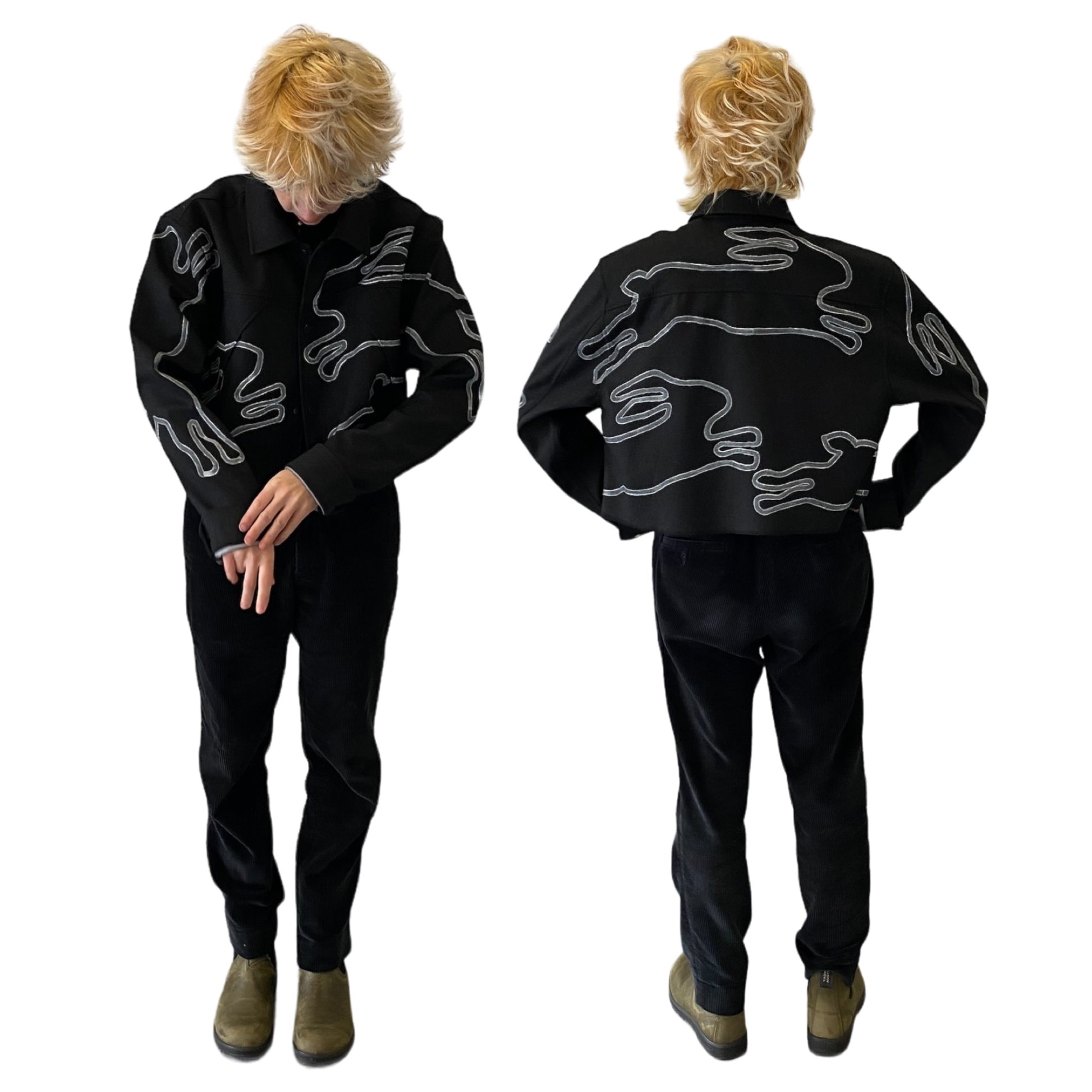 We rescued a batch of luxury deadstock to bring you the perfect trans-seasonal jacket. The silhouette gets cropped and hemmed the for a functional and modern matador look. We hand-painted bunnies in white paint wrapping around the body of the jacket and the sleeves, double serged all the edges for detail, and had additional snaps added since not all the pieces were finished when they were abandoned by the original designer.