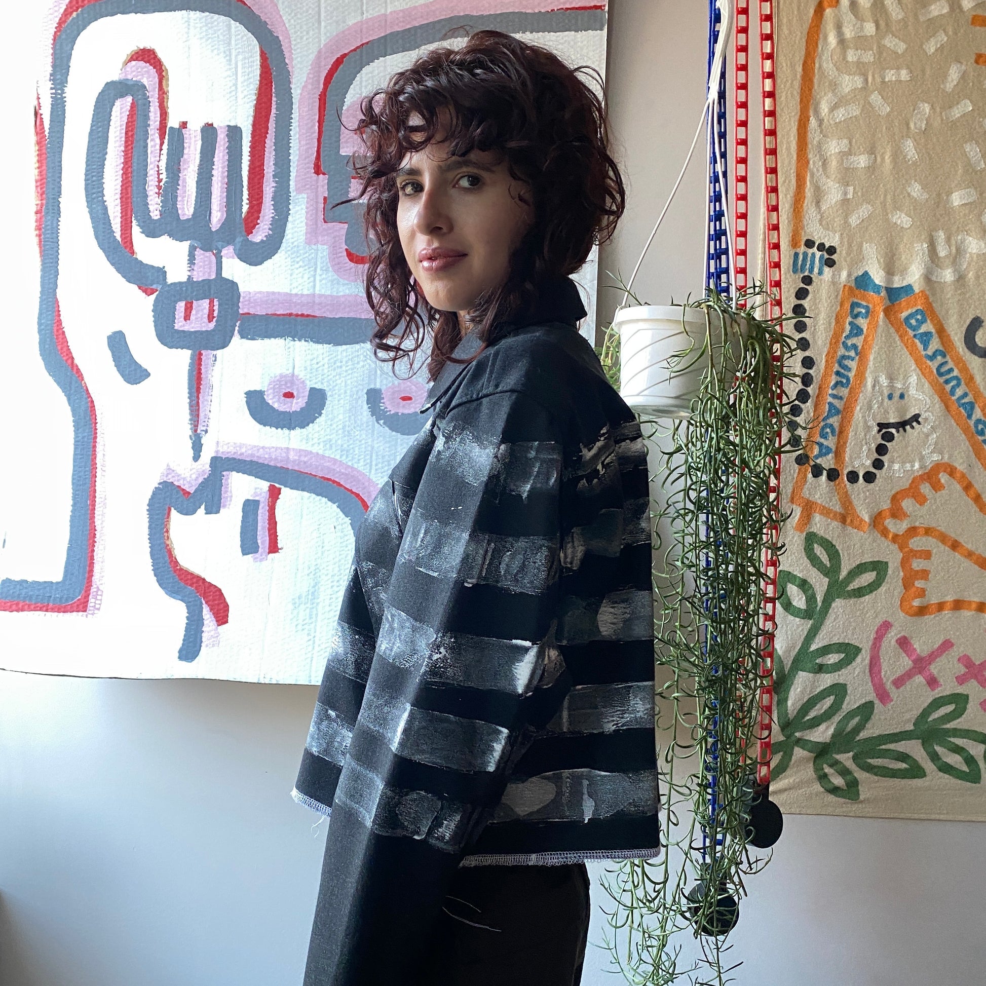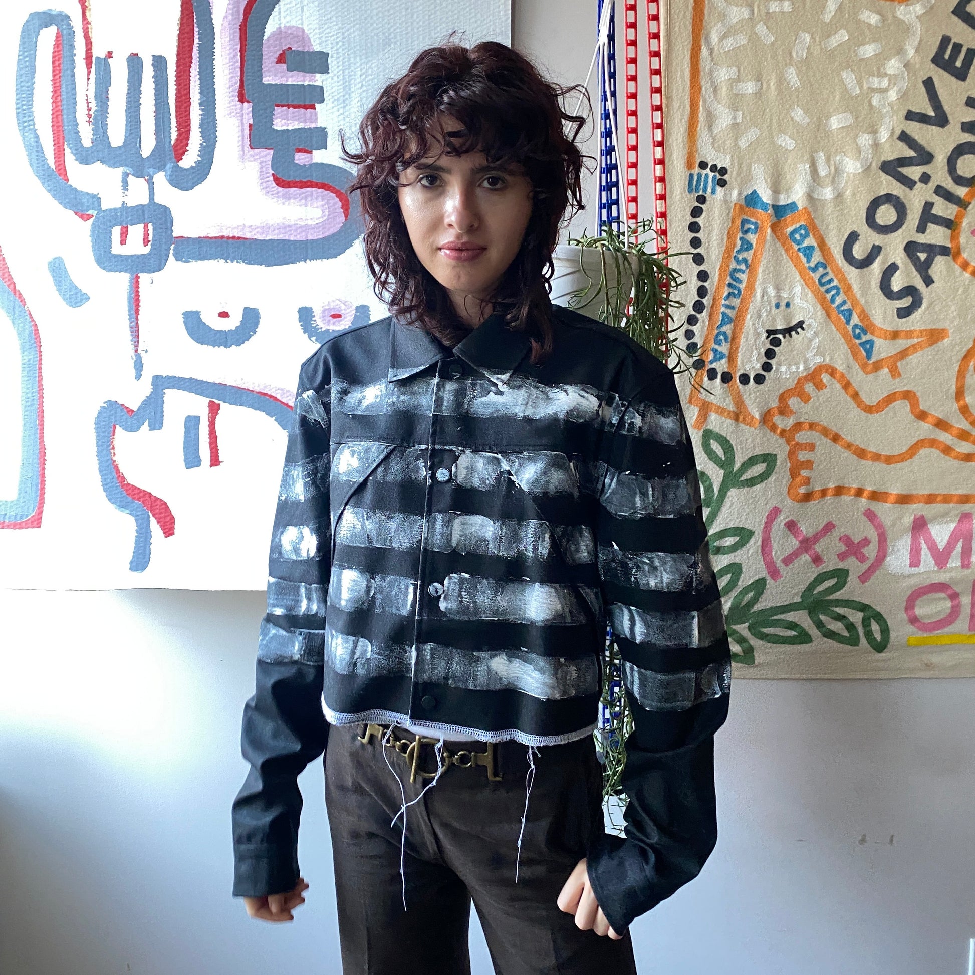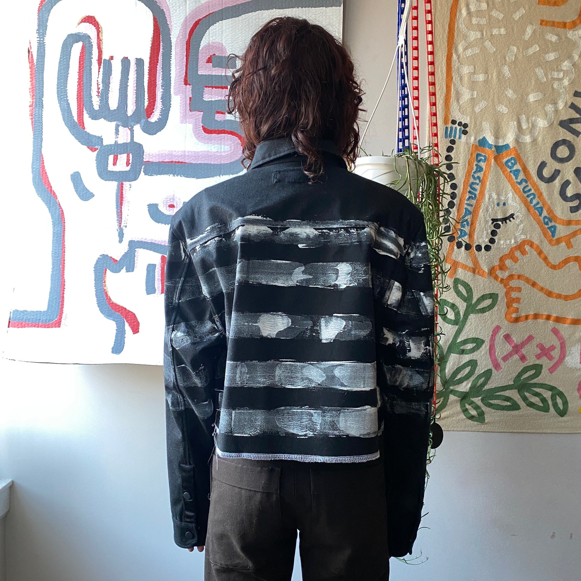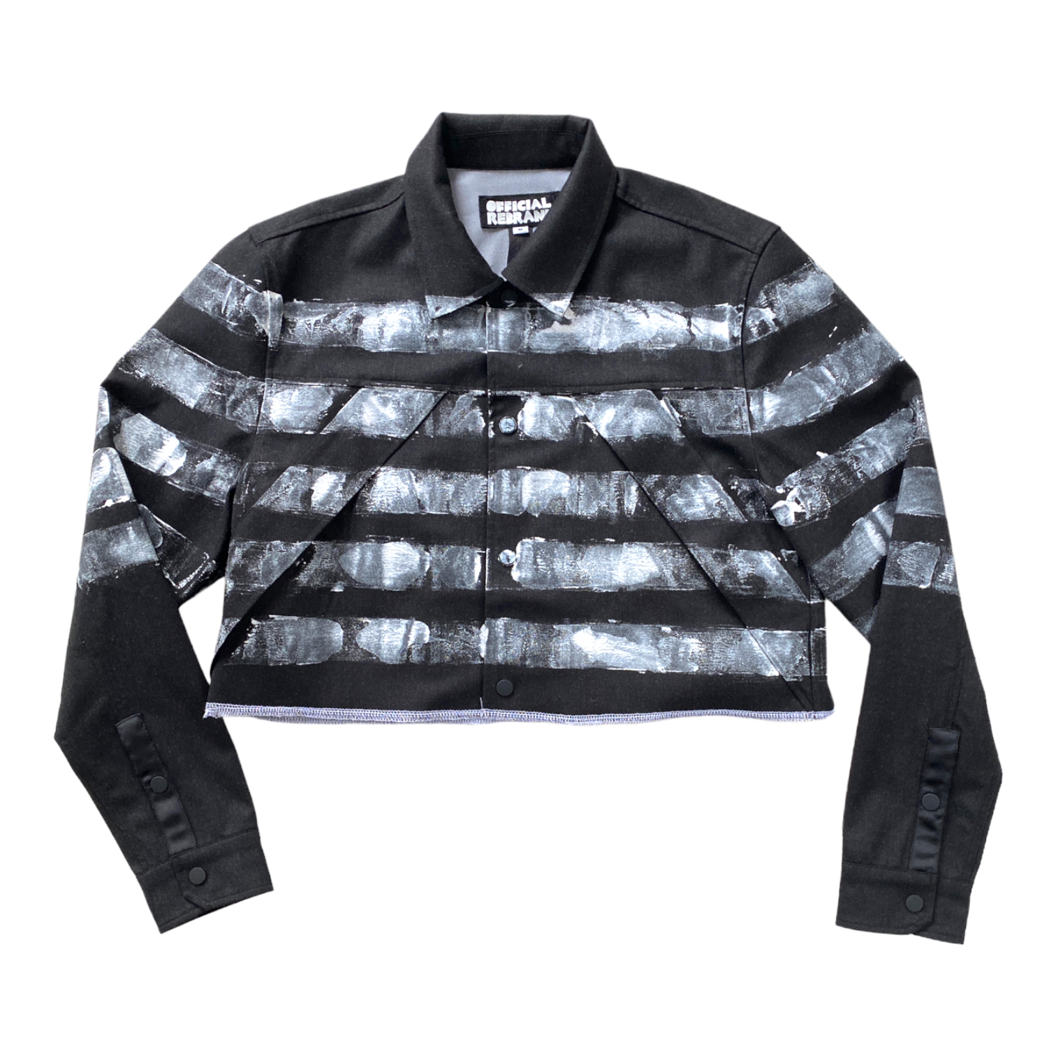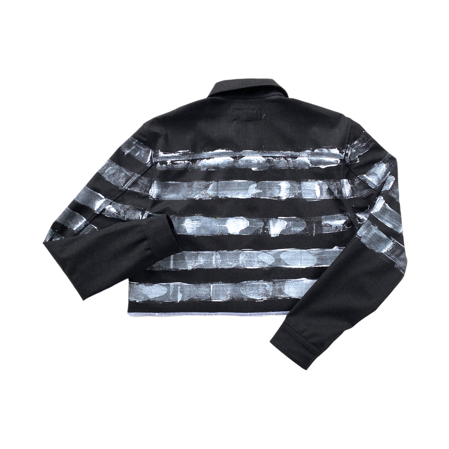 We rescued a batch of luxury deadstock to bring you the perfect trans-seasonal jacket. We officially rebranded the silhouette by cropping the body for a functional and modern matador look. We hand-painted stripes in white paint wrapping around the body of the jacket and the sleeves, double serged all the edges for detail, and had additional snaps added since not all the pieces were finished when they were abandoned. We left the threads from the finishing details hanging, but feel free to snip them yourself for a cleaner look.