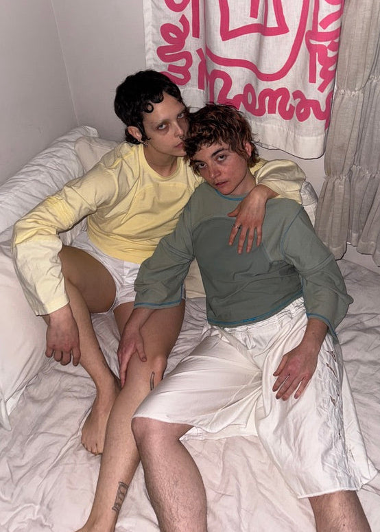 The original T's were restructured by combining two shirts and cutting around the original printed design to create a wavy horizon seam across the chest. They were stripped of their luridly bright colors to create unique new tones; custard and lichen sky. As we remove the dye in small batches, slight variation in tones occurs, giving each piece a unique, natural-dye-looking feel.
