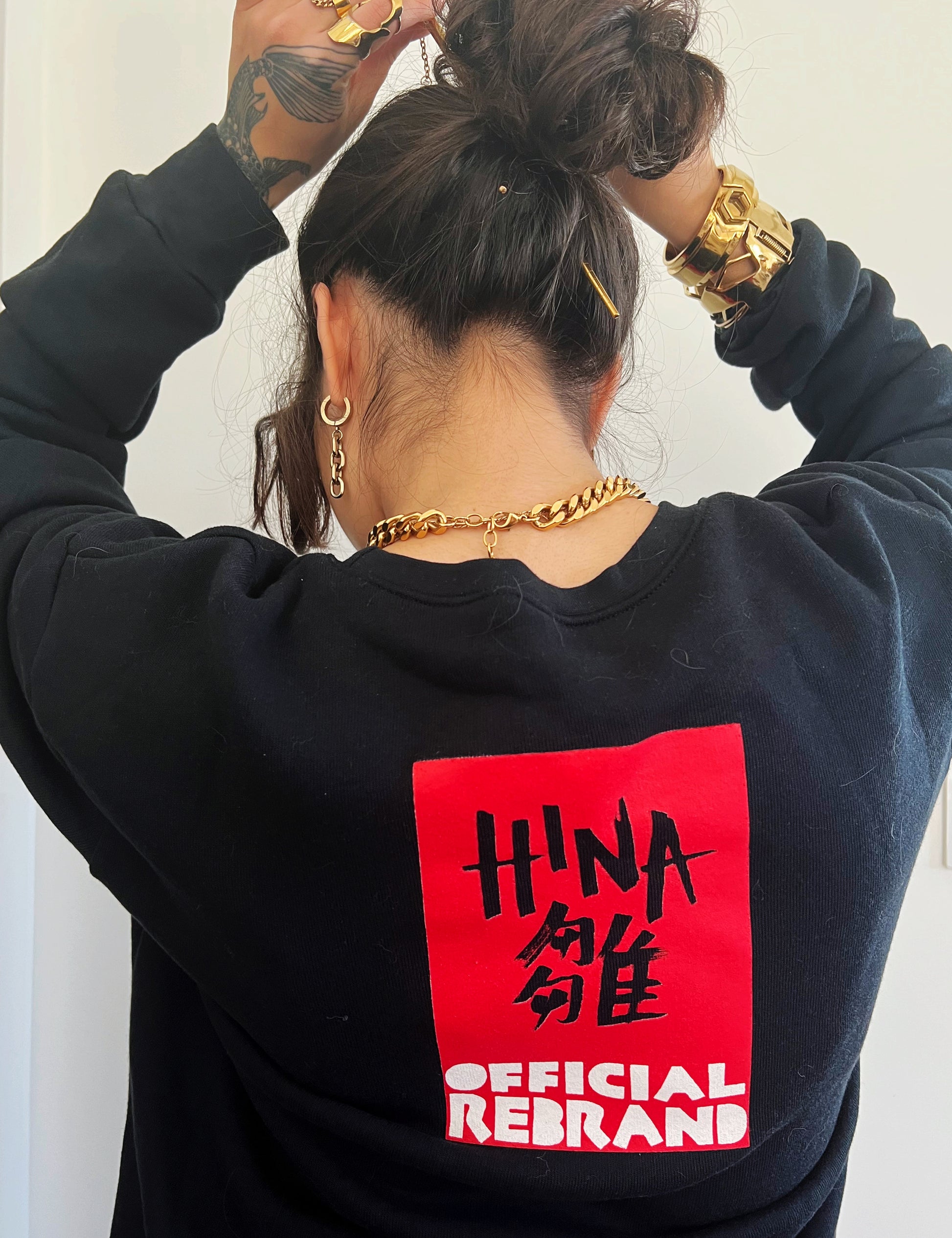 Bright, scarlet text reads "D*KE AGENDA" The bold print, based on a painting by MI Leggett, covers up a misprint. Faint outlines of the original print add texture and history to this uniquely anti-waste piece. Our East Village printer reached out to us to sustainably salvage this batch of sweatshirts. We designed a graphic to fit perfectly over the original print, and saved these soft and cozy sweatshirts from becoming waste with a few new layers of ink. The back features Hina's english and kanji signatures over the Official Rebrand logo.