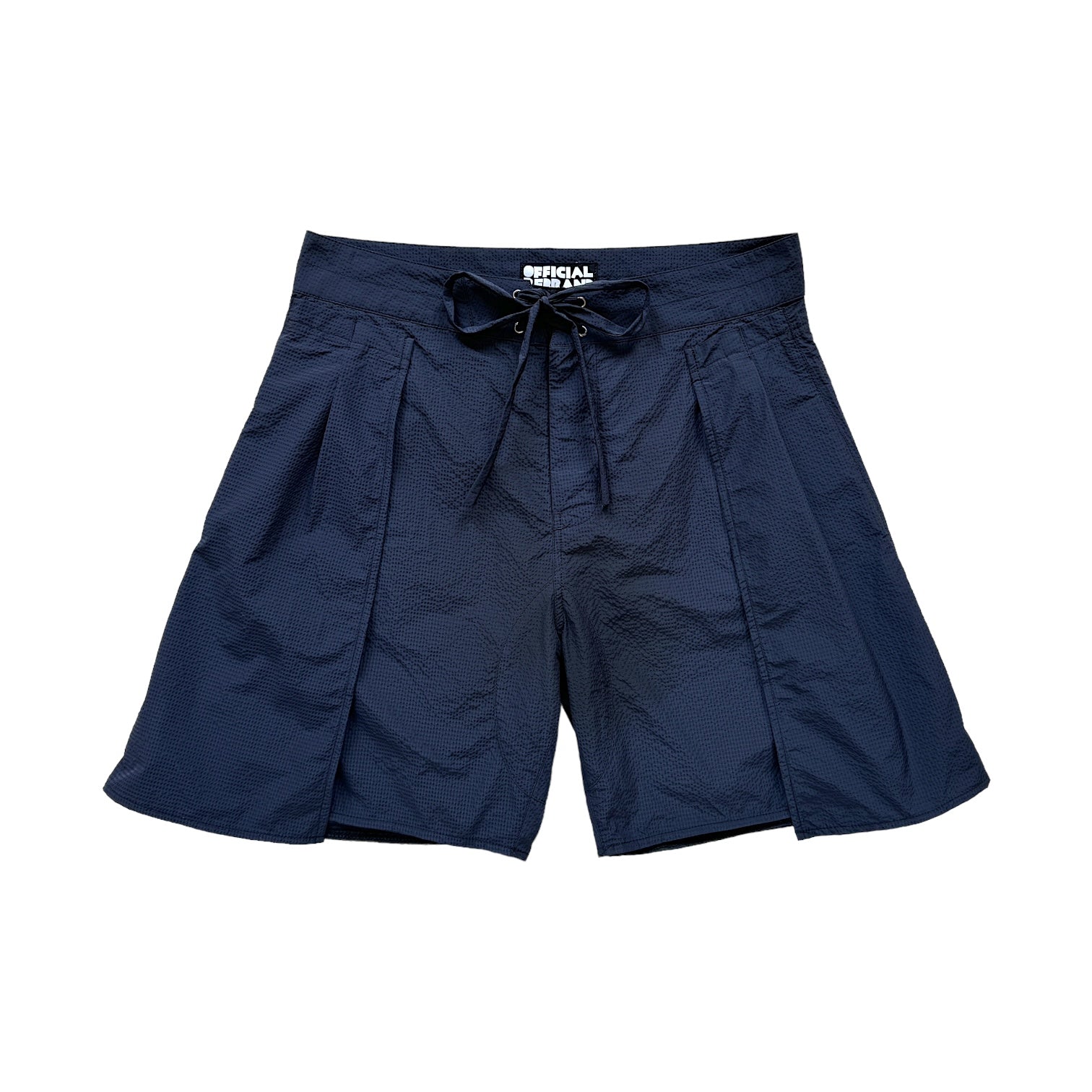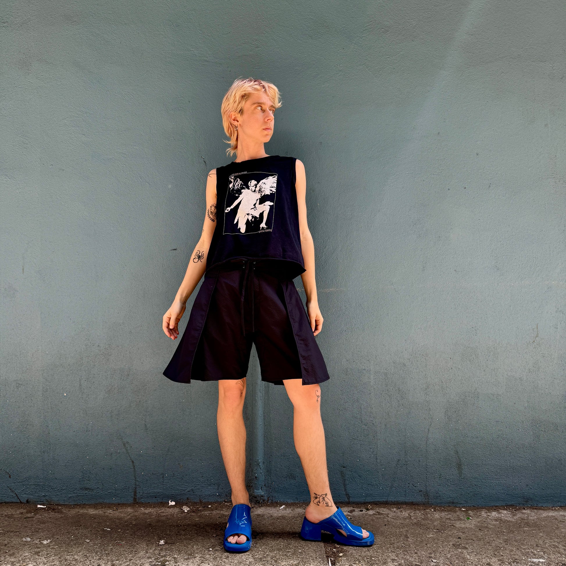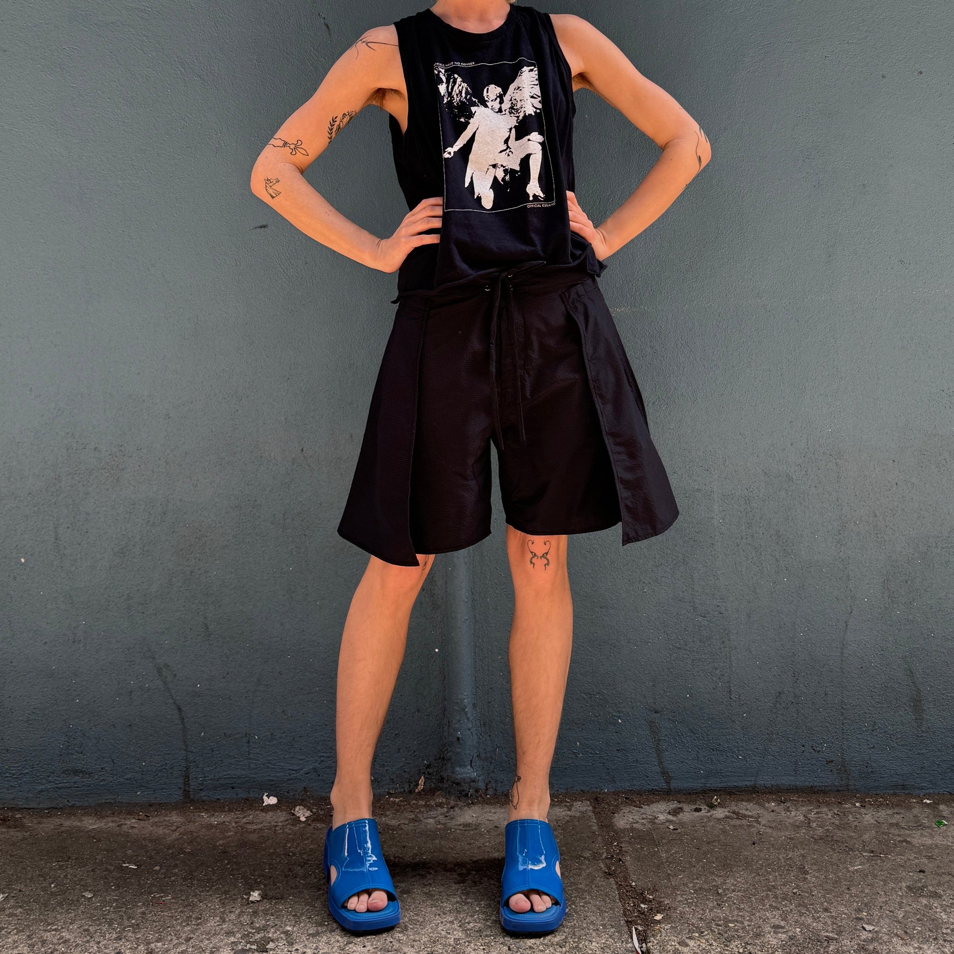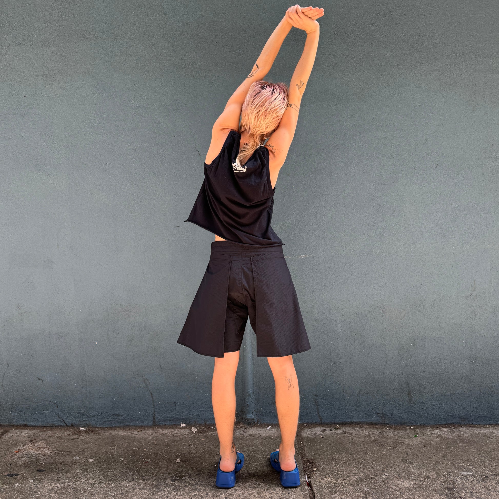 To reduce emissions and make use of what already exists, these lightweight 57% polyester 43% nylon skorts were upcycled from deadstock pants of a men's luxury sportswear brand that closed. These quick-drying, athletic style skorts are extremely breathable and can even be worn in the water. They have a (hidden) back zippered pocket to keep your items secure, two zippered side pockets, and a layer of overlapping skirt panels. Original garments cut & sewn by workers in Pakistan, transformed on a made to order basis.