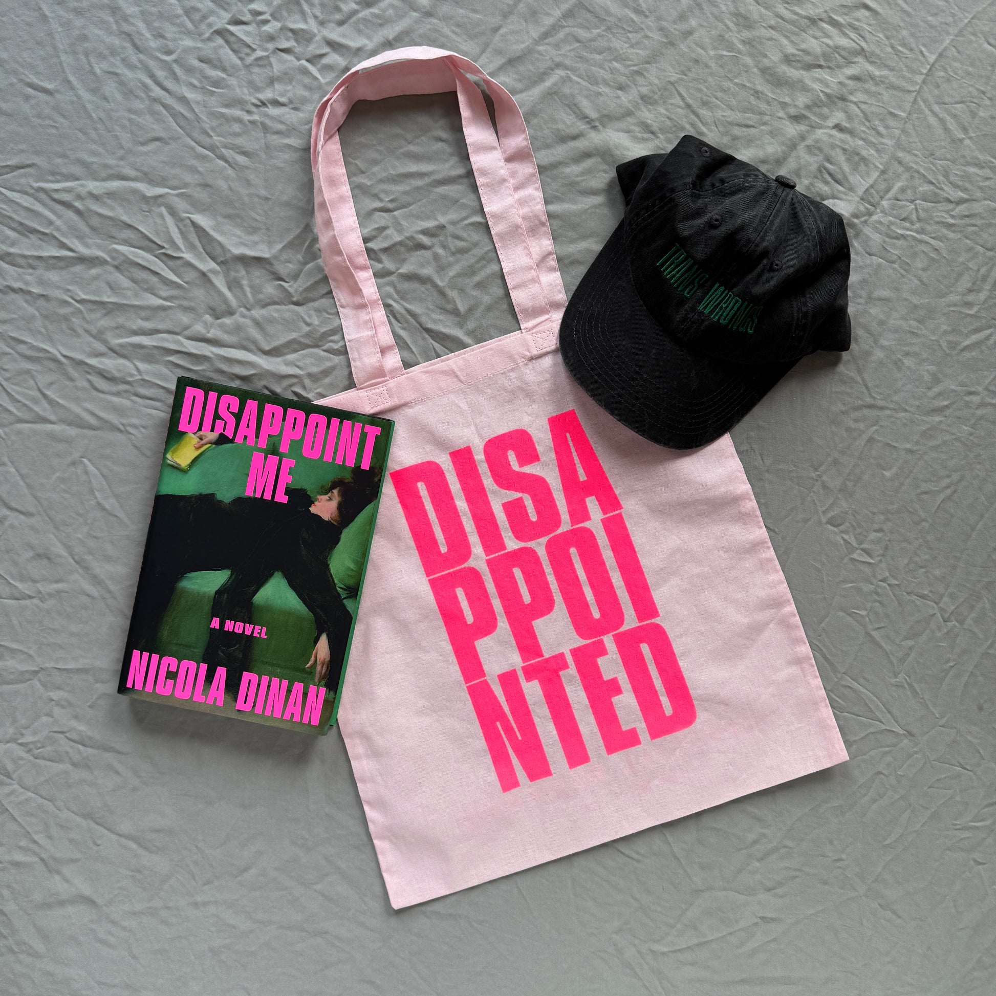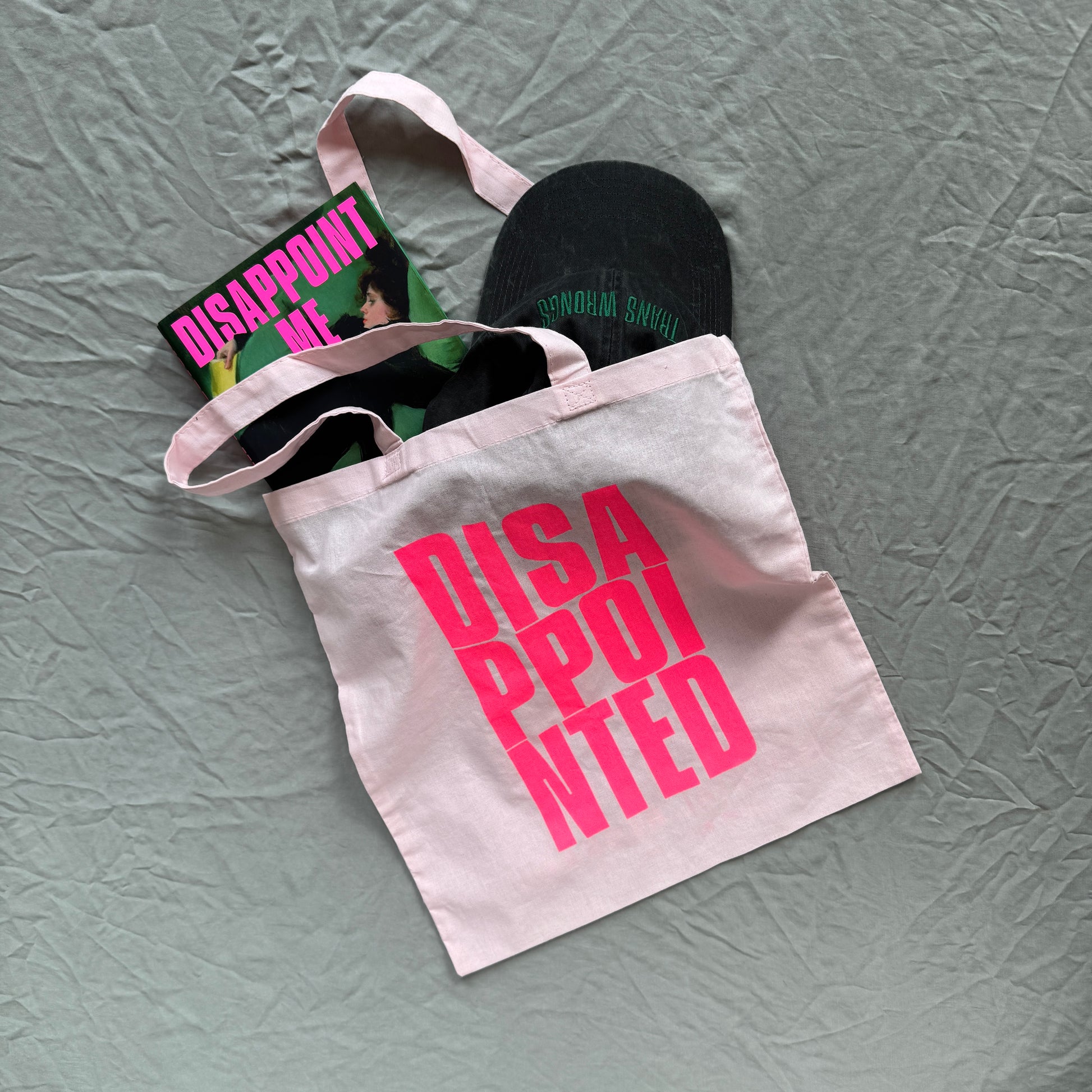 Limited edition "DISAPPOINTED" totes. Inspired by Nicola Dinan's sophomore novel Disappoint Me. Produced in collaboration with Penguin Random House and The Dial Press to celebrate the US publication of this electrifying tale of love, betrayal, the complicated allure of bougie domesticity, and trans wrongs. (shop the "TRANS WRONGS" hat, the other part of this collaboration here)