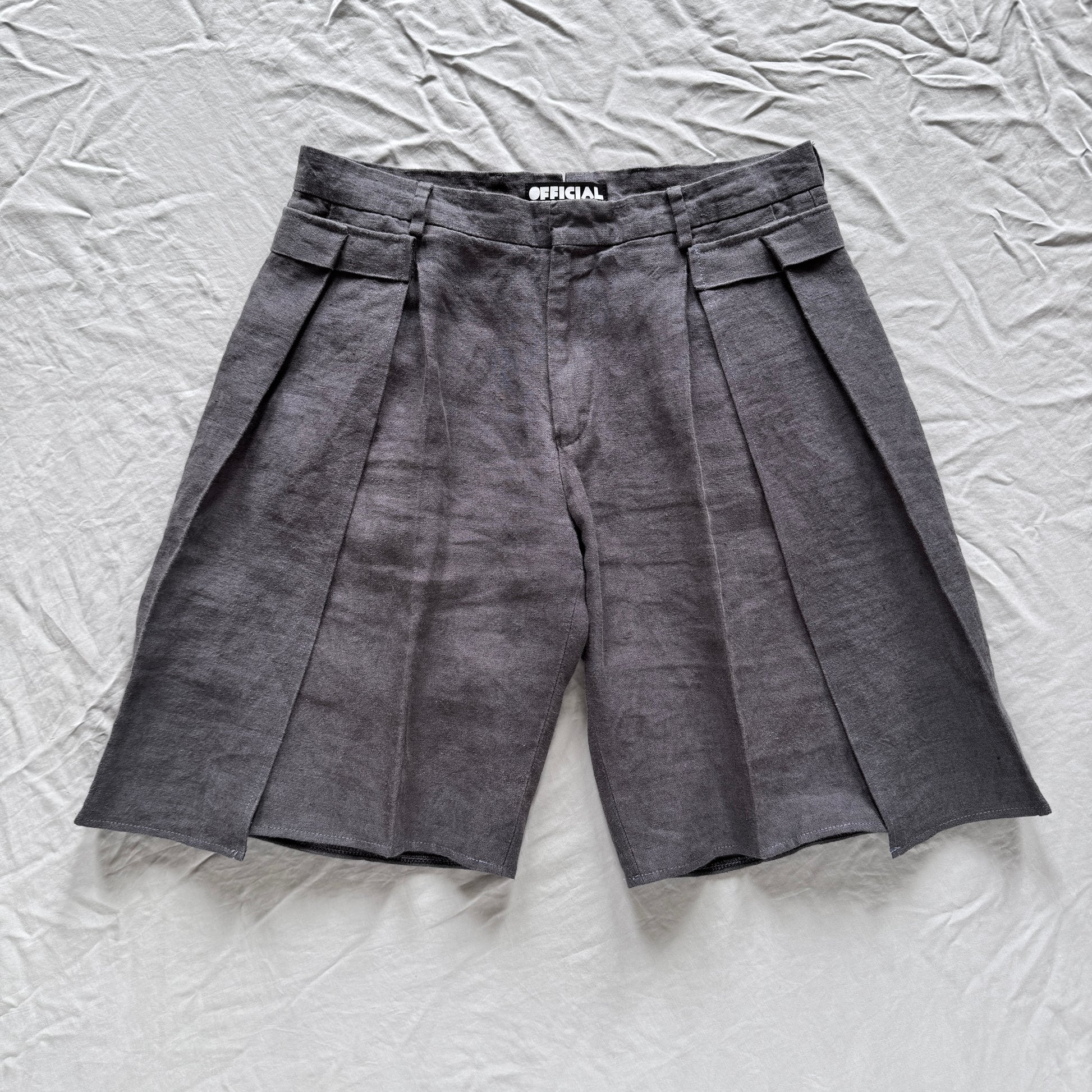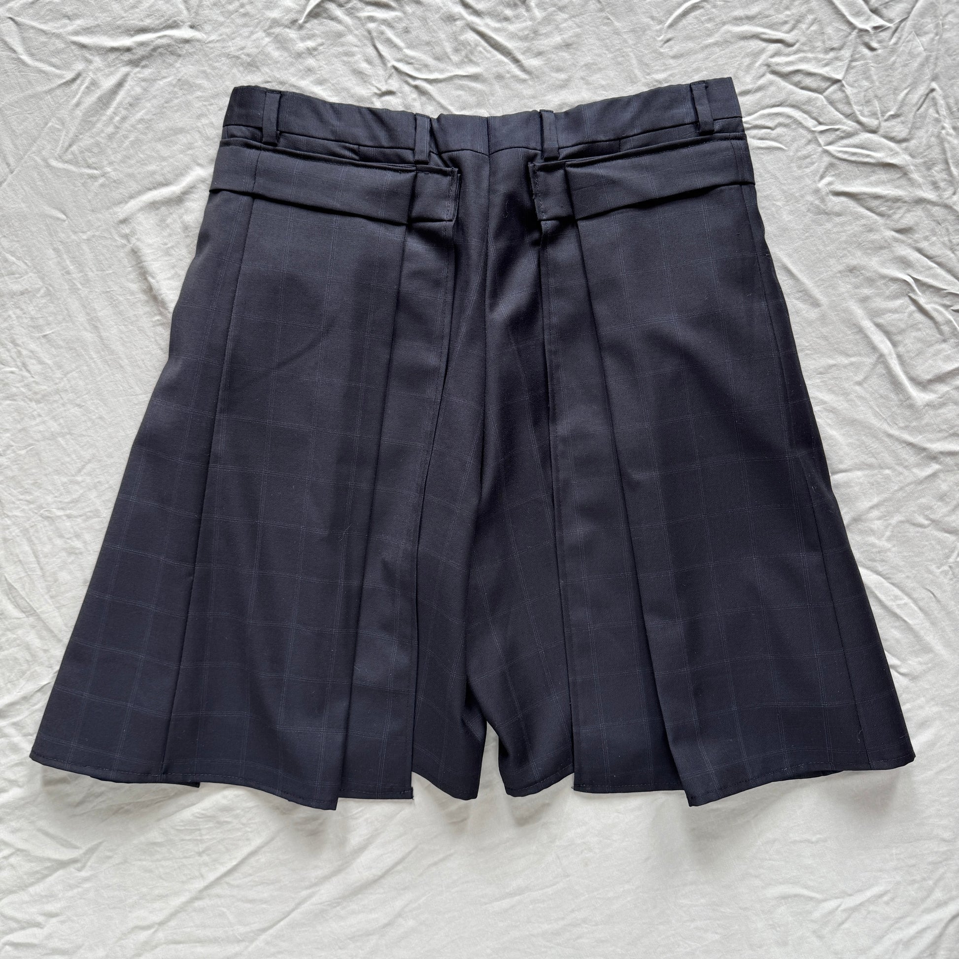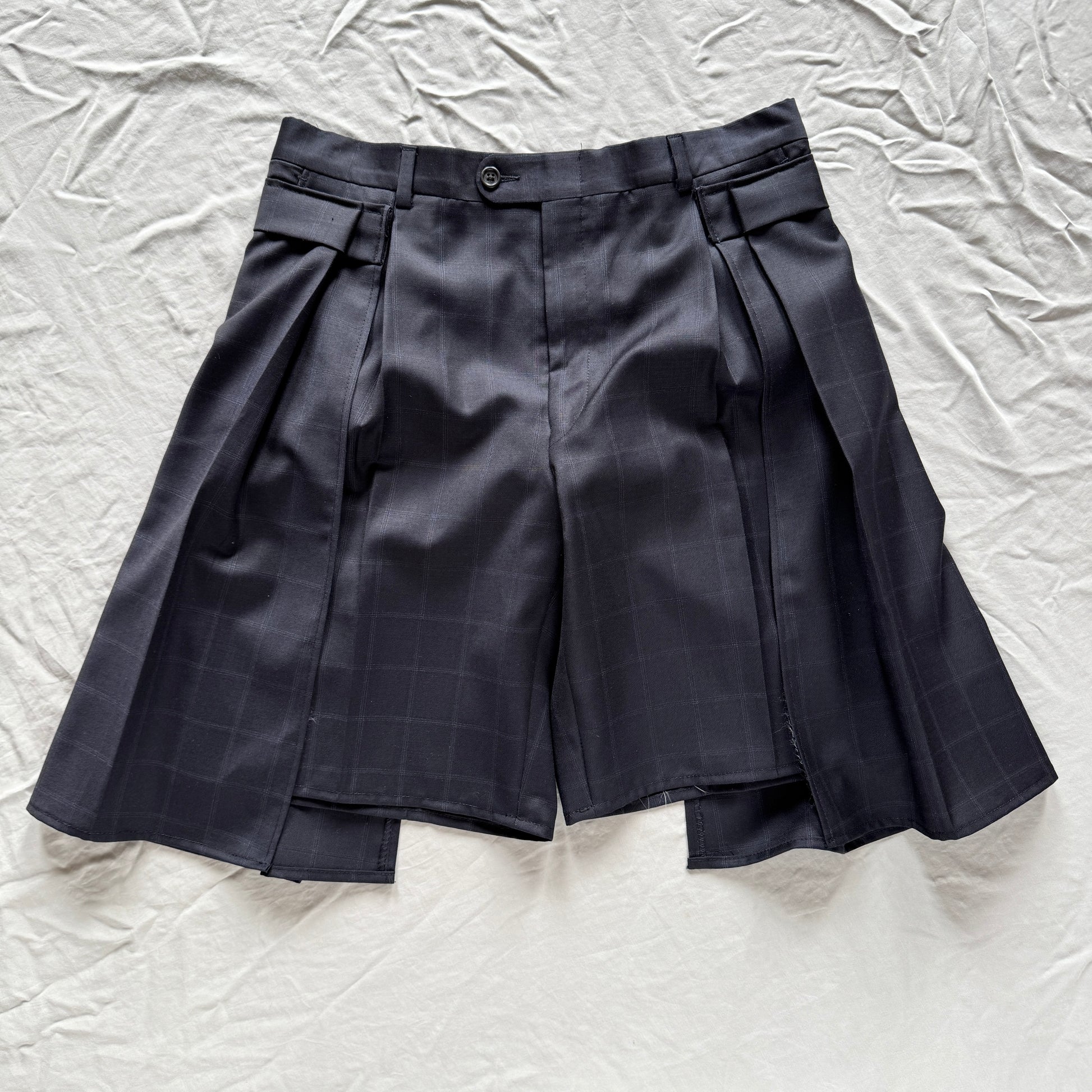 We rescued these pants and restructured them, giving them a chance at second life. Originally shaped as long dress pants, these bottoms were cut and reworked into shorts with an overlayed pleat, updated for a more relevant and skort-like look.