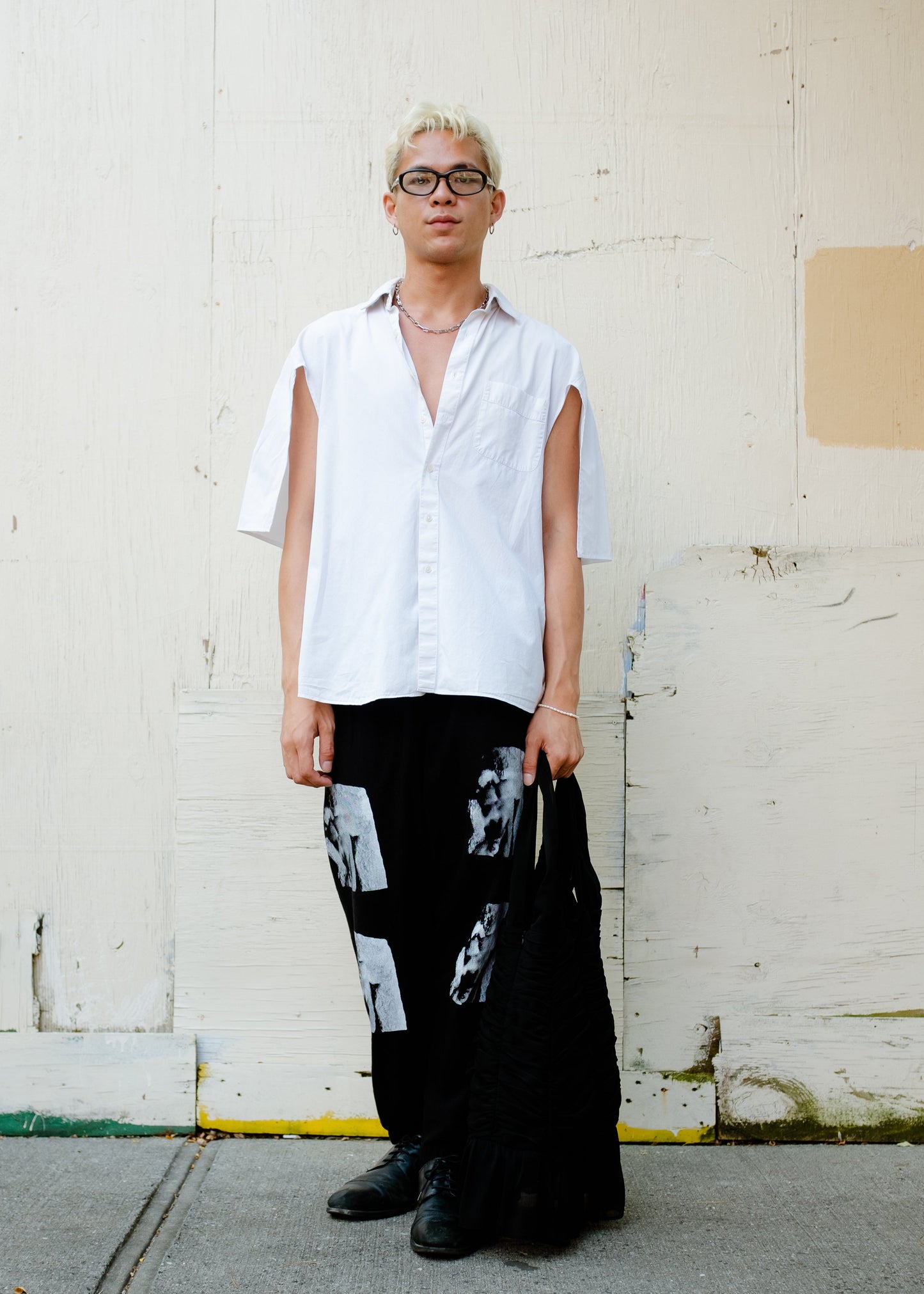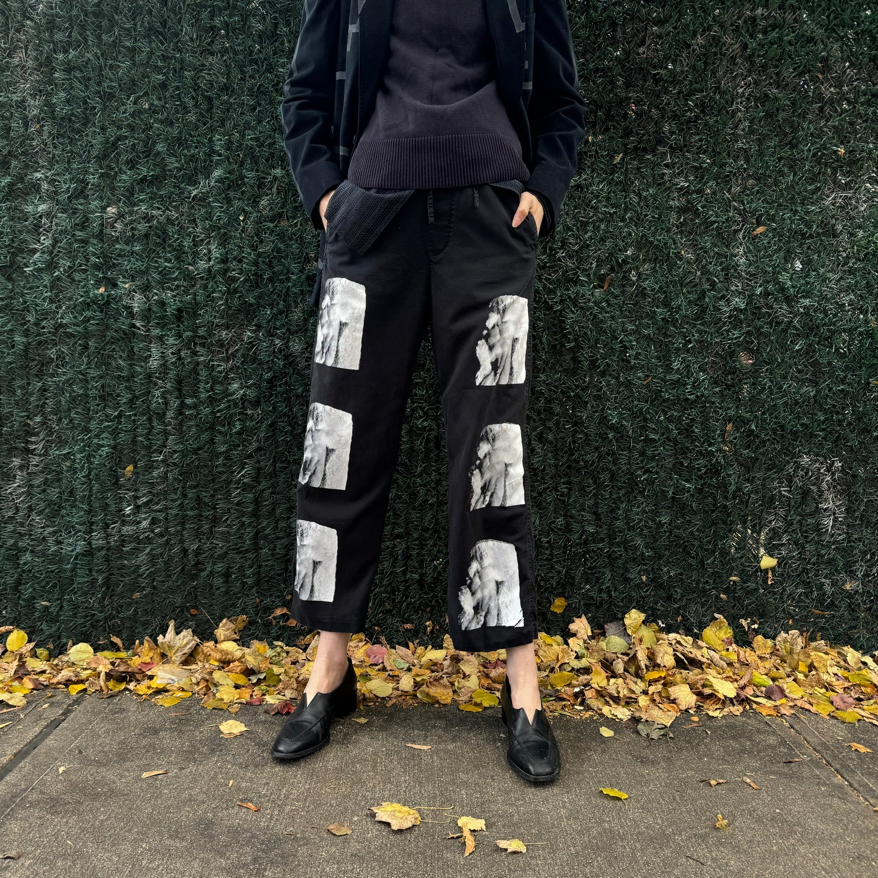 This series of printed bottoms feature white hand-printed images of an unfinished Michelangelo sculpture, perpetually in transformation.