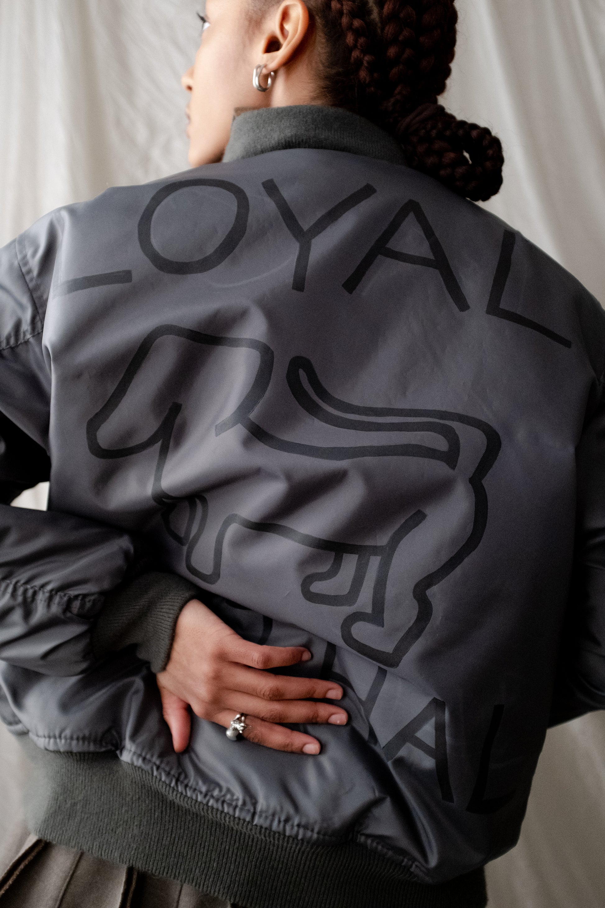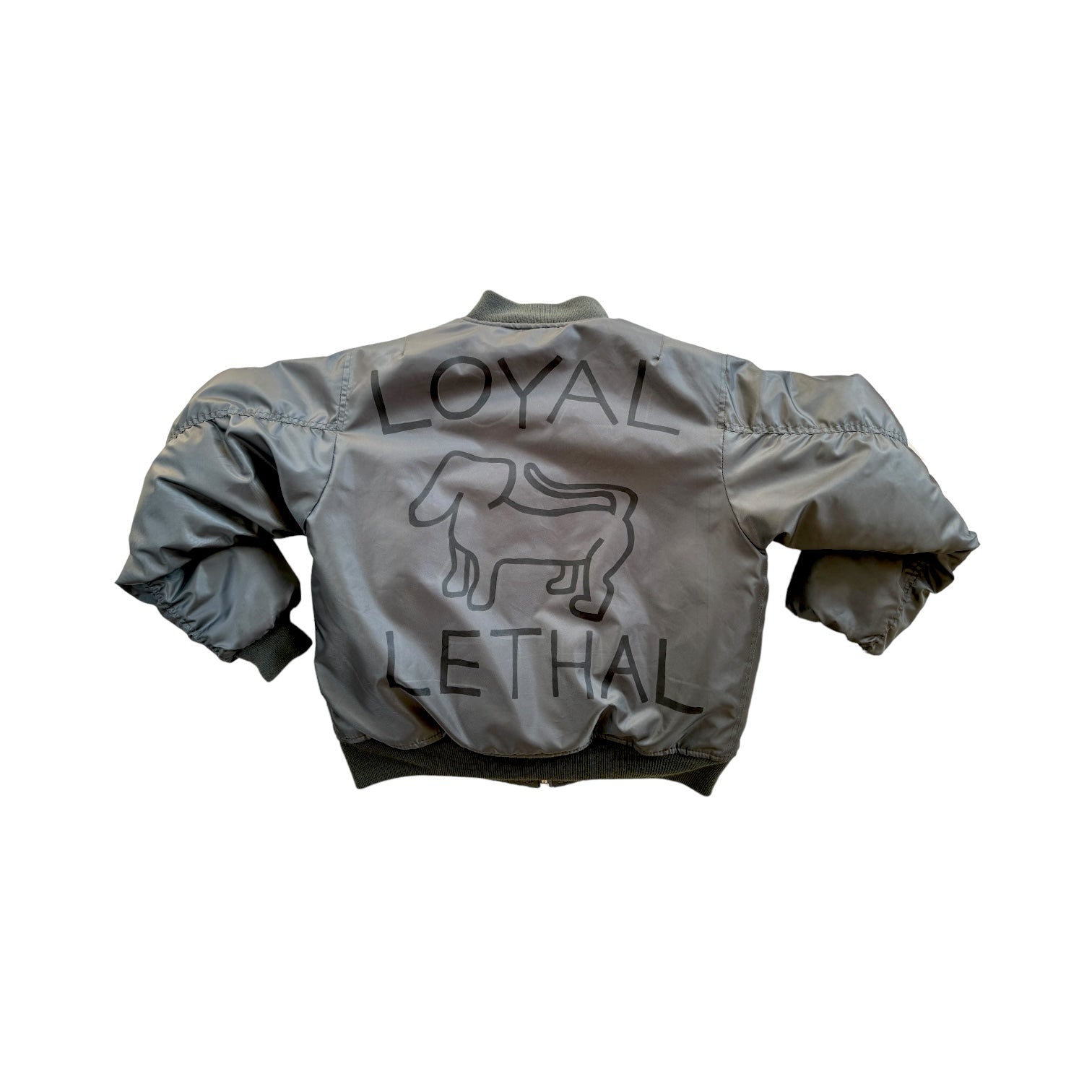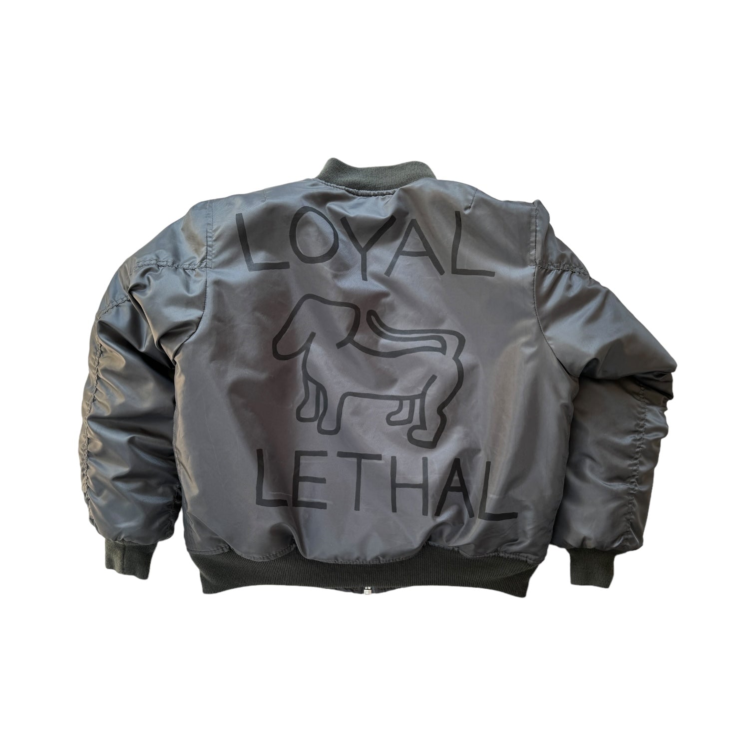 LOYAL LETHAL text surrounding a dachshund puppy silhouette hand-painted in black on gunmetal grey military-style flight jacket.