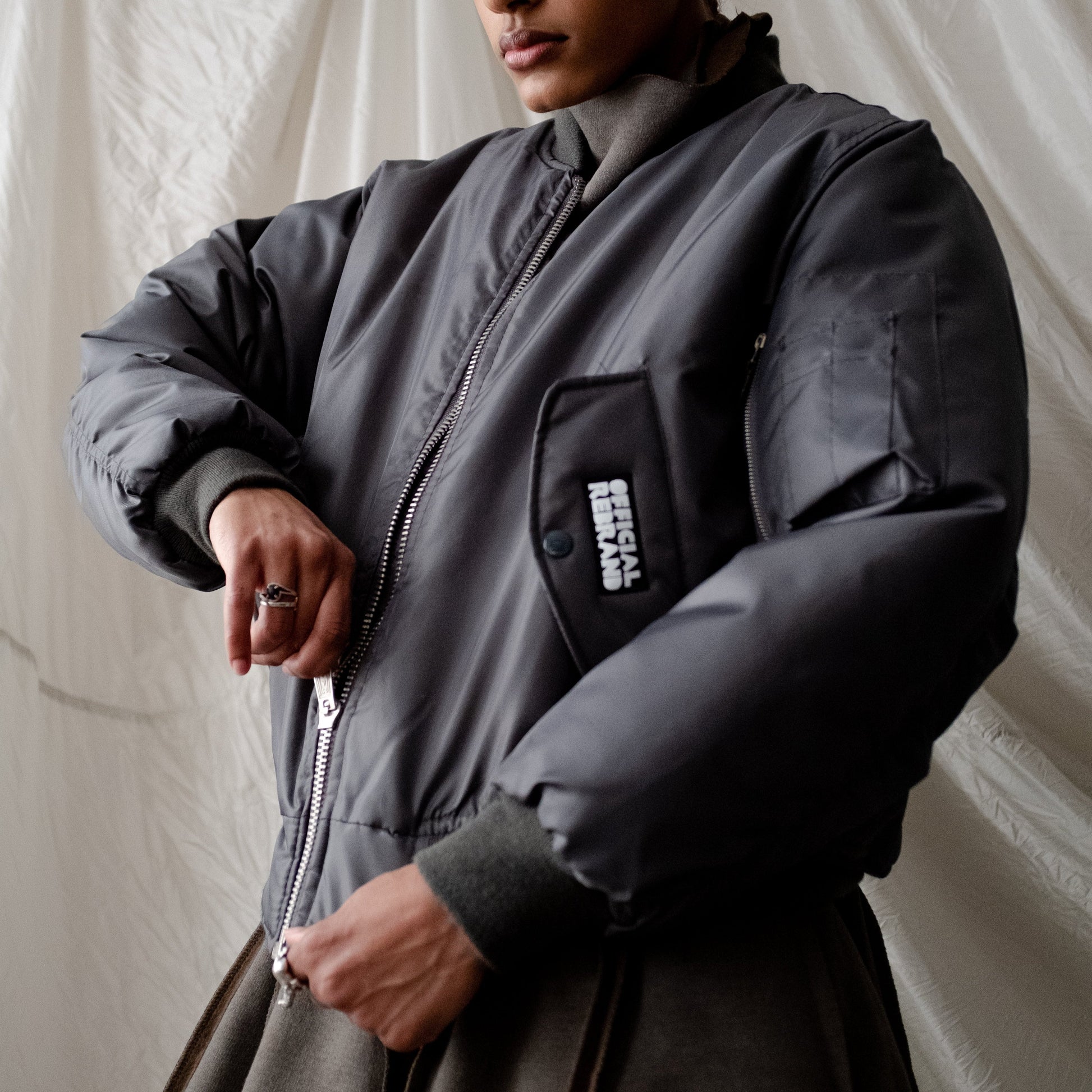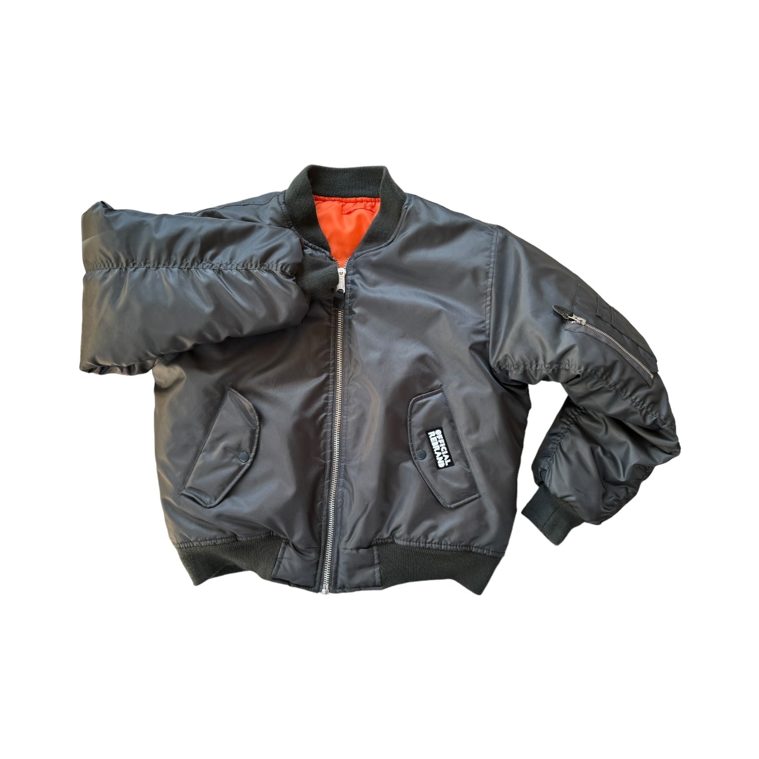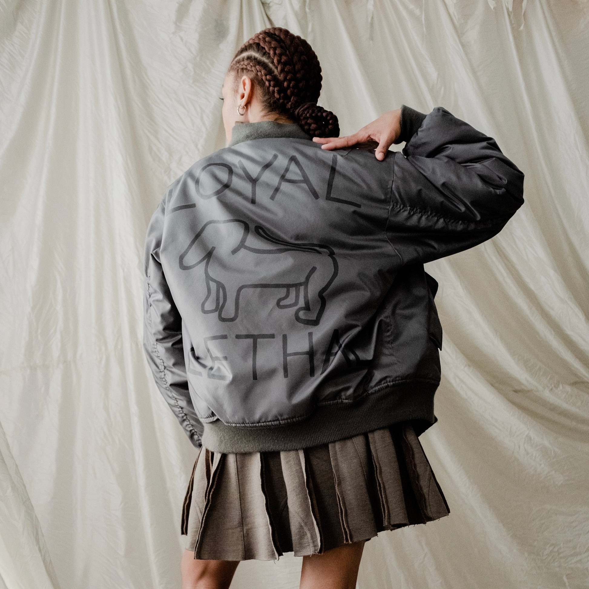 LOYAL LETHAL text surrounding a dachshund puppy silhouette hand-painted in black on gunmetal grey military-style flight jacket.