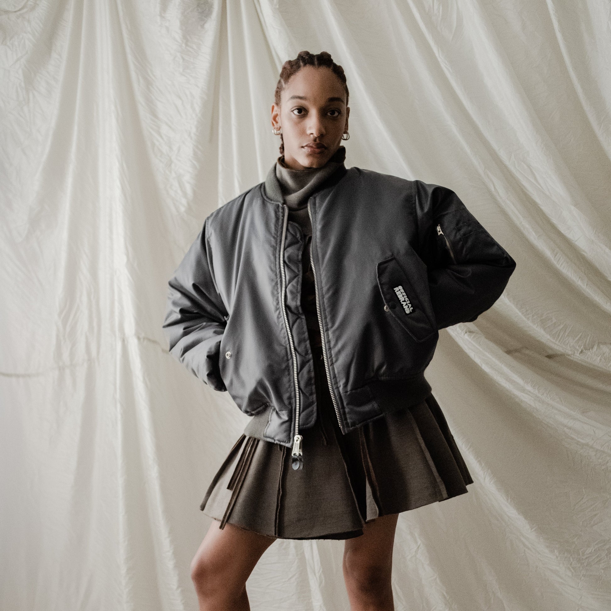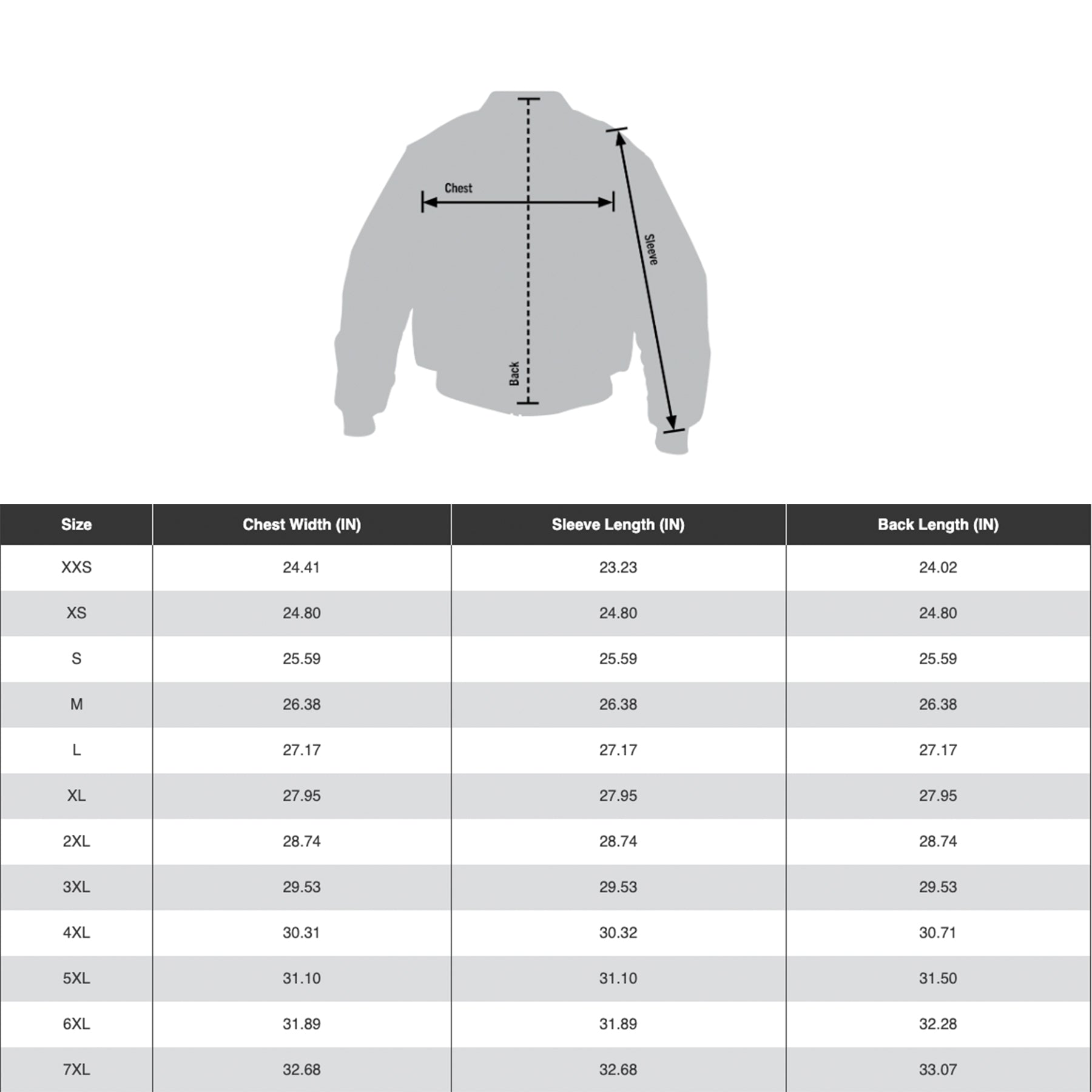 100% Nylon Water Repellent Outer Shell - Polyester Lining, Warm Poly Fiberfill Lining. Wide cut, ribbed knit collar, cuffs, and waistband. Brass double sided zipper with leather pull tabs. Outside utility pocket with zipper on left sleeve, two front pockets and two interior pockets.