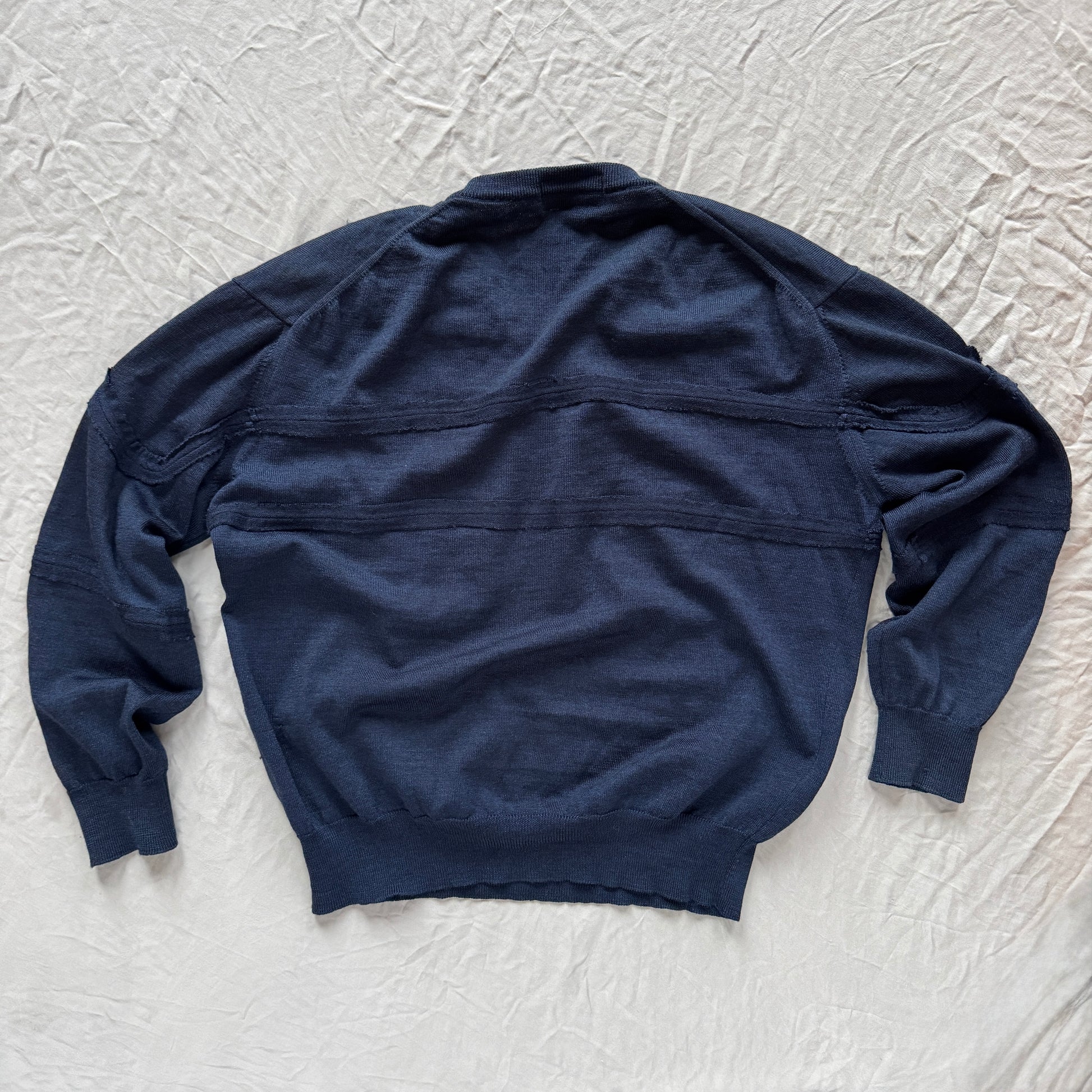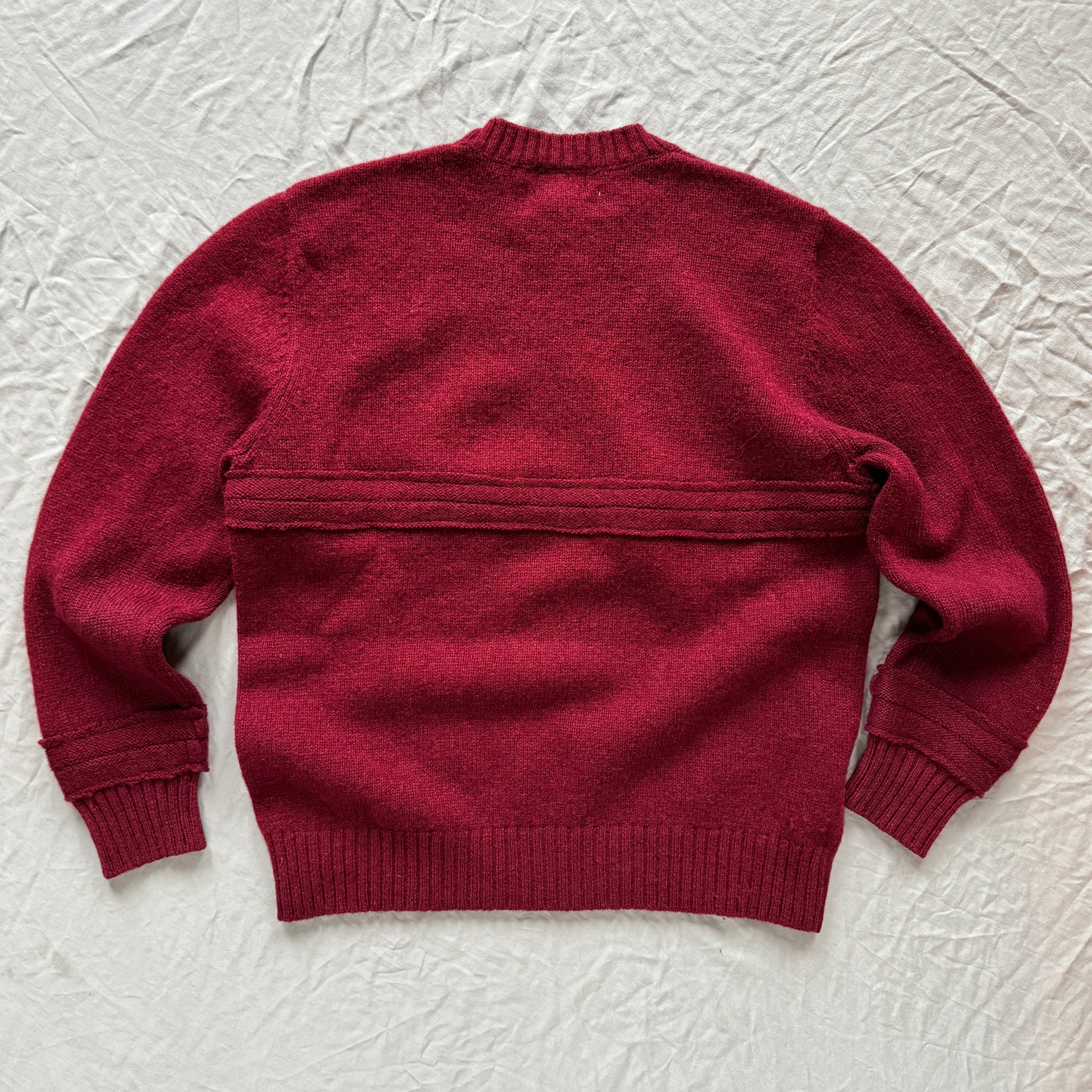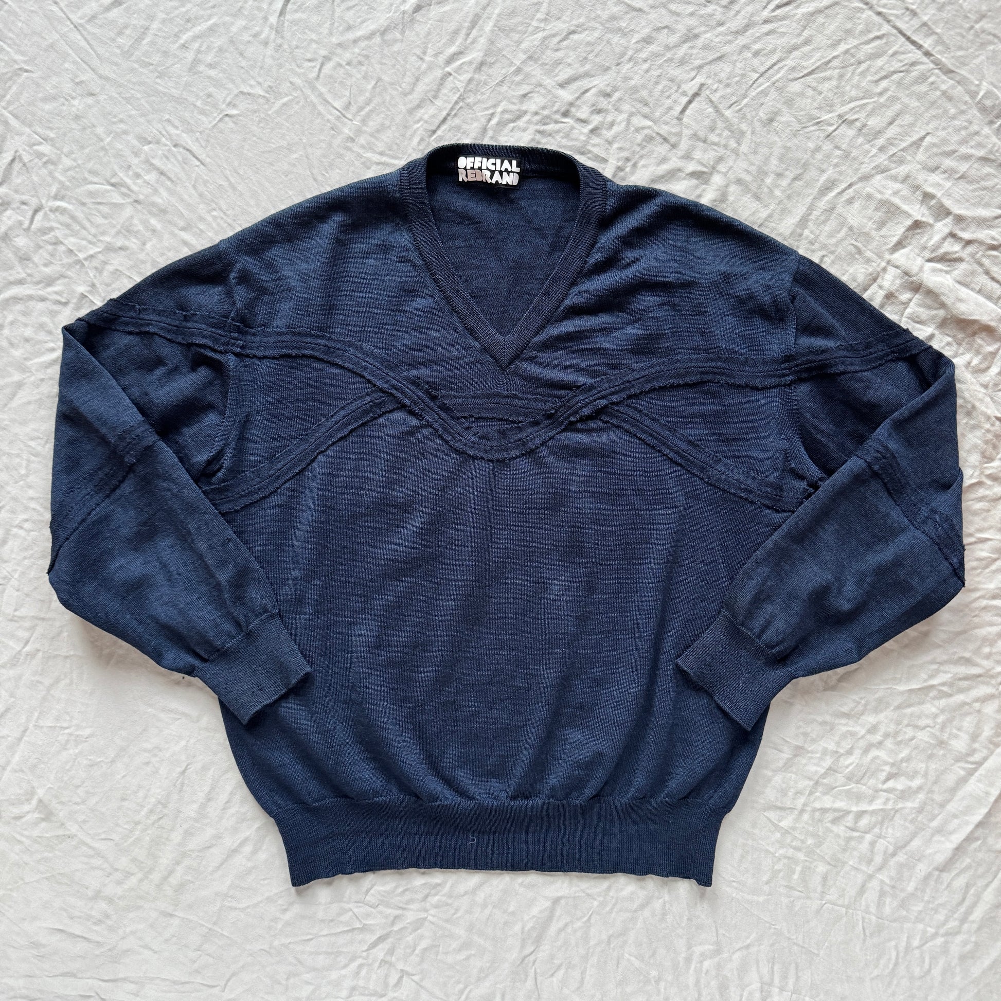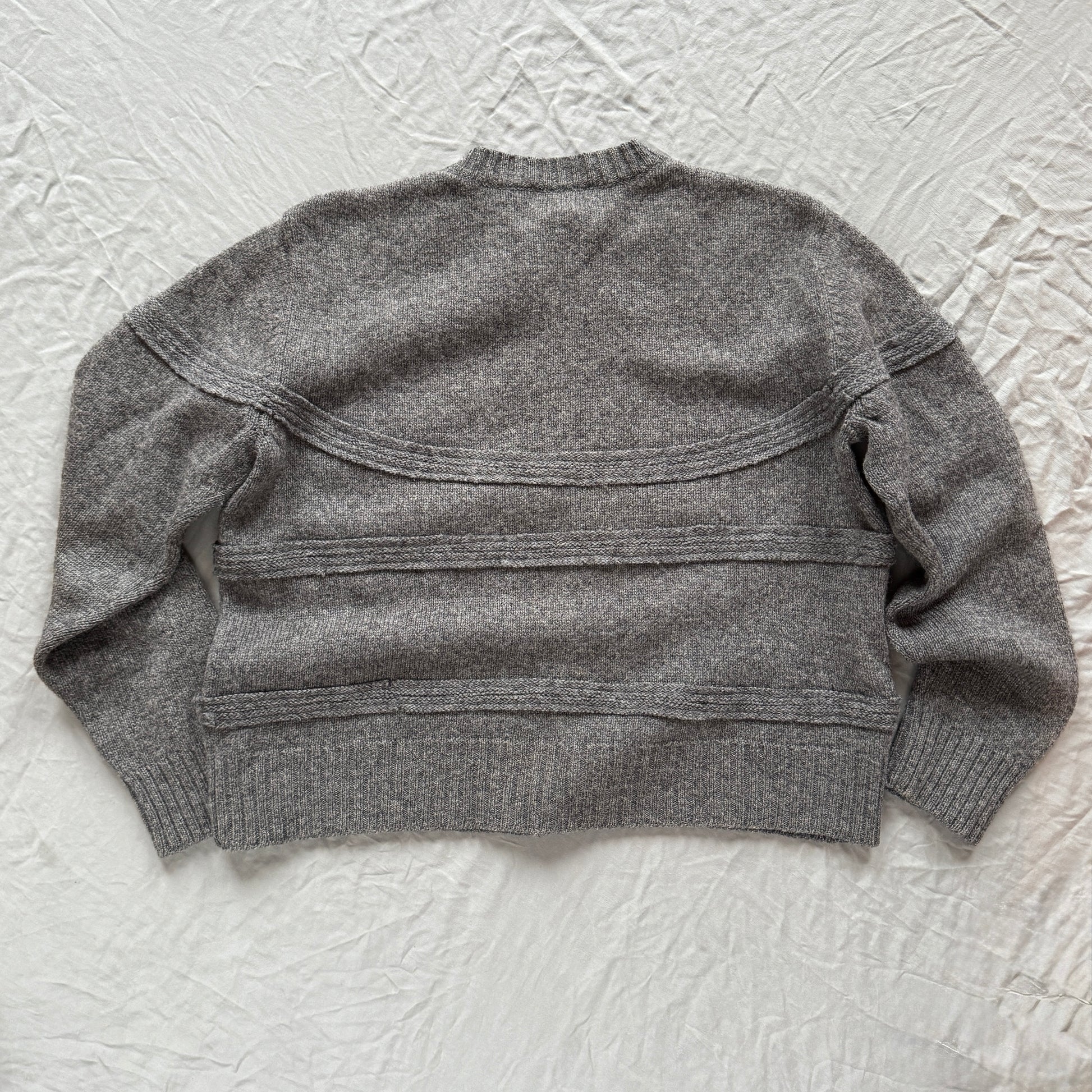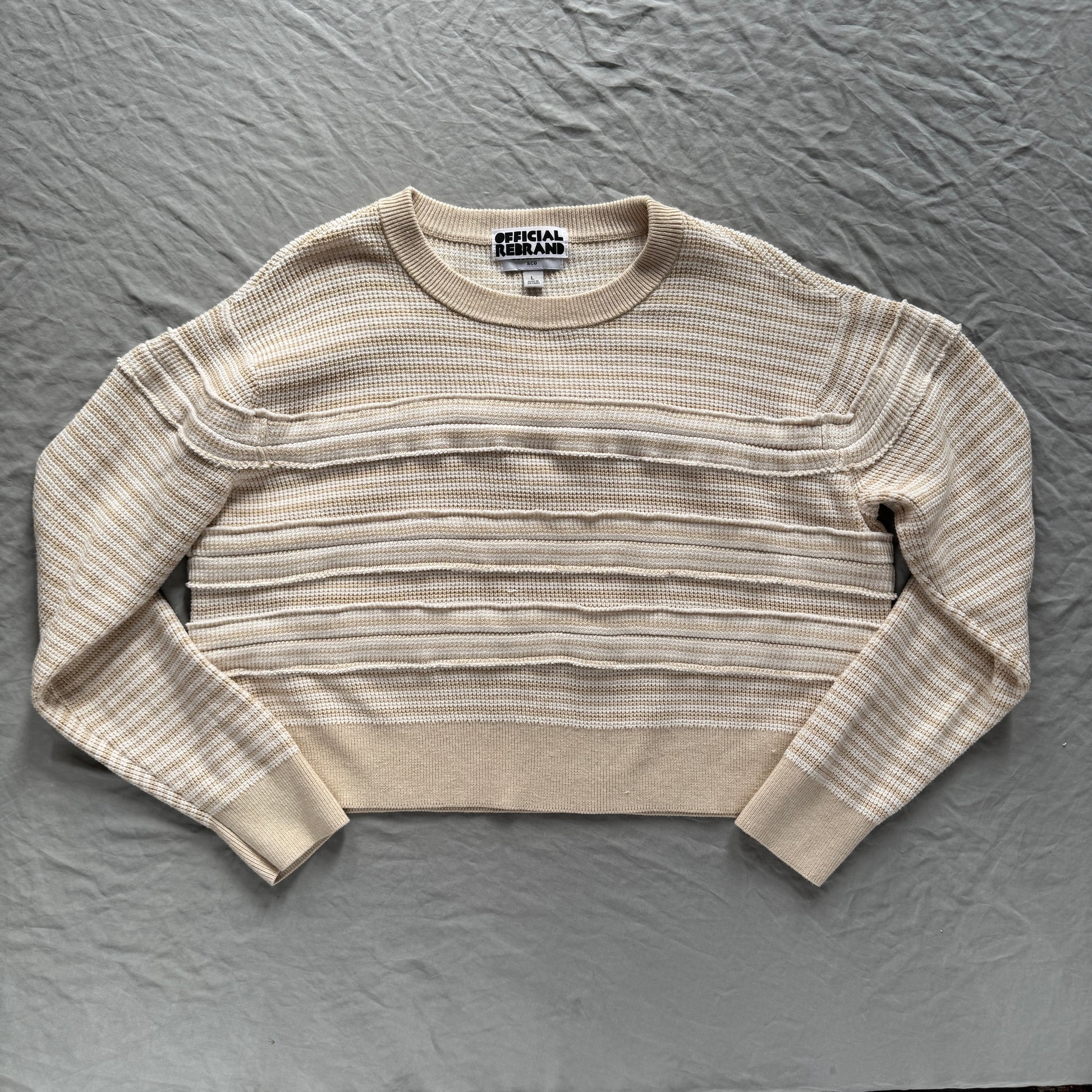 Reworked secondhand sweater with a boxy cropped fit and added wavy seams across the chest and shoulders. We helped manage excess garment "waste" by giving this piece a second chance at a new life.