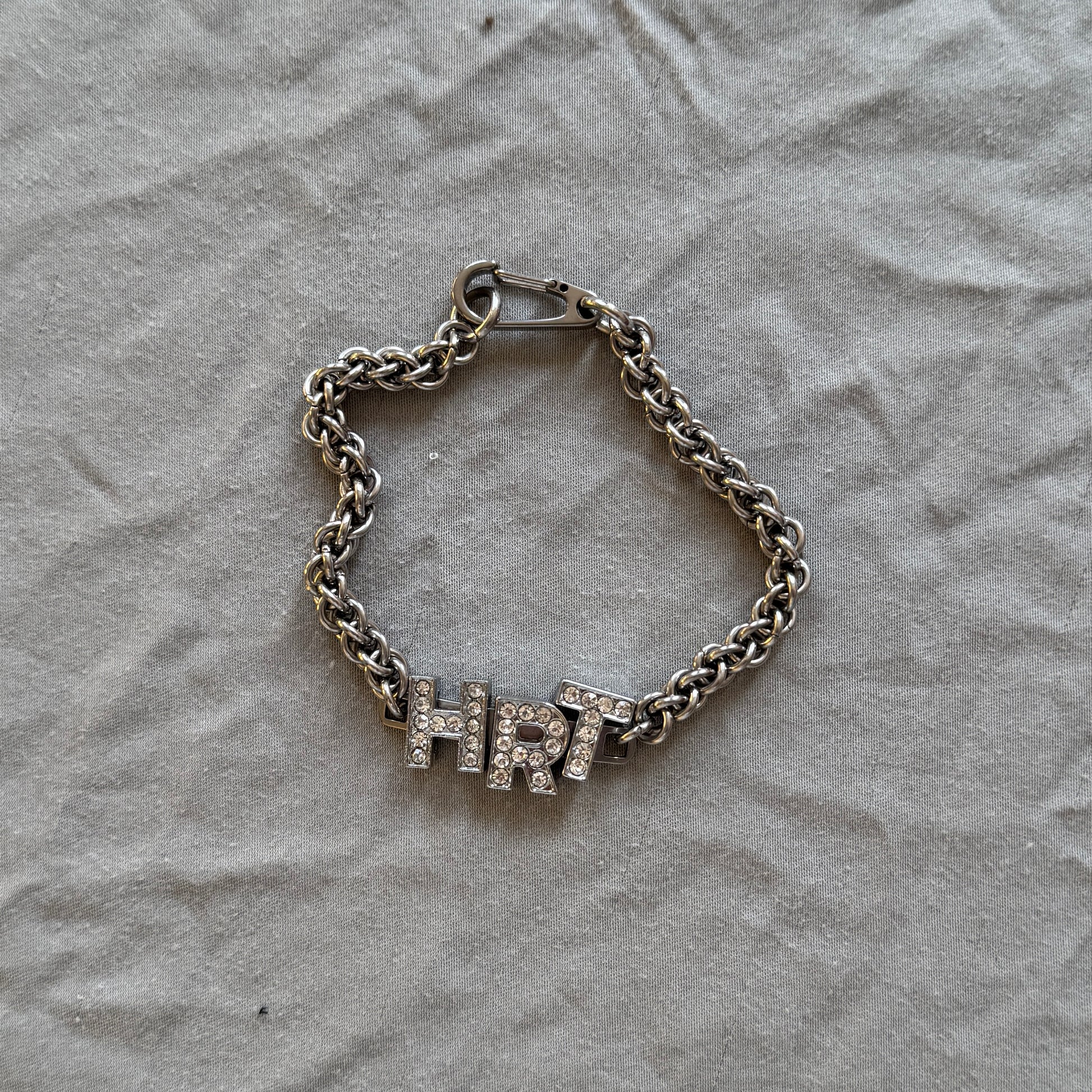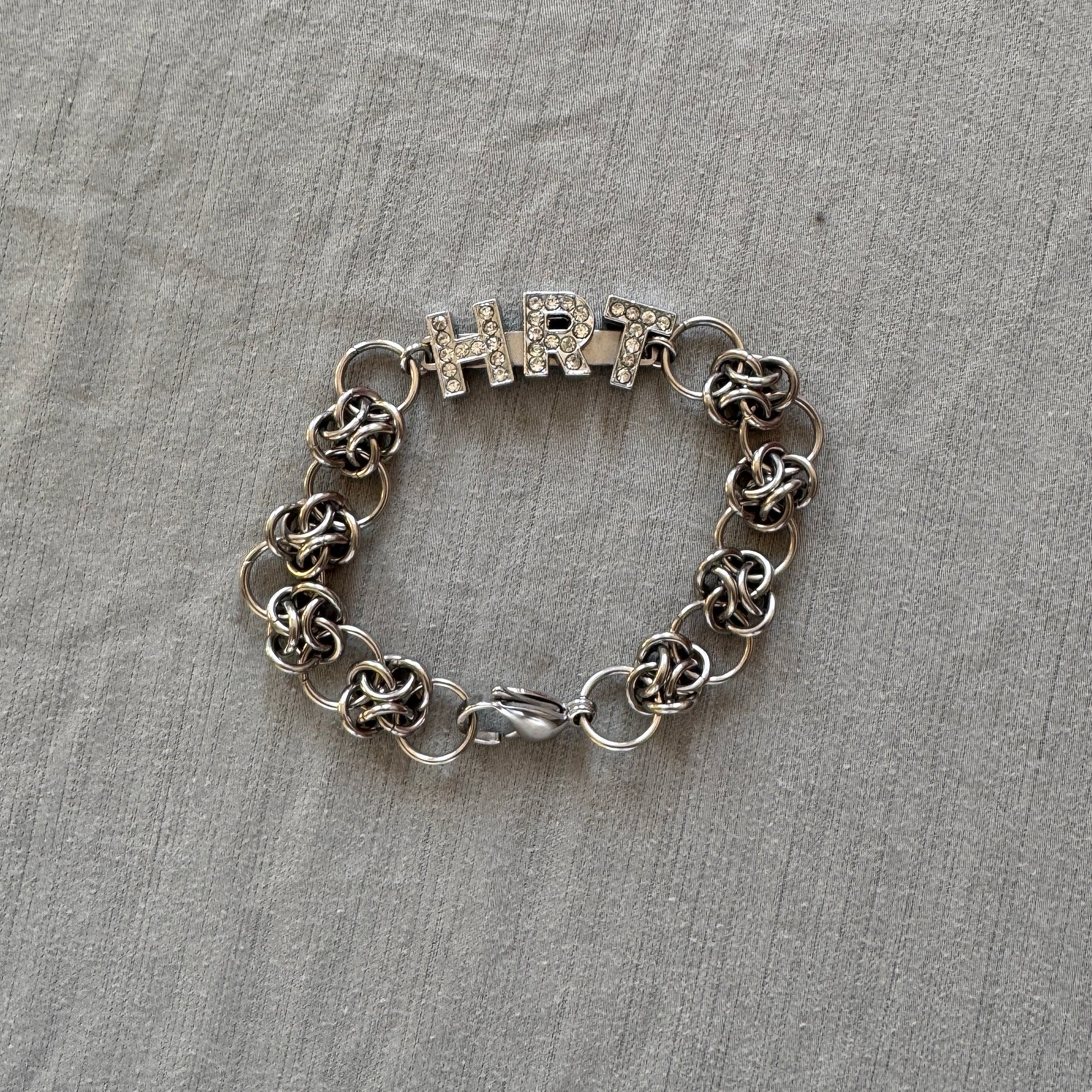 Bedazzled letter charms (alloy unknown) were purchased from a shuttering local bead store. Offered on a variety of hand-made chainmail links with adjustable closures.