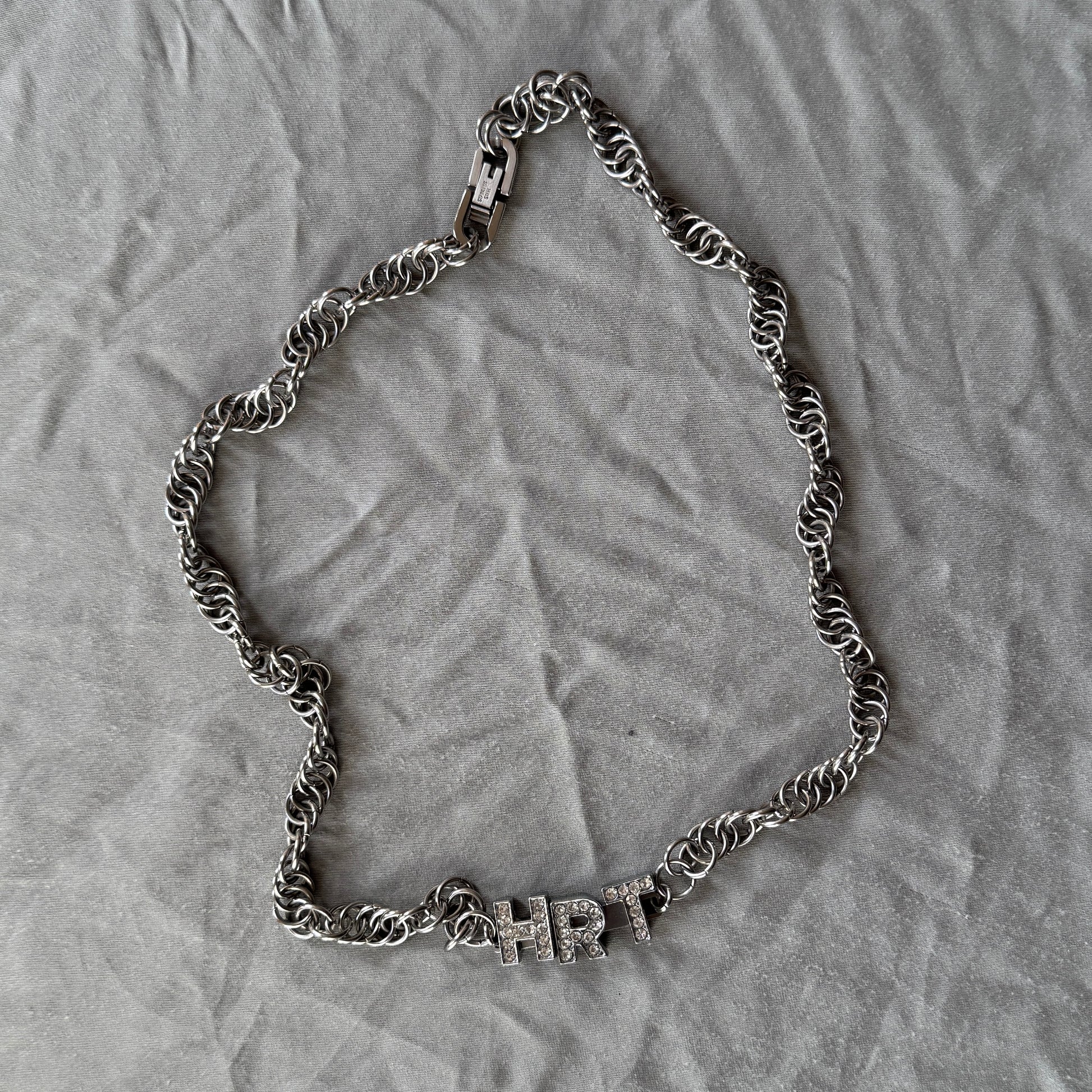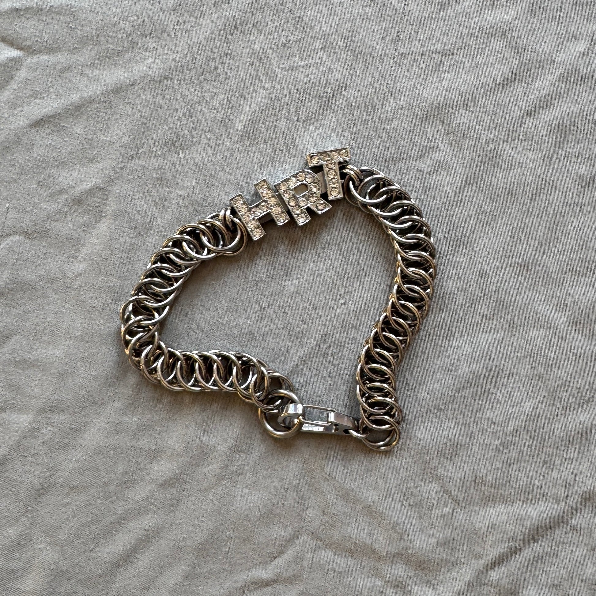 Handcrafted chain-link HRT (hormone replacement therapy) bracelets and necklaces. HRT can be a life-giving treatment for some queer people. Original concept developed by MI Leggett during his early days of HRT during the 2020 lockdown, chainmail bracelets hand-made by Virgin Chains.