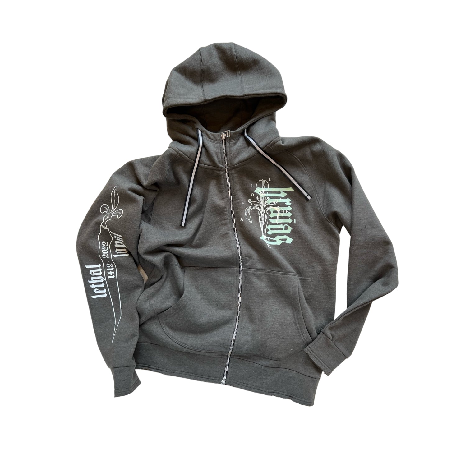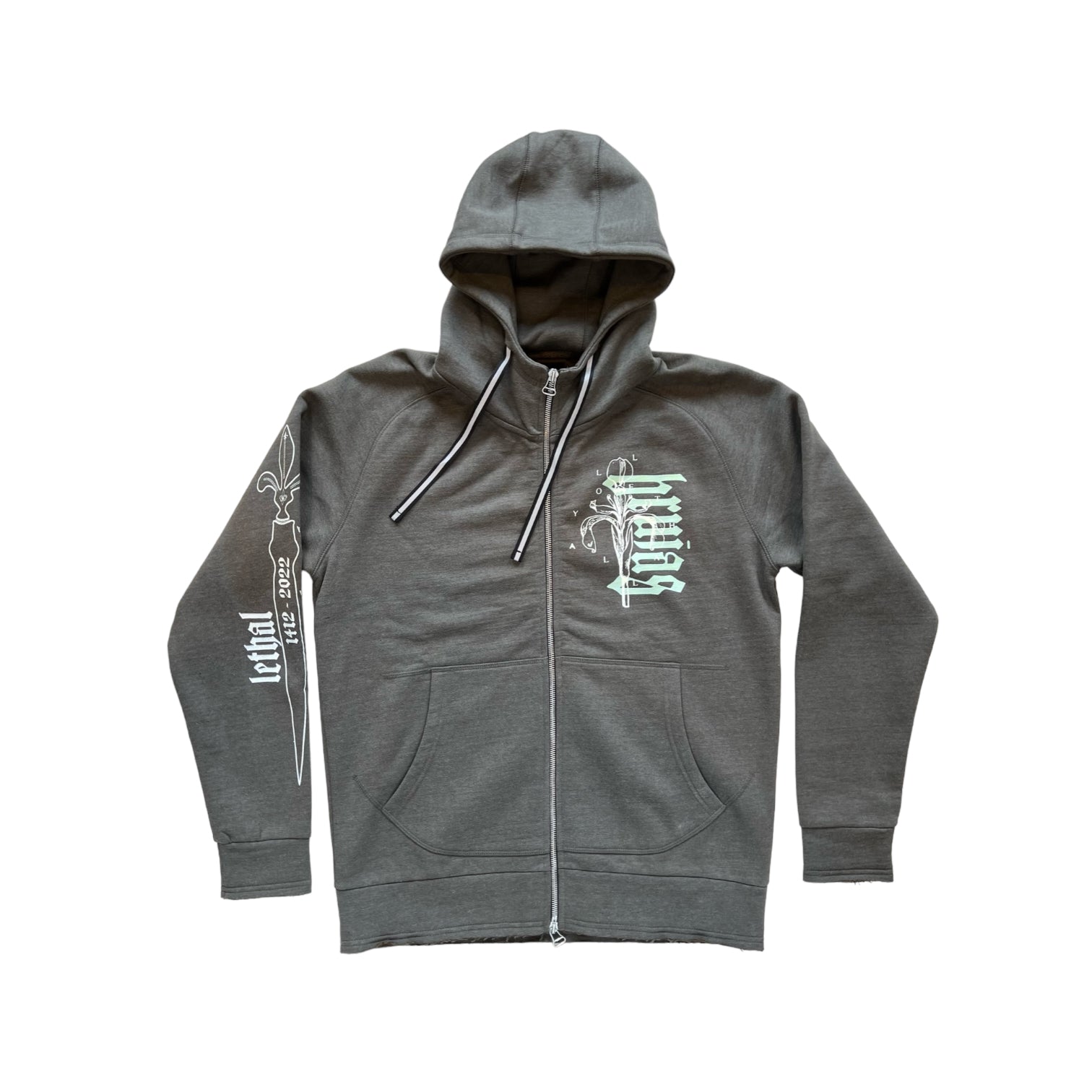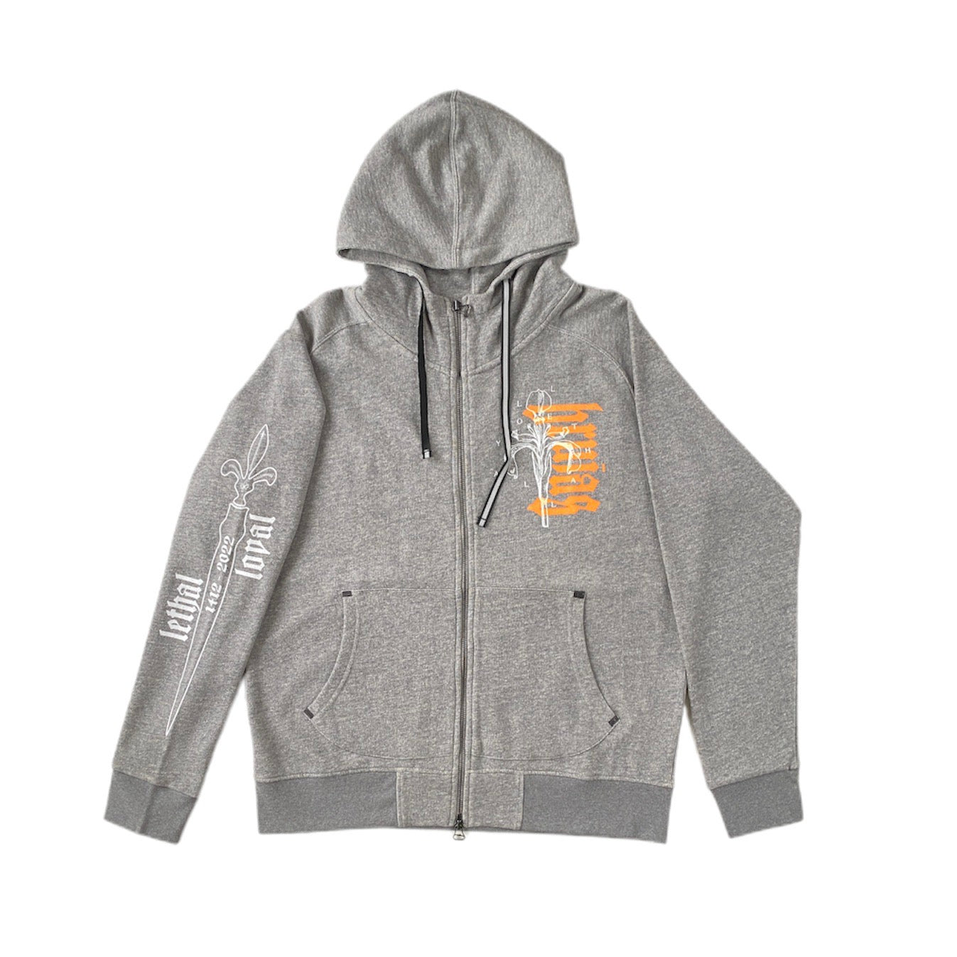 Printed in Brooklyn, NY on heather grey deadstock jackets from luxury sportswear brand.
