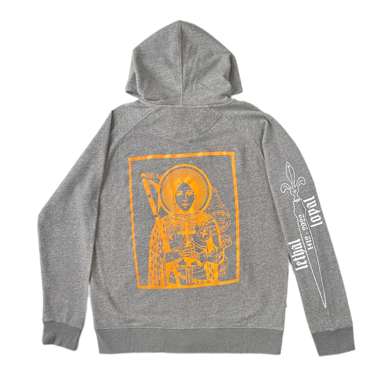 Part of the Official Rebrand x BRUJAS Joan of Arc collection. Loyal Lilly over the BRUJAS logo on the front, "loyal/lethal" sword print on sleeve, and Joan of Arc icon graphic on the back screen-printed in orange or seafoam.