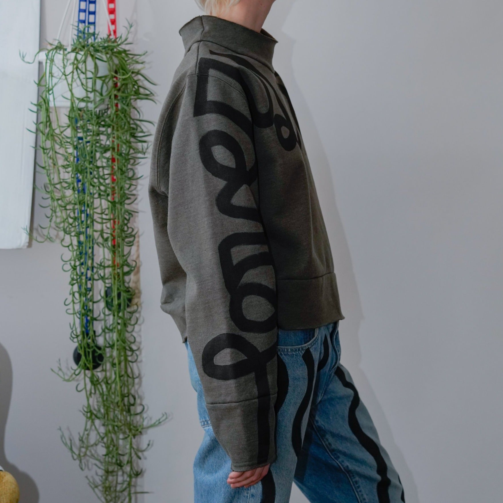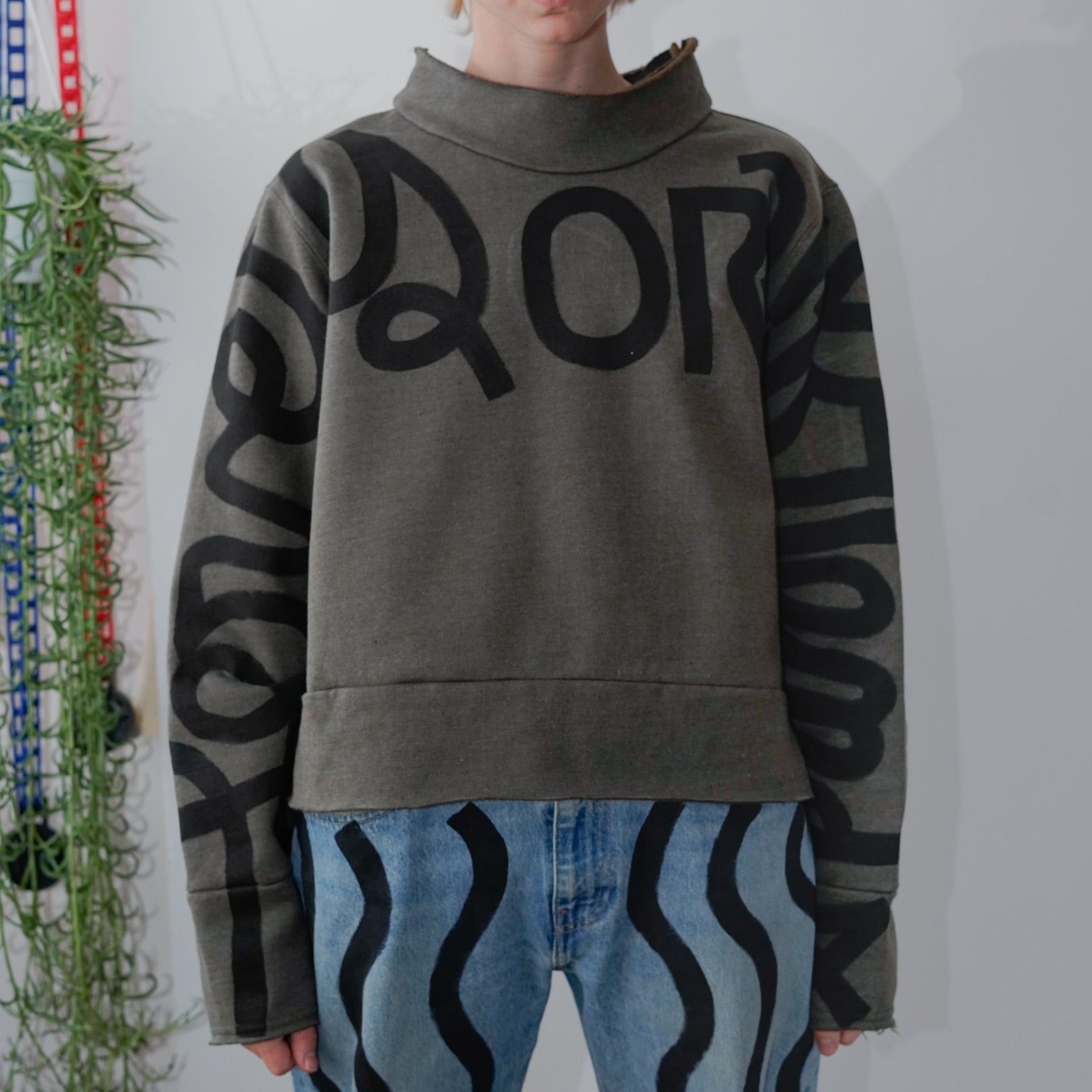 Hand-painted lovers OR?! friends cursive text on luxury sportswear deadstock sweatshirt made from soft fleece, 50% cotton 50% polyester. Thick lines of black fabric paint on a heather olive body that's been cropped into a new silhouette. Includes a discrete zipper side pocket. Painted on a made-to-order basis so there is no excess stock. Please allow up to one week for creation.