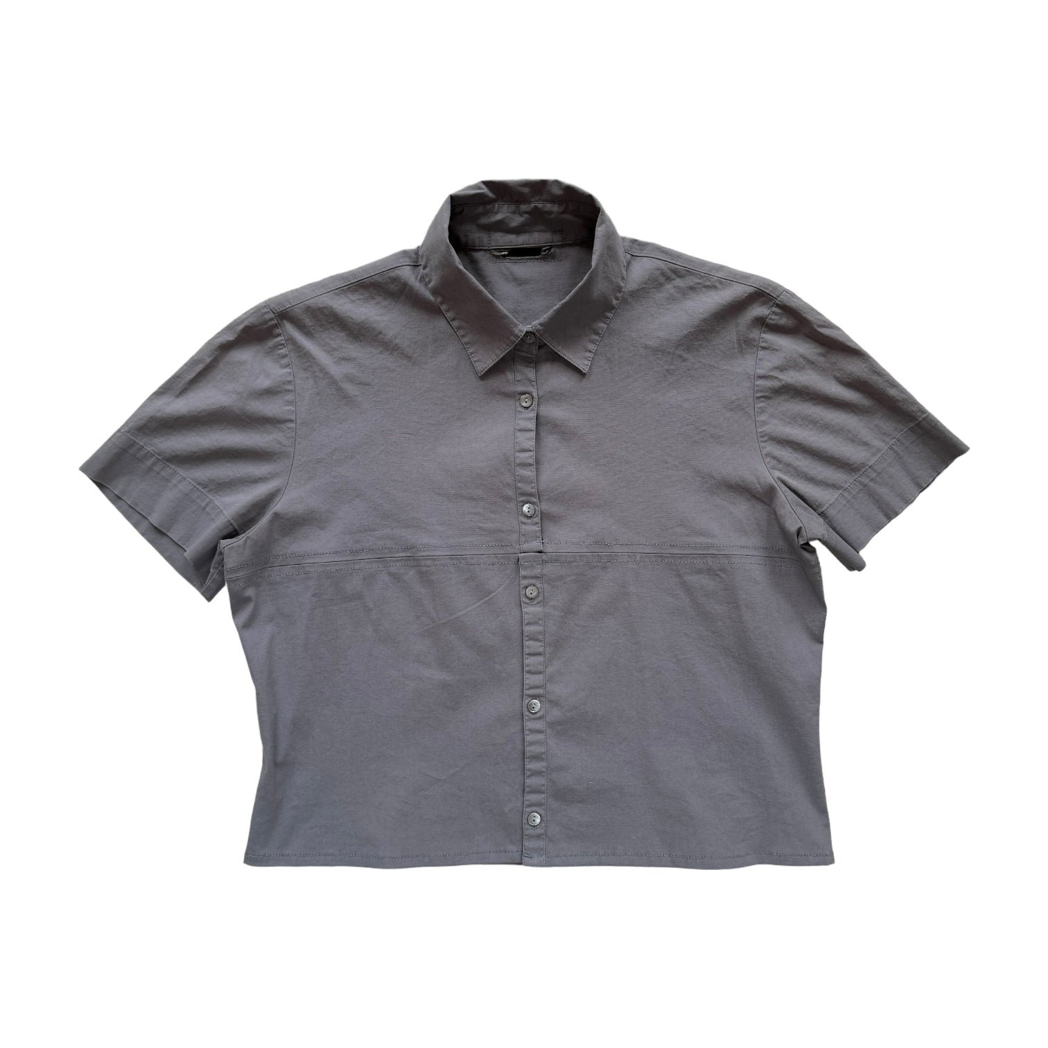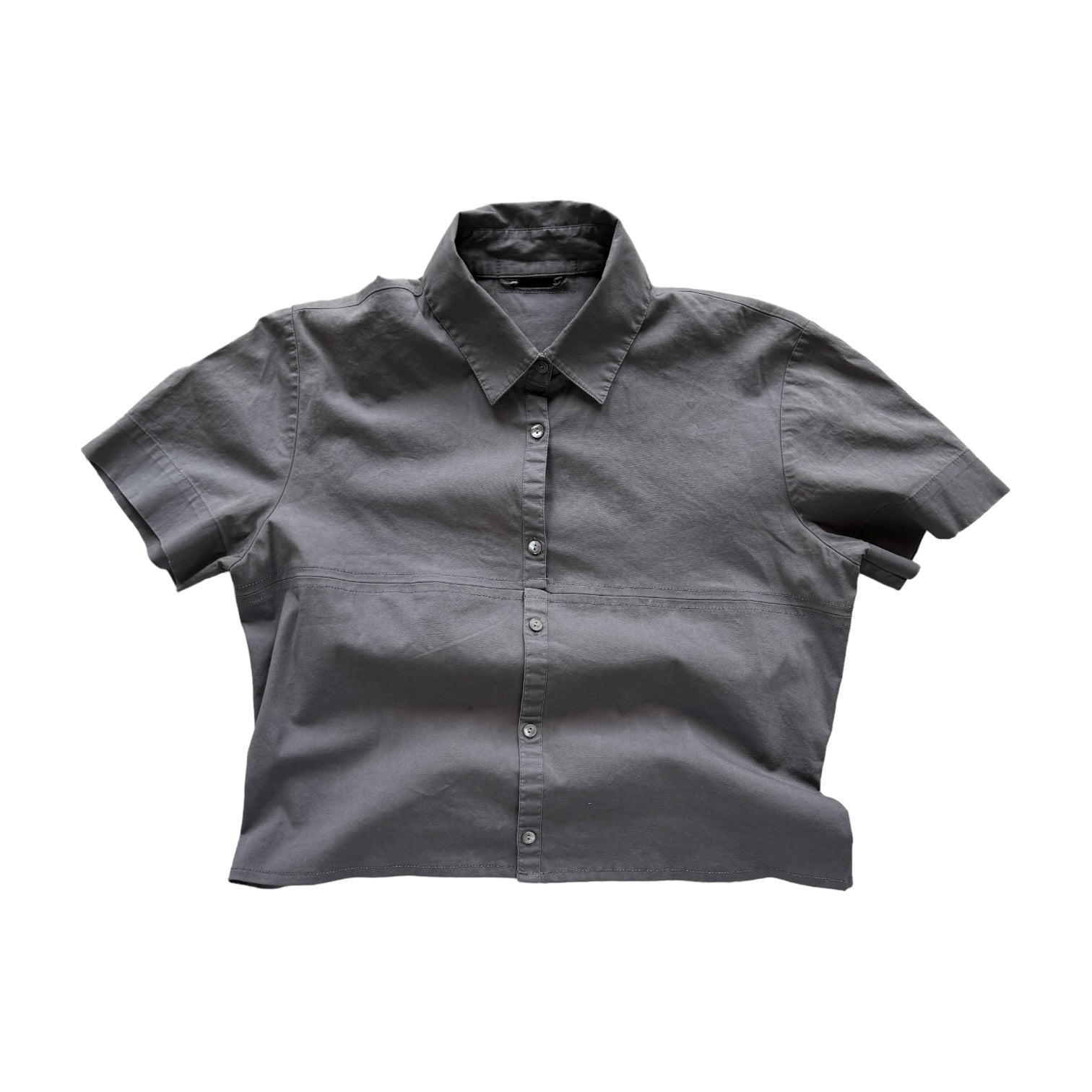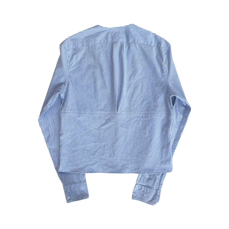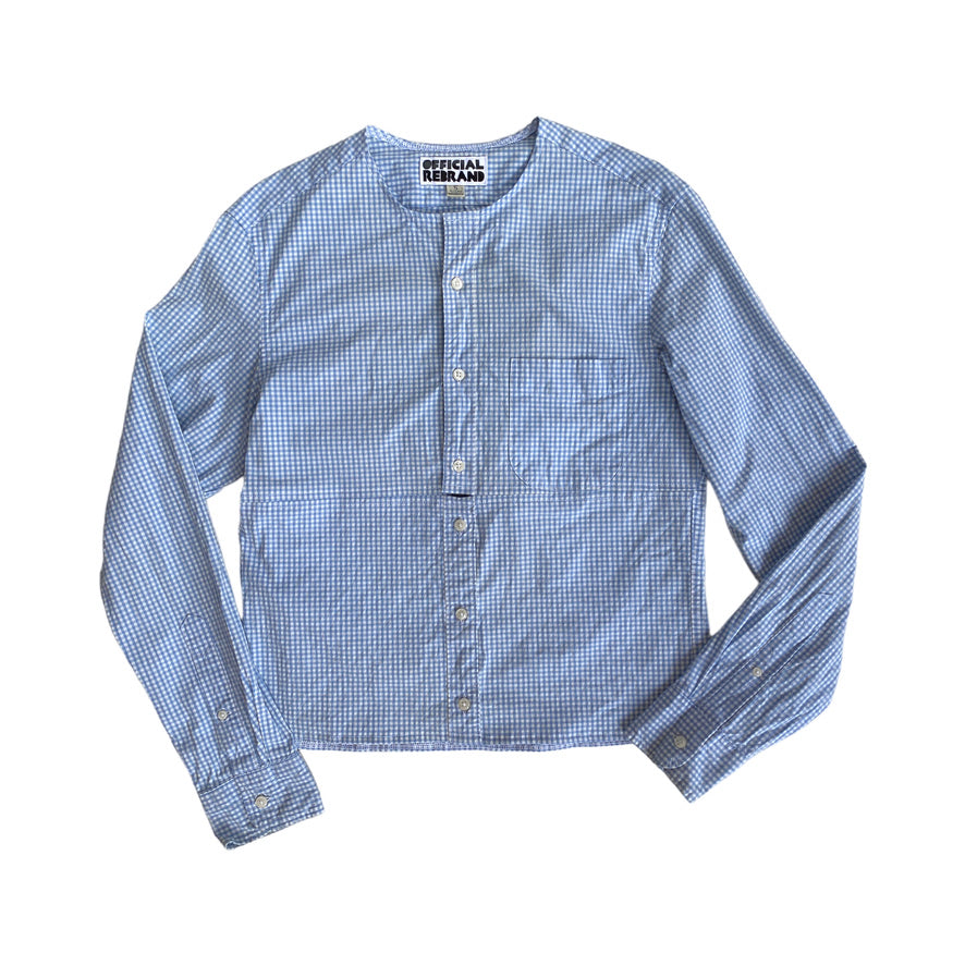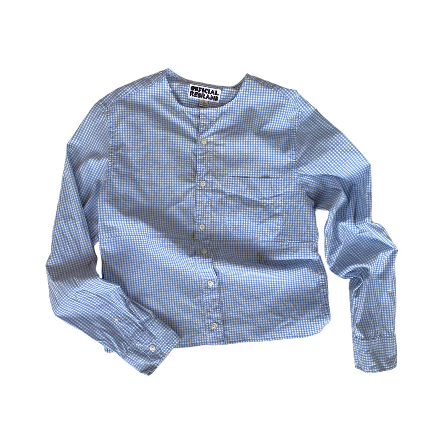 Gingham collarless: marked size S short: shoulder to shoulder 17.5 / chest 38 / highest point shoulder to hem 22 / shoulder to cuff 24. Features a front pocket and a unique removed collar, original garment constructed in Madagascar, rebranded in Queens, NY 11385.