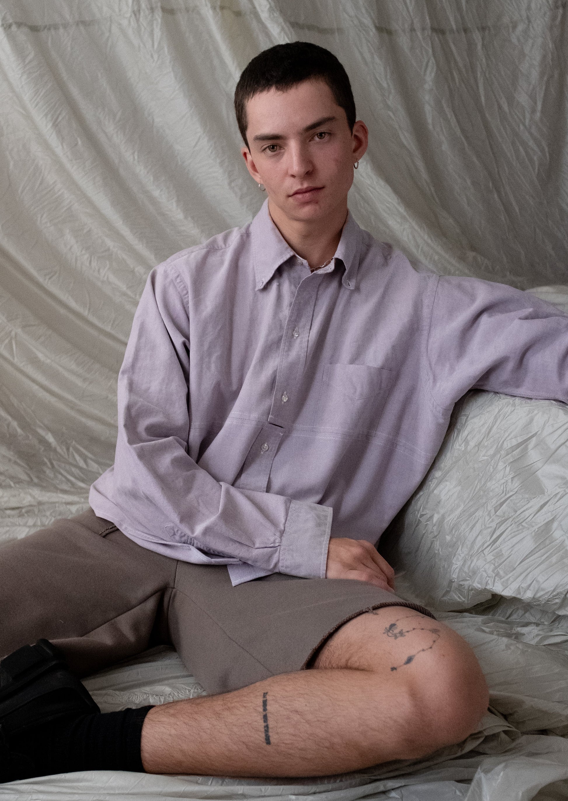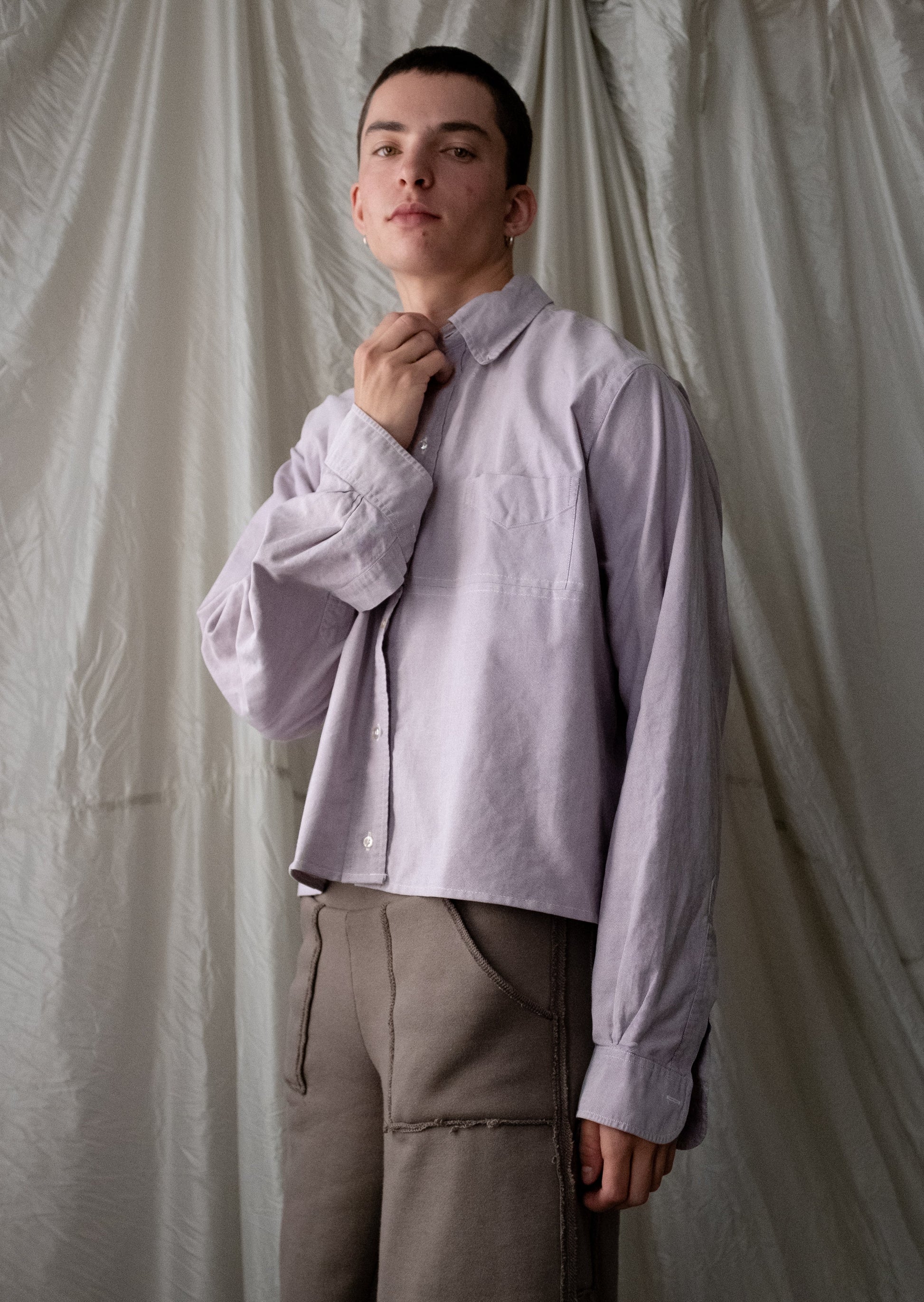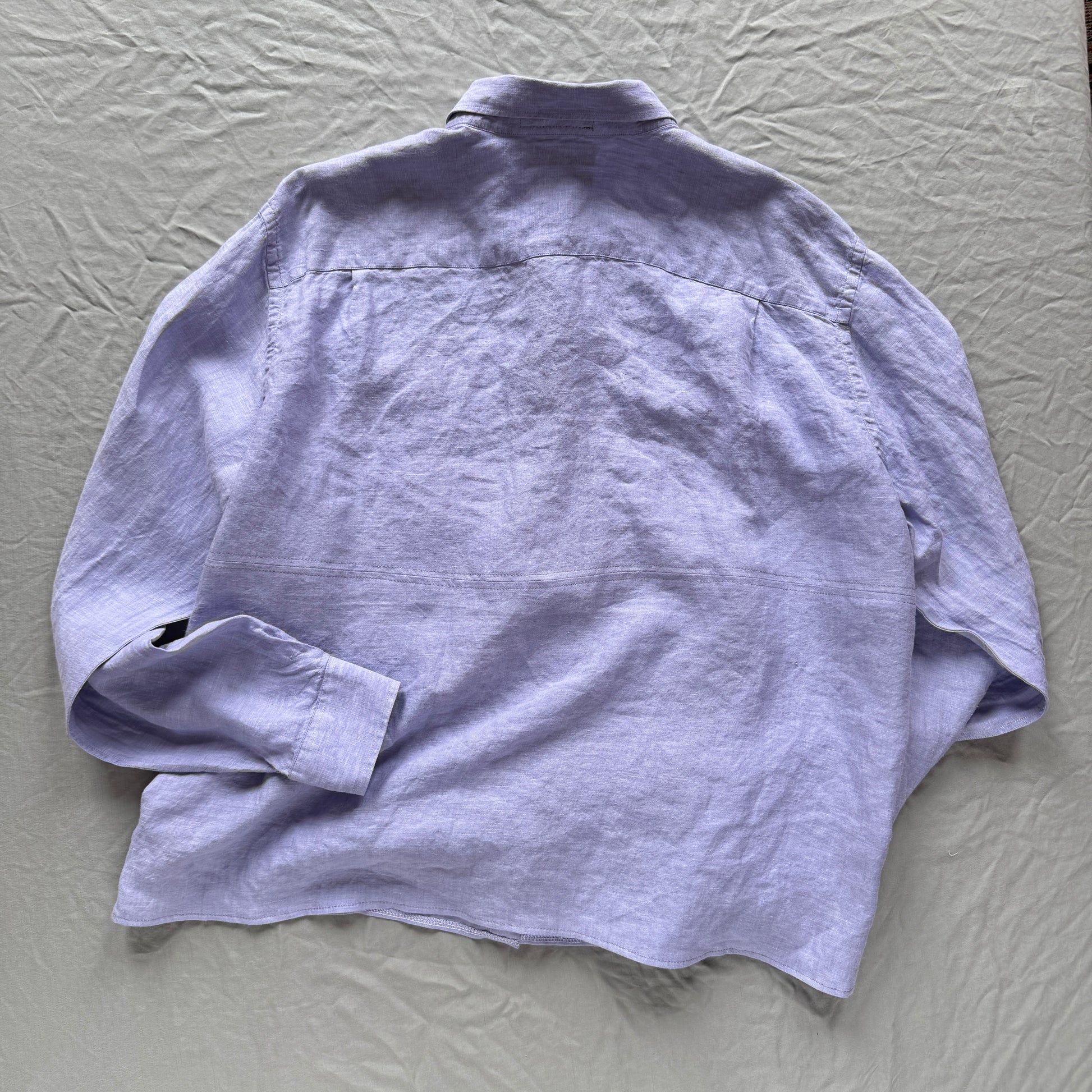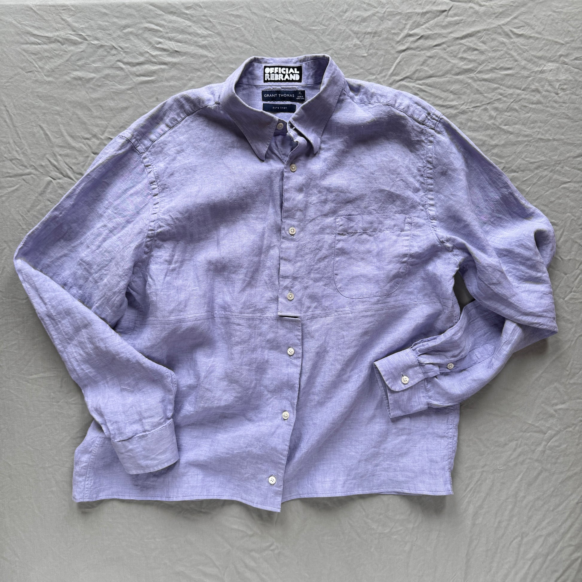 lavender linen: light purple linen shirt. Marked size "XL", made in hong kong, pure linen. shoulder to shoulder 21 / chest 52 / highest point shoulder to hem 27.5 / shoulder to cuff 27.