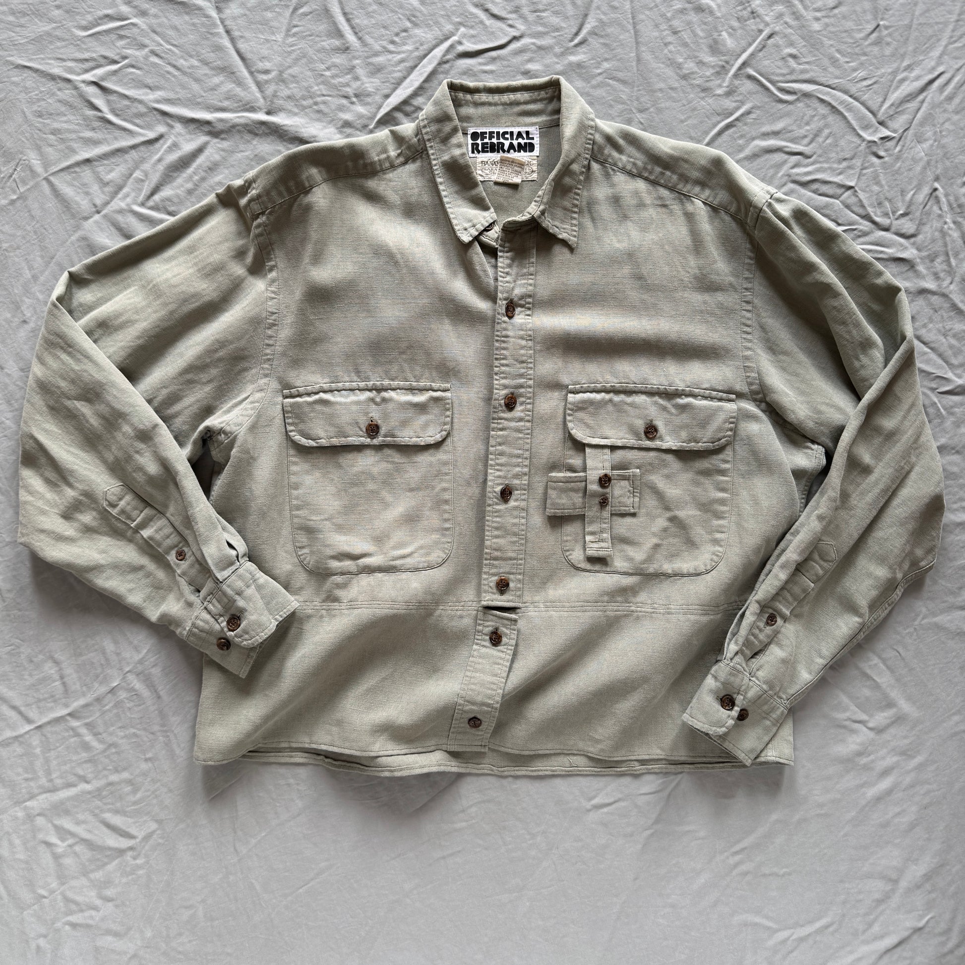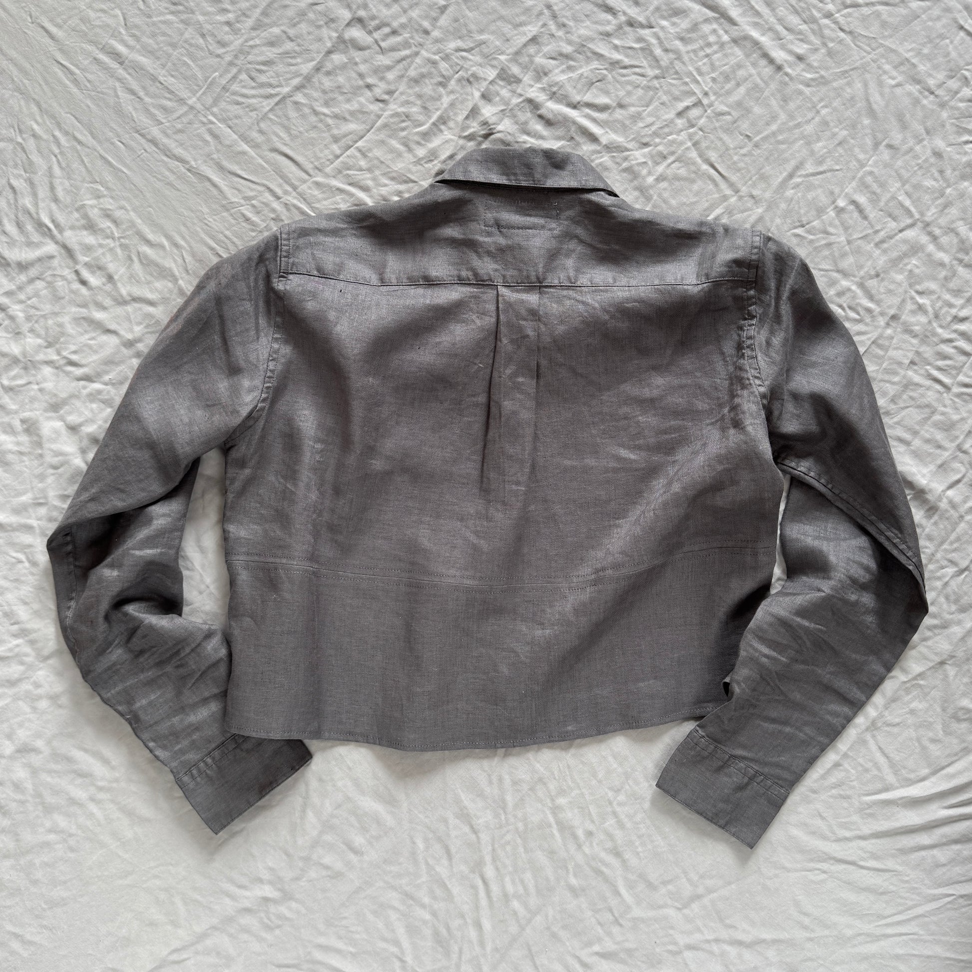 sage linen: Marked size "S", made in Hong Kong, 55% linen 45% cotton. Originally constructed by Banana Republic. shoulder to shoulder 19 / chest 48 / highest point shoulder to hem 24 / shoulder to cuff 23.5.