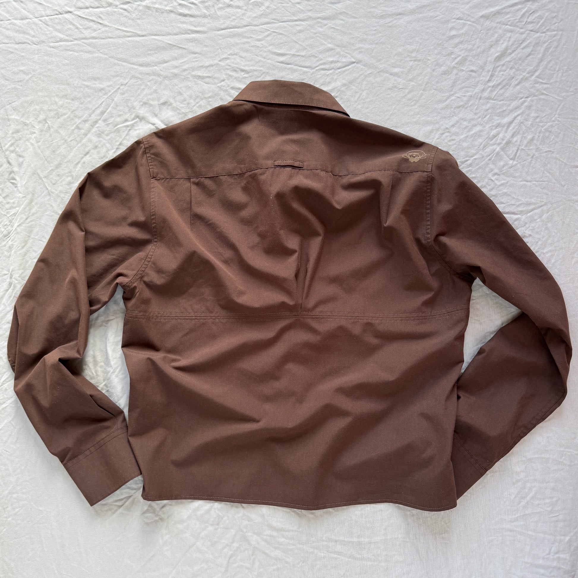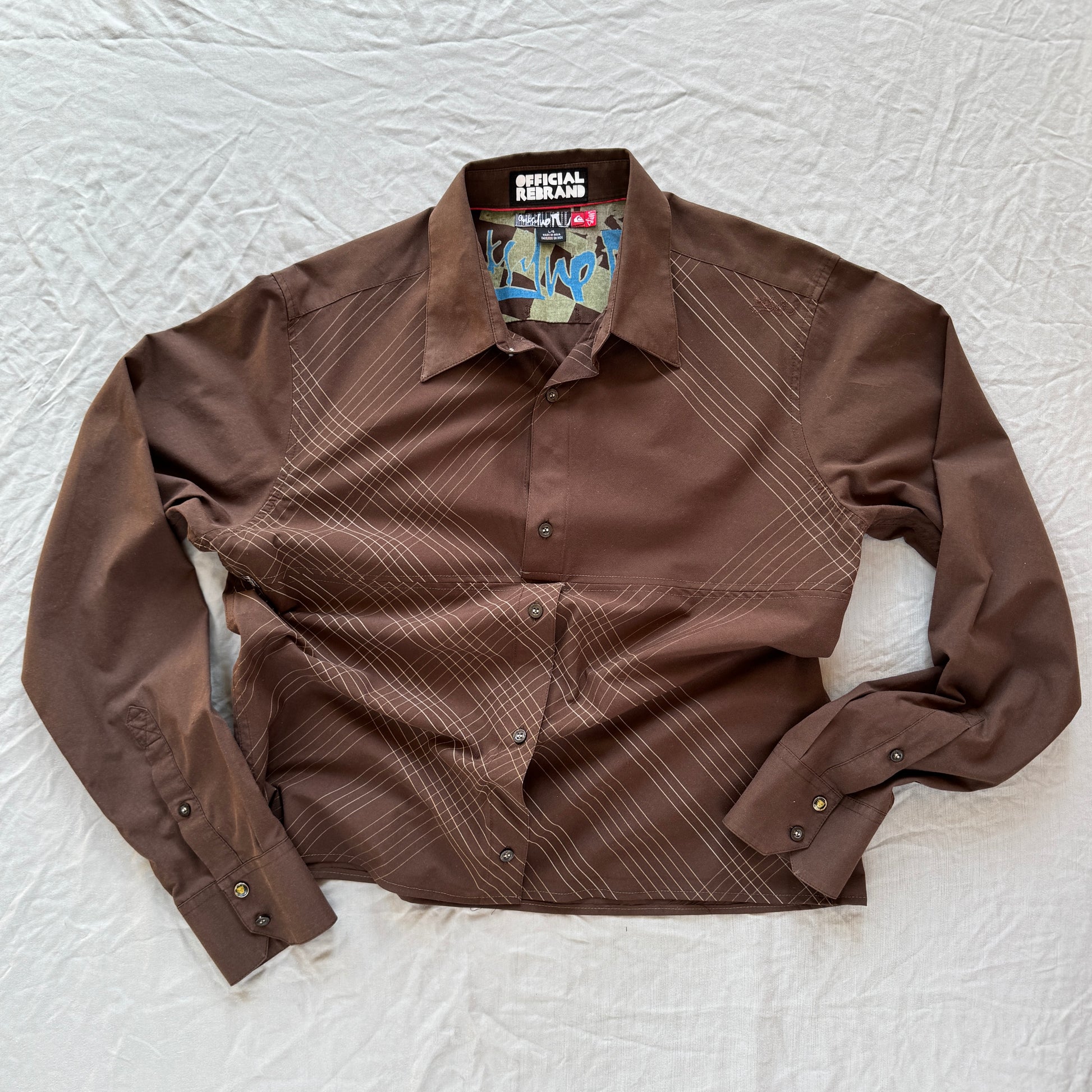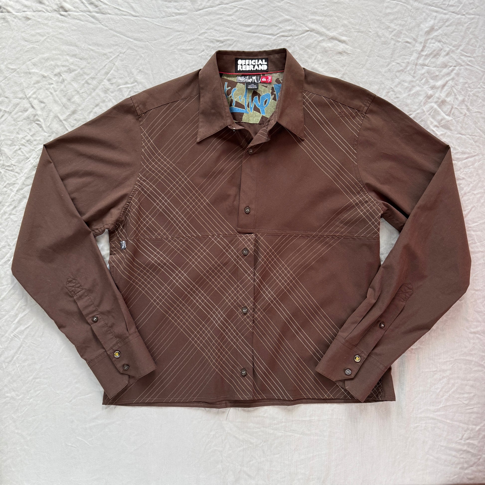 brown quicksilver: chocolate brown button down with thin tan check pattern. Originally made by Quicksilver, marked size "L", made in India, 65% polyester + 35% cotton. shoulder to shoulder 18.5 / chest 46 / highest point shoulder to hem 26 / shoulder to cuff 27.