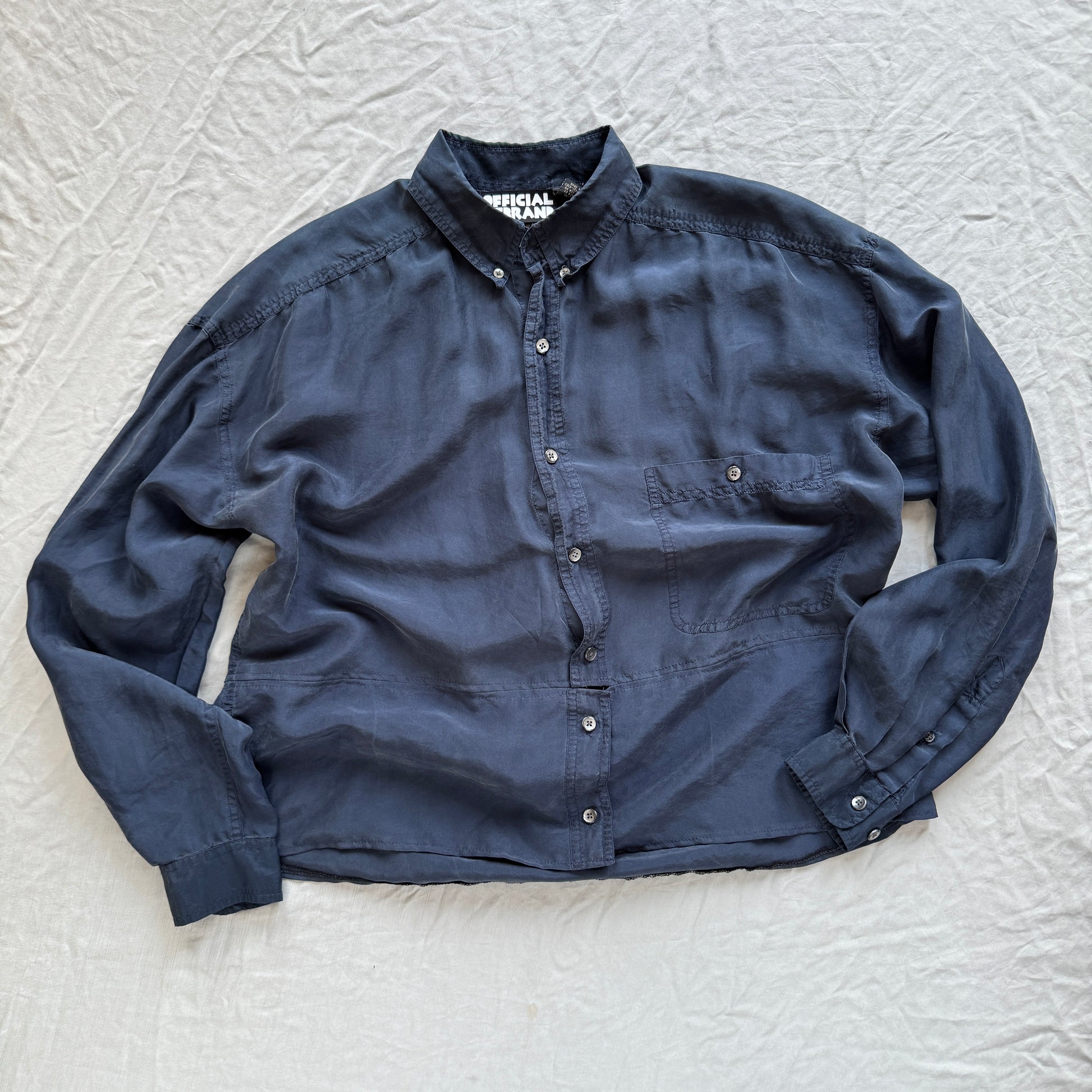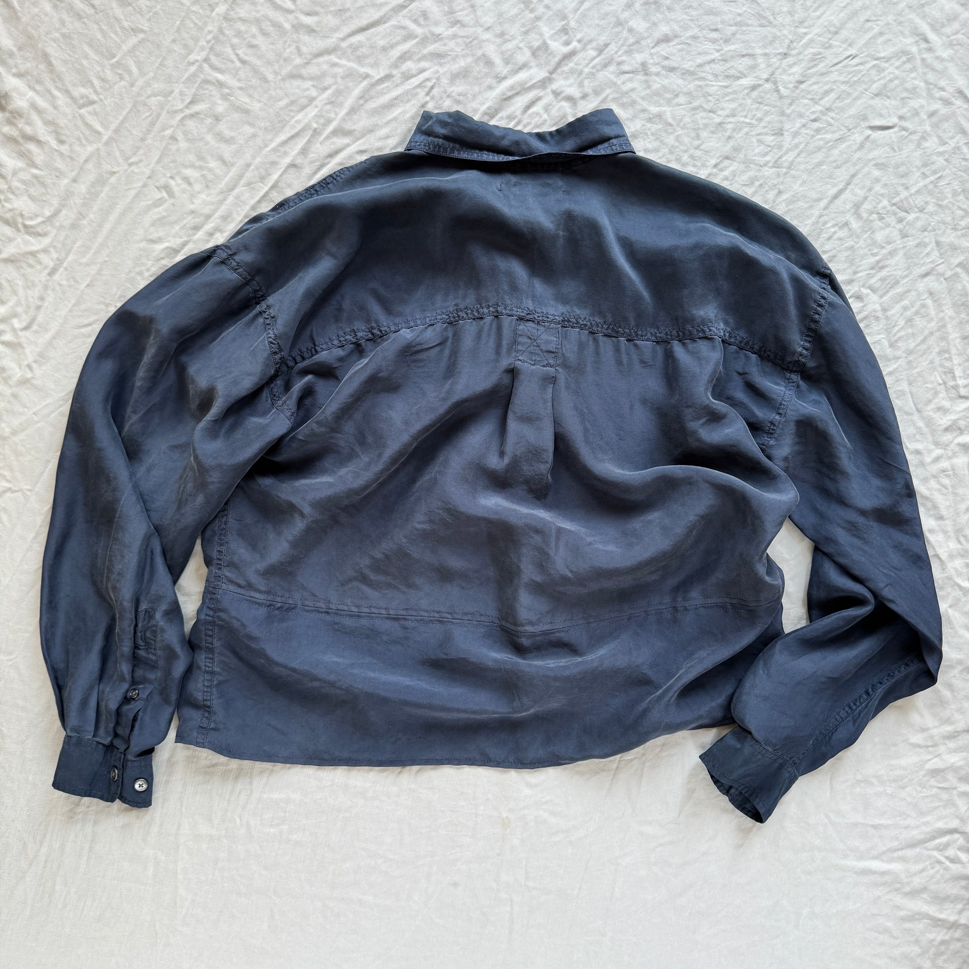 Navy silk: originally marked made in China and marked size M. 100% silk. Hand wash + line dry recommended. shoulder to shoulder 22 / chest 48 / highest point shoulder to cuff 22 / highest point shoulder to hem 24.5