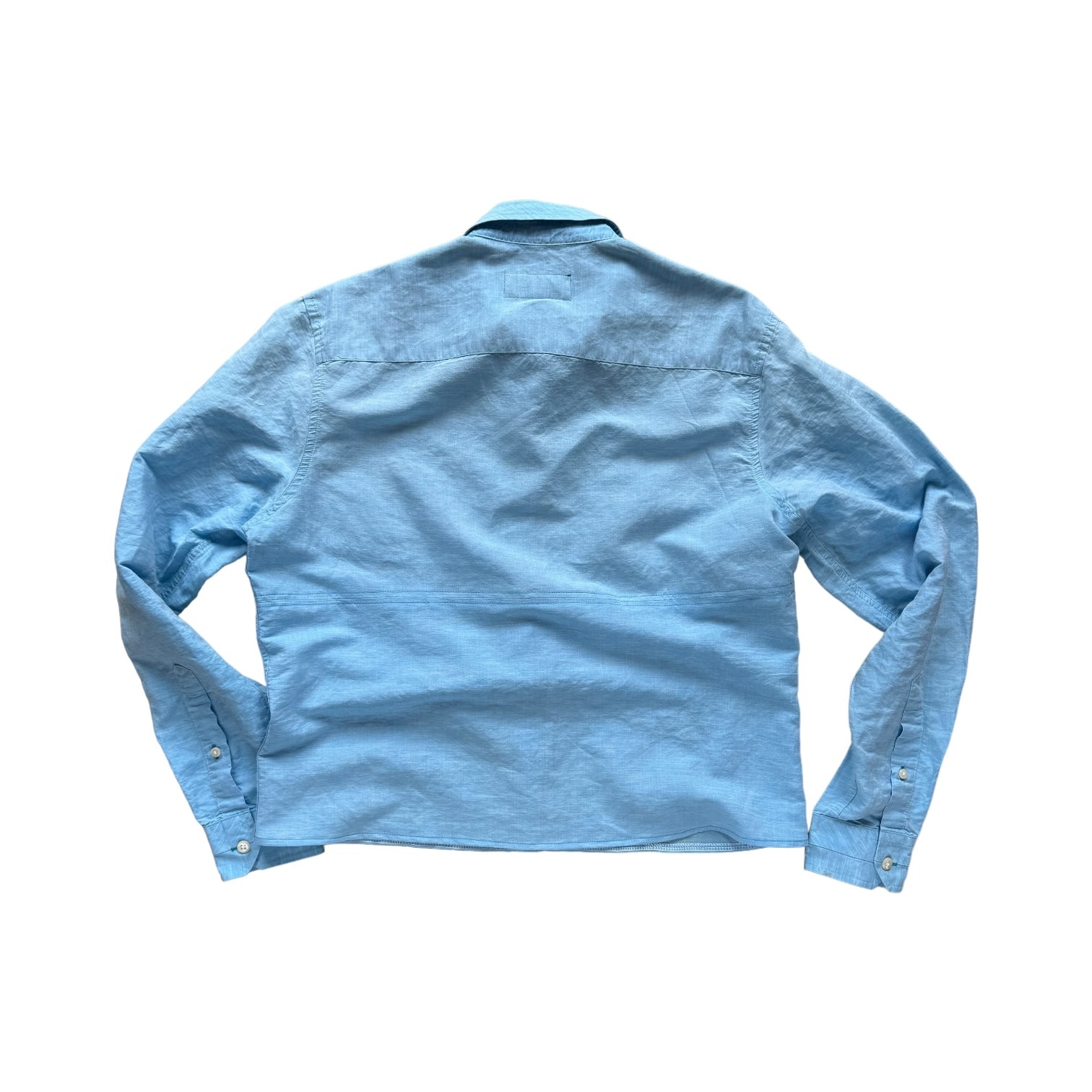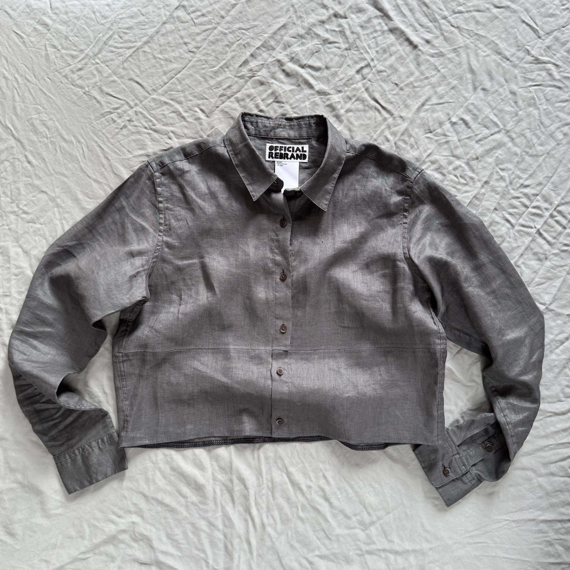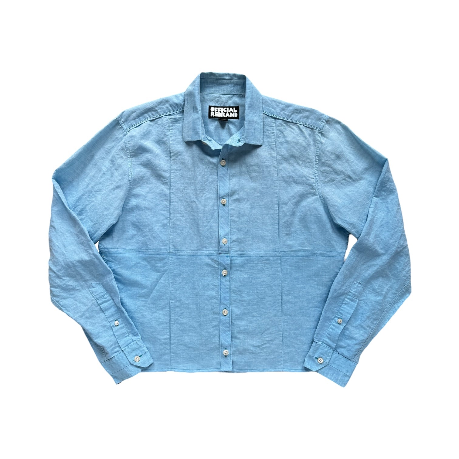 Linen sky: shoulder to shoulder 17.5 / chest 42 / highest point shoulder to hem 23 / sleeve 24. Shirt features a soft 67% linen/33% cotton blend. Originally marked size S, made in Vietnam.