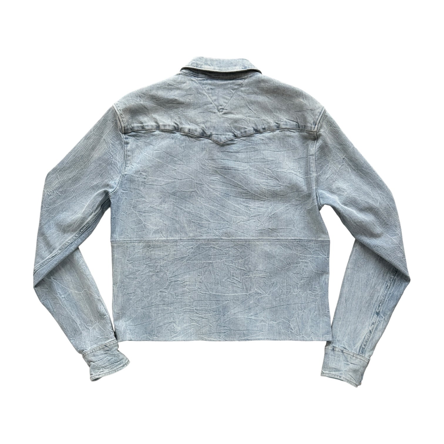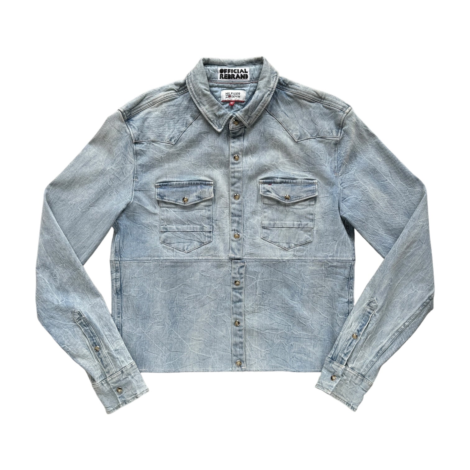 Tommy Hilfiger denim long sleeve: shoulder to shoulder 18 / chest 40 / highest point shoulder to hem 24 / shoulder to cuff 26.5. Original garment made in Bangladesh and marked size M. Features two front pockets, thick denim fabric, tortoiseshell snap closures, and western shoulder stitching.