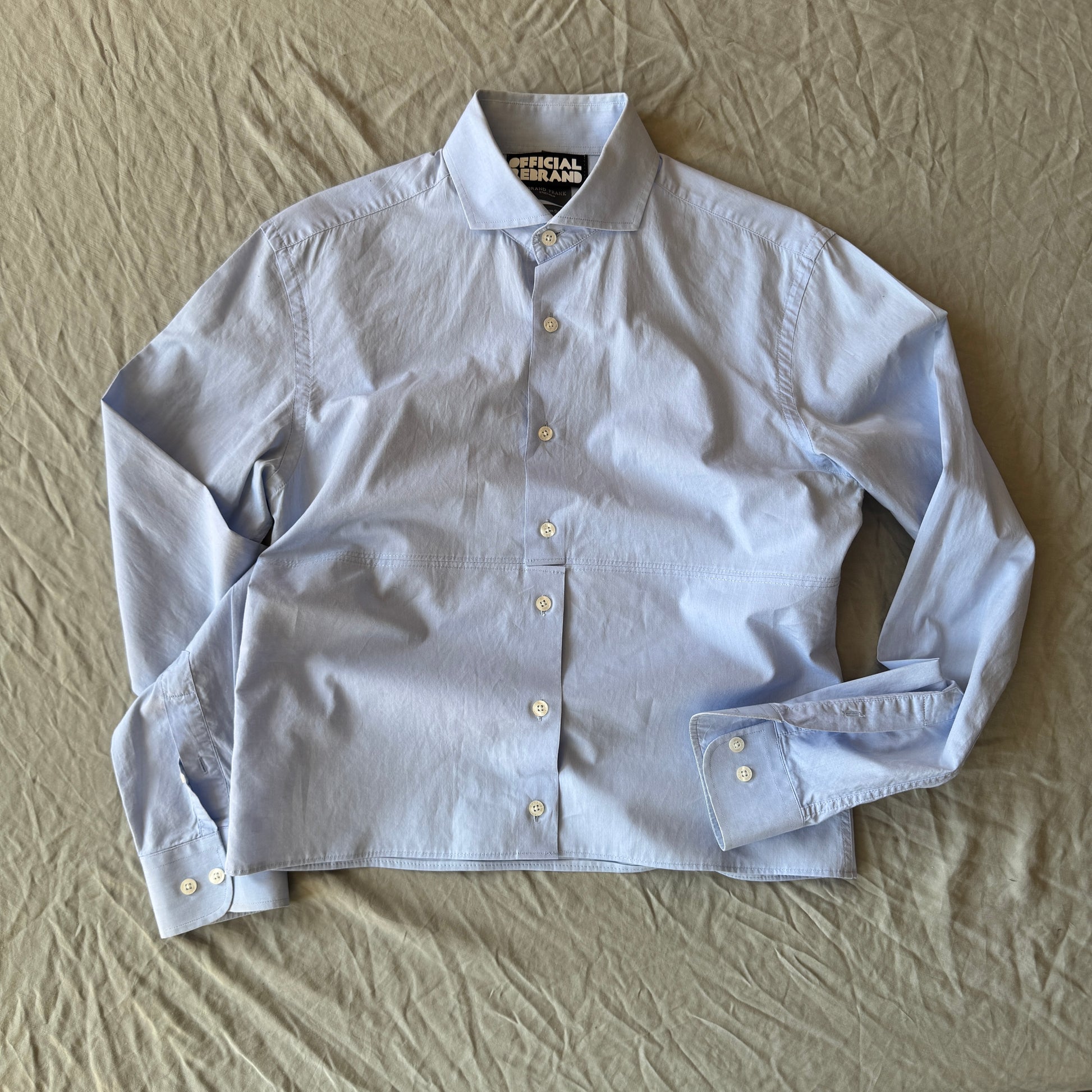 Light blue cotton: Originally made in china and marked size 37/39, 100% cotton. Features a unique english cutaway collar. shoulder to shoulder 17 / chest 38 / highest point shoulder to cuff 25 / highest point shoulder to hem 23