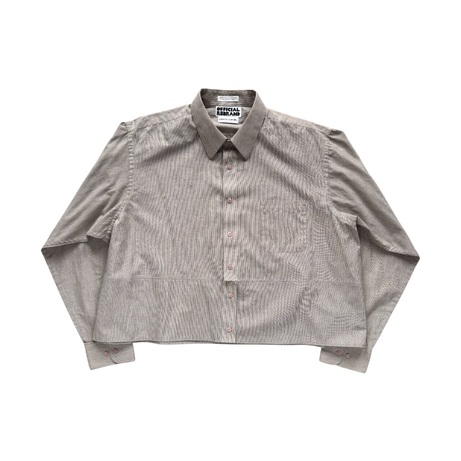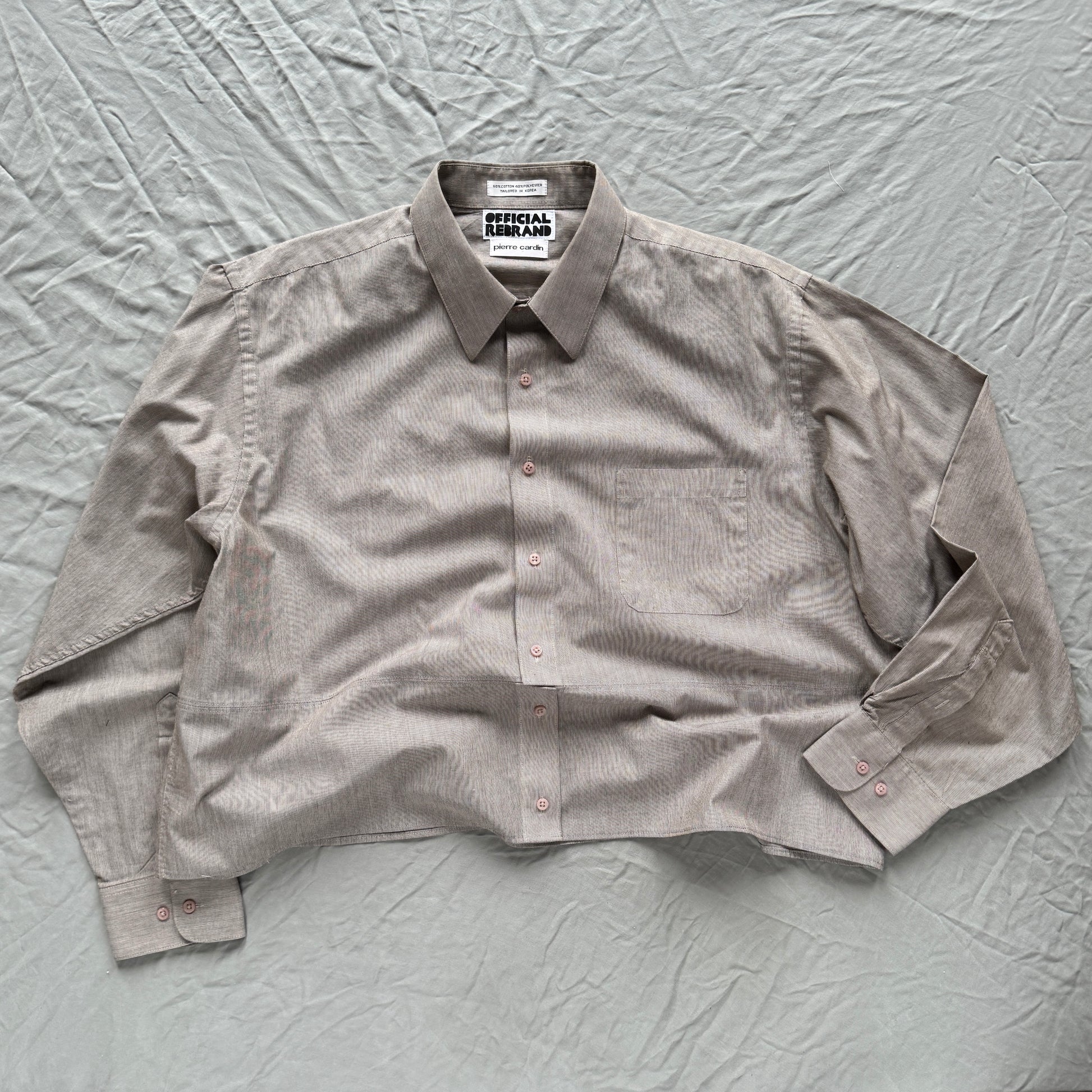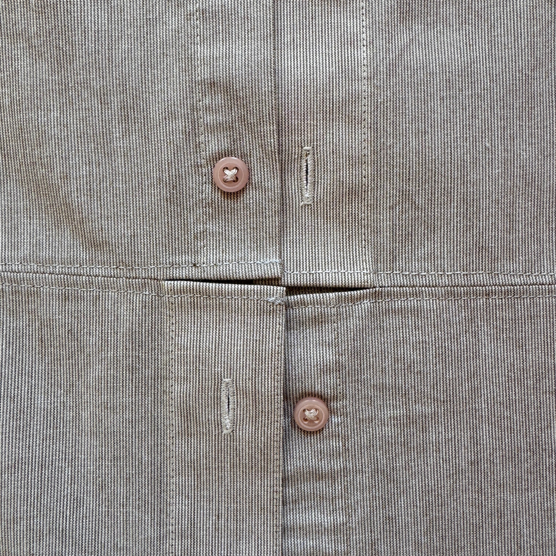 Pierre Cardin long sleeve: 60% cotton, 40% polyester. Features brown and off-white hairline vertical stripes, pearly peach toned buttons, a front chest pocket, and a flat felled seam for a clean finished edge. Originally tailored in Korea. Marked size 17-17.5 / 34/35. shoulder to shoulder 20 / chest 54 / highest point shoulder to hem 23 / shoulder to cuff 23.5.