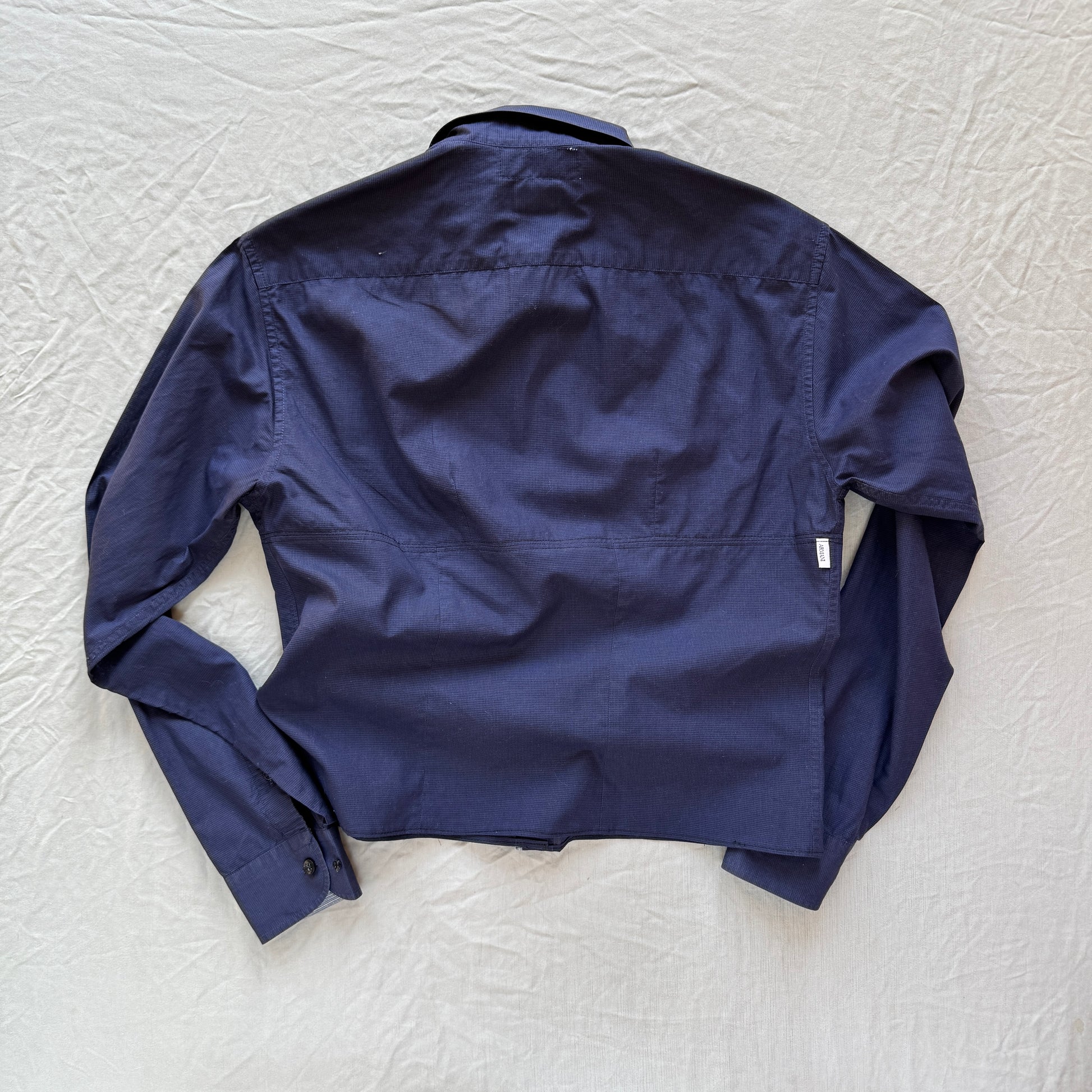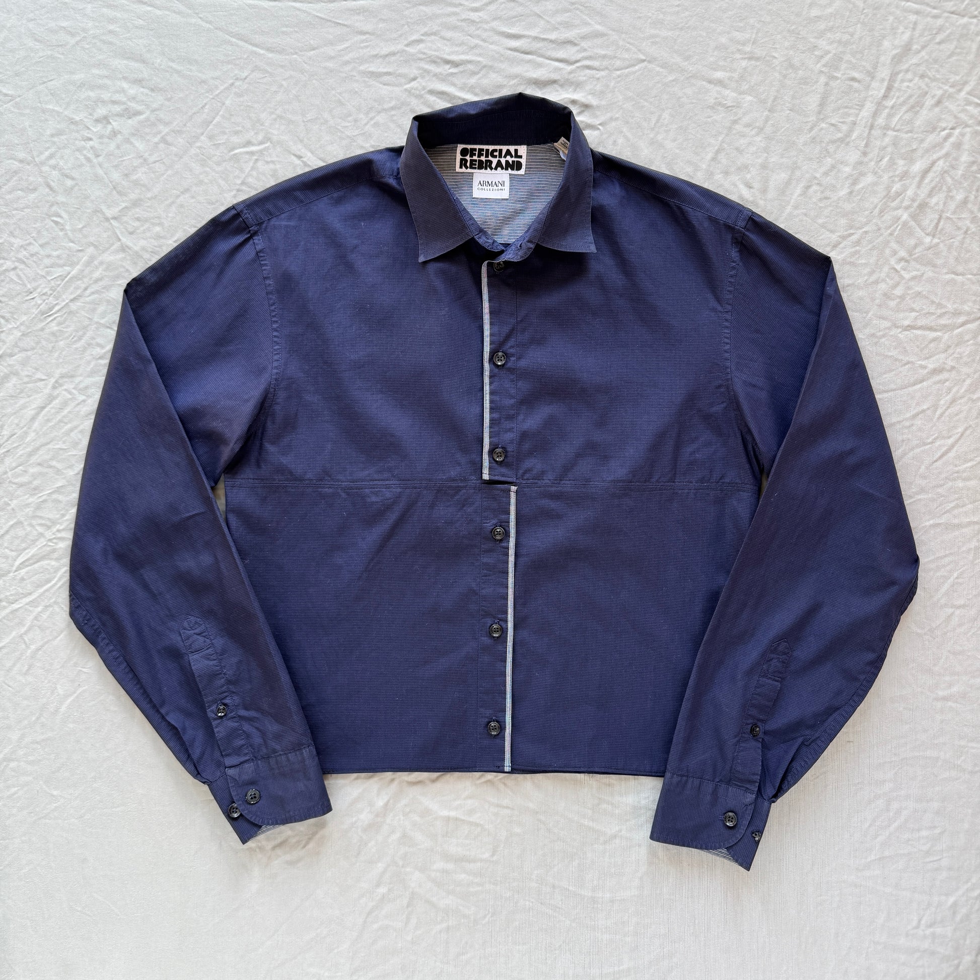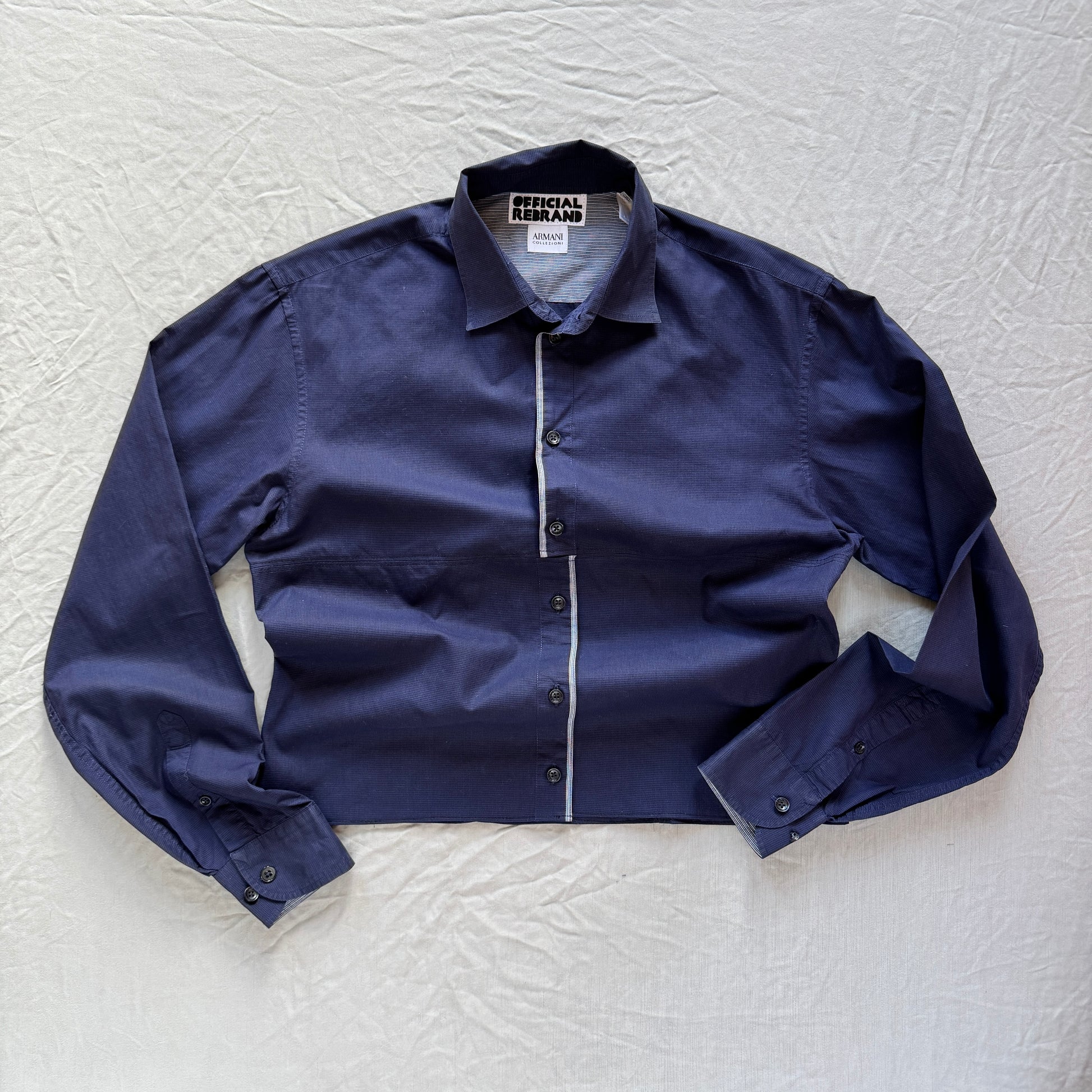 Armani navy long sleeve: 100% cotton. Features a navy and black micro-check pattern, breathable and lightweight cotton material, and white and grey striped lining on the edge of the button closure and inside the cuff. Original garment marked size "M" and made in Tunisia. shoulder to shoulder 18 / chest 40 / highest point shoulder to hem 22.5 / shoulder to cuff 25.