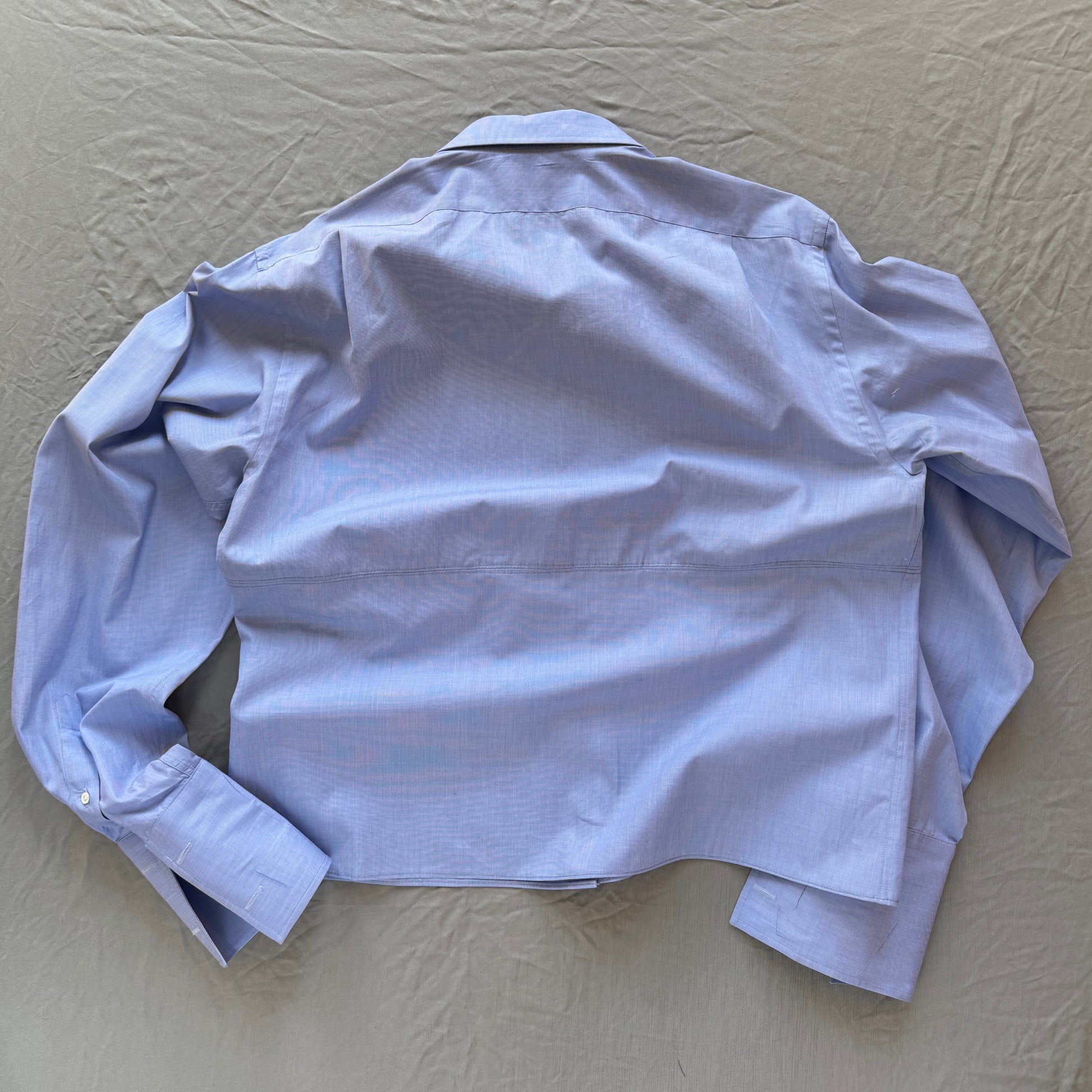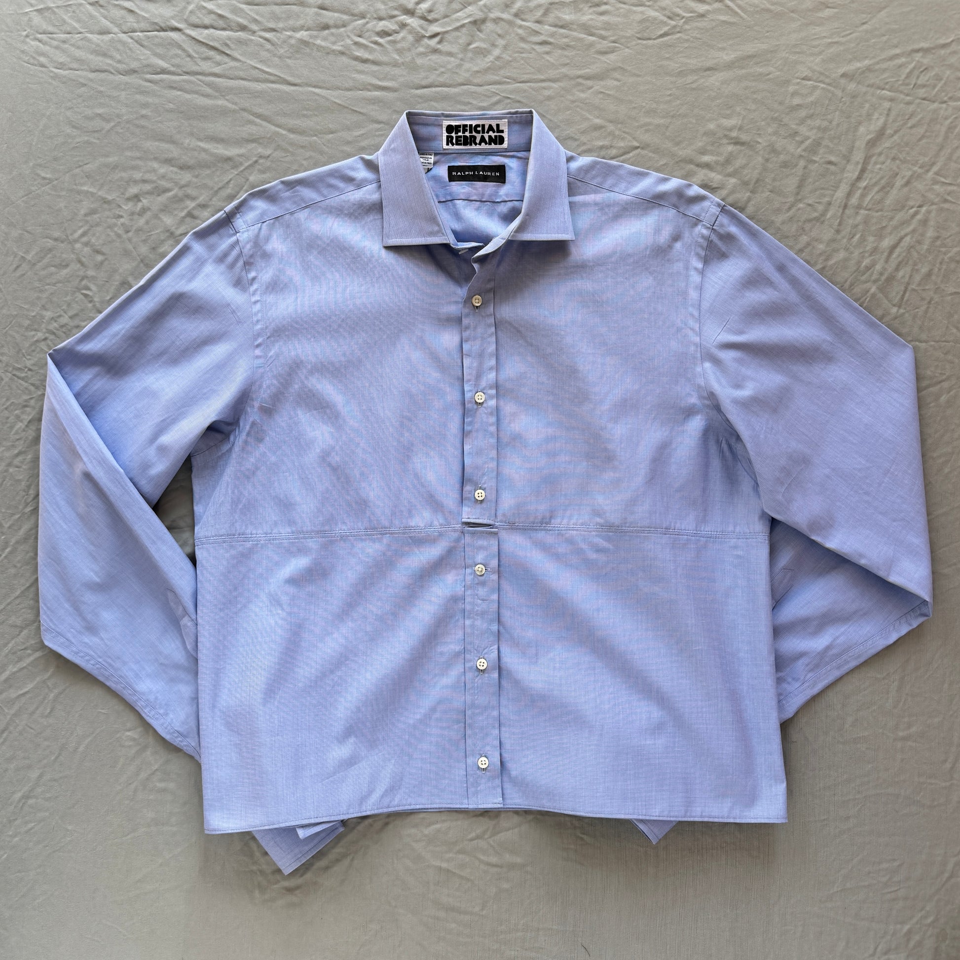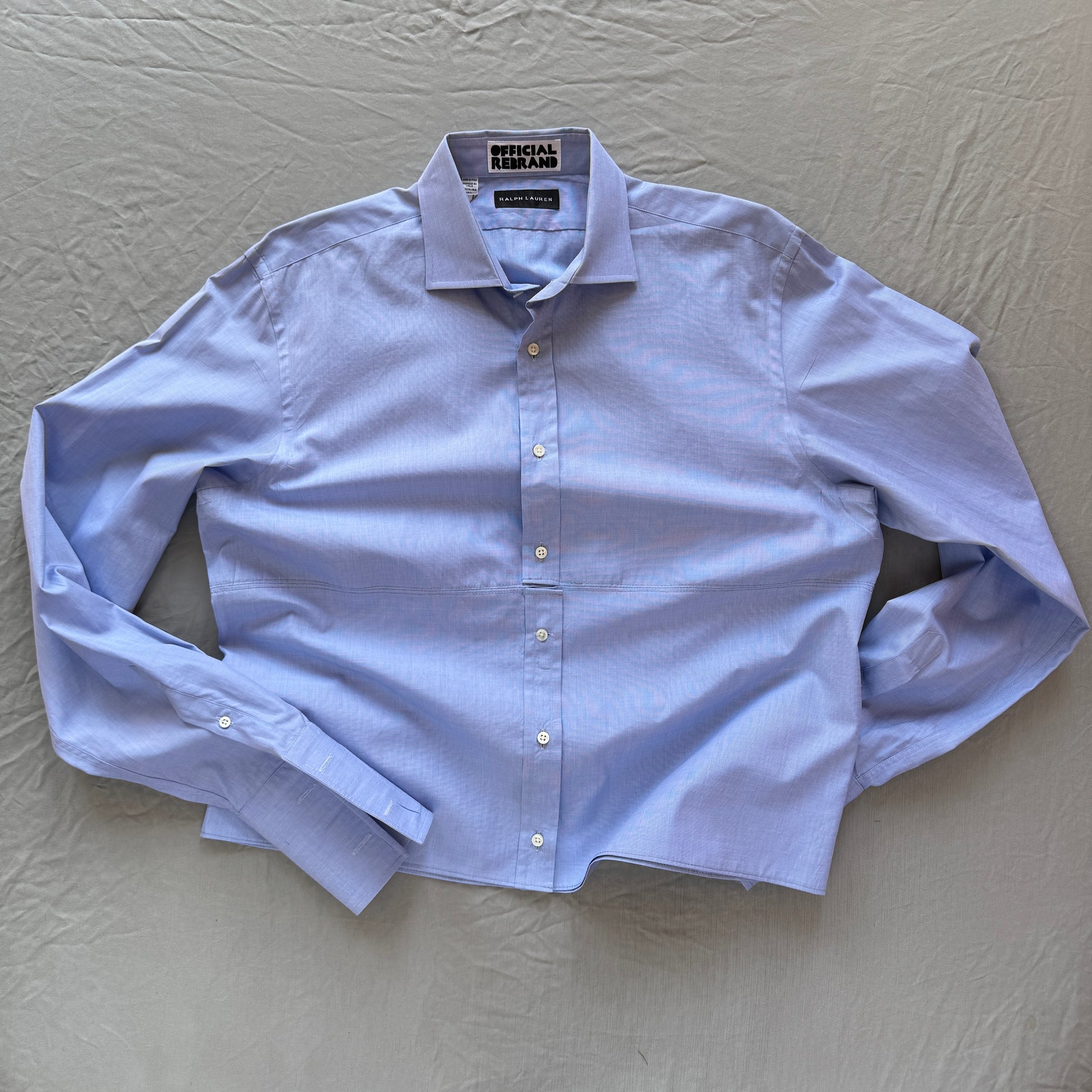 Ralph Lauren light blue long sleeve: 100% cotton. Features a structured collar and cuff, cufflink closures, and a soft sky blue cotton fabric. Minor wear visible around the collar from this shirt's prior life. Original garment marked size 16.5 and made in Italy. shoulder to shoulder 20 / chest 46 / highest point shoulder to hem 25 / shoulder to cuff 30.