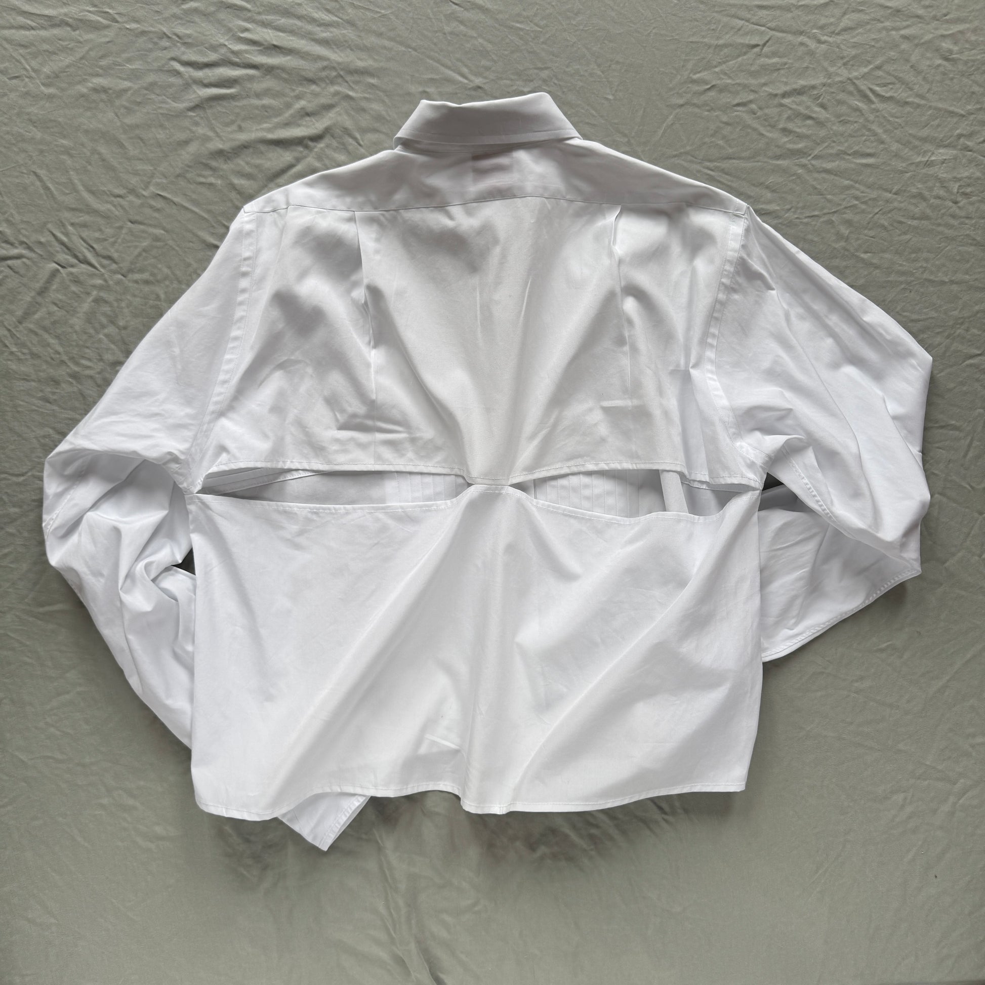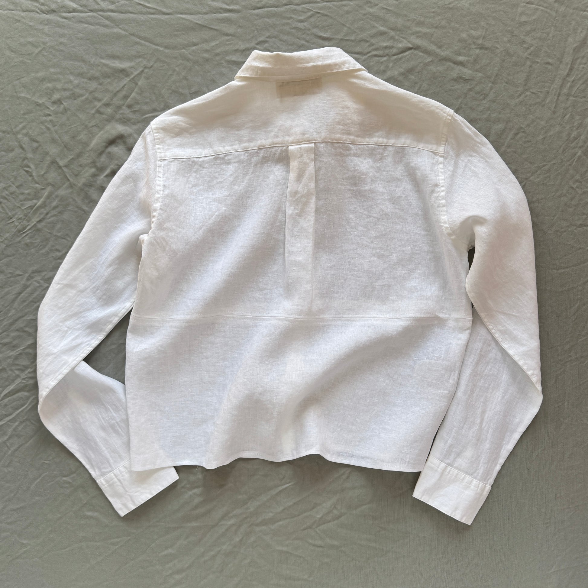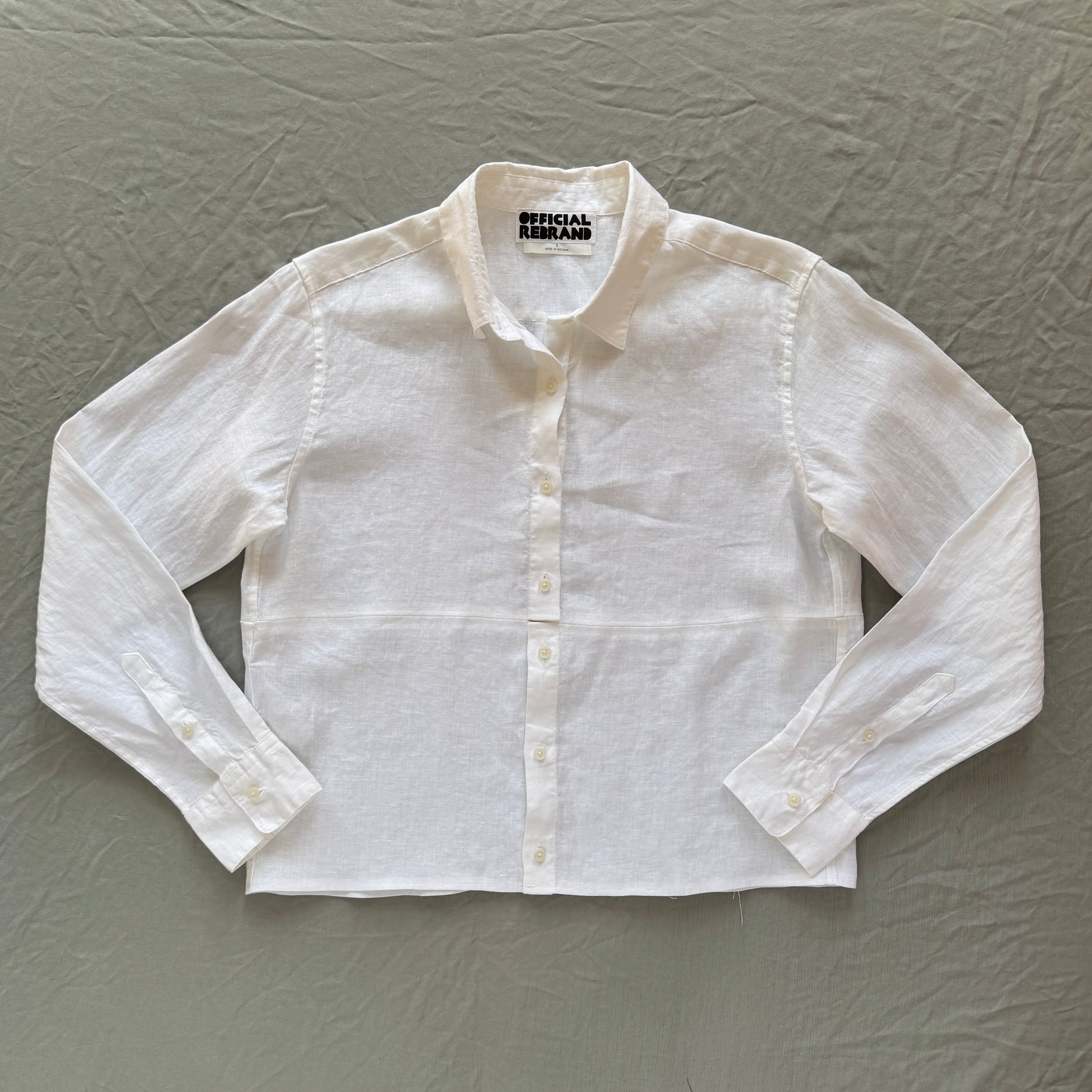White linen: 100% linen button down, original garment marked size "S" and made in Vietnam. shoulder to shoulder 16 / chest 40 / highest point shoulder to hem 21.5 / shoulder to cuff 23.5.