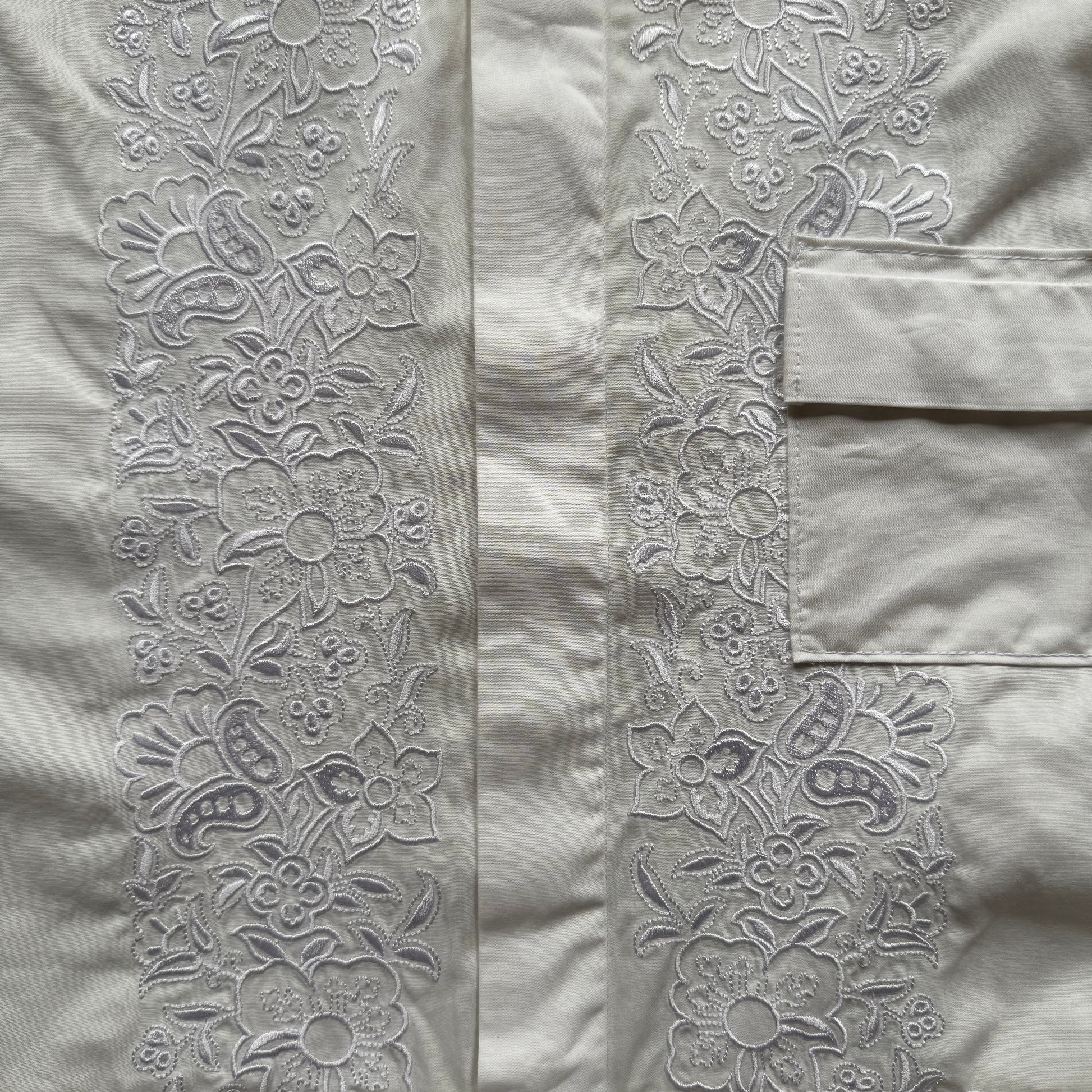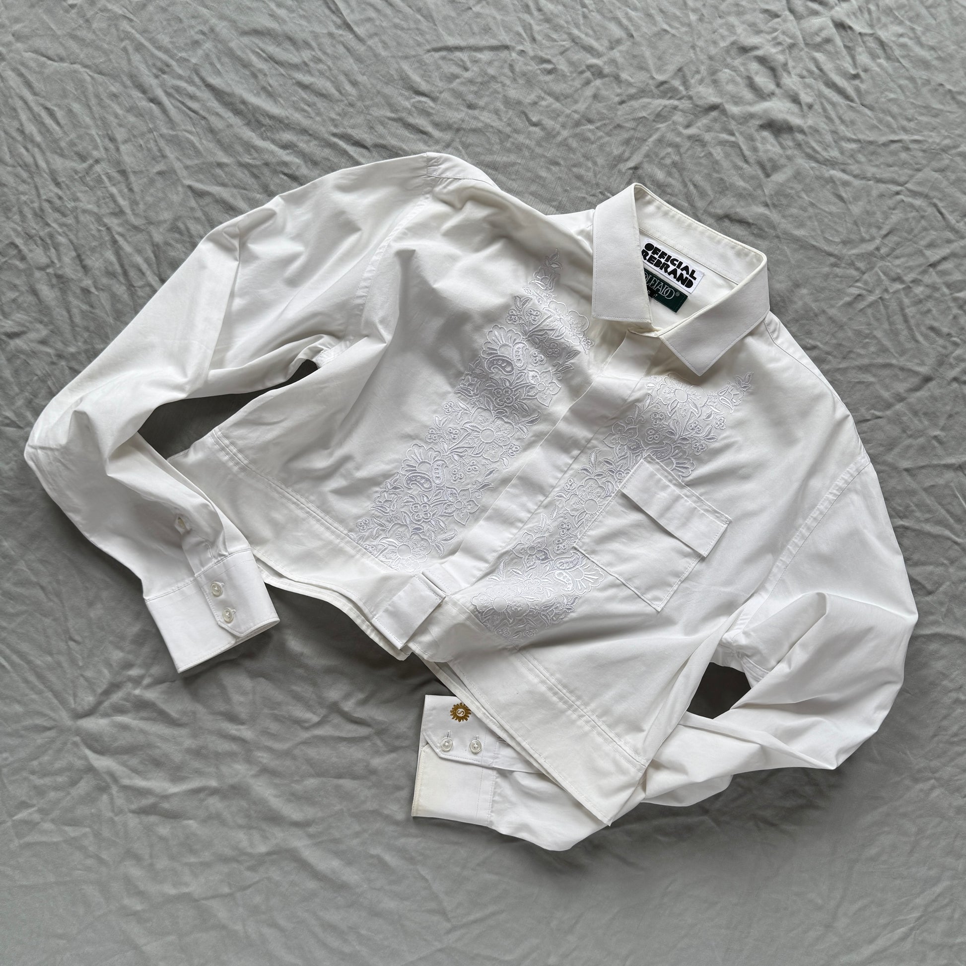 Floral embroidery shirt: features a buttoned front pocket and two panels of white embroidery down the front of the shirt. shoulder to shoulder 20.5 / chest 48 / highest point shoulder to hem 19 / shoulder to cuff 25.5. Original garment marked size 5.