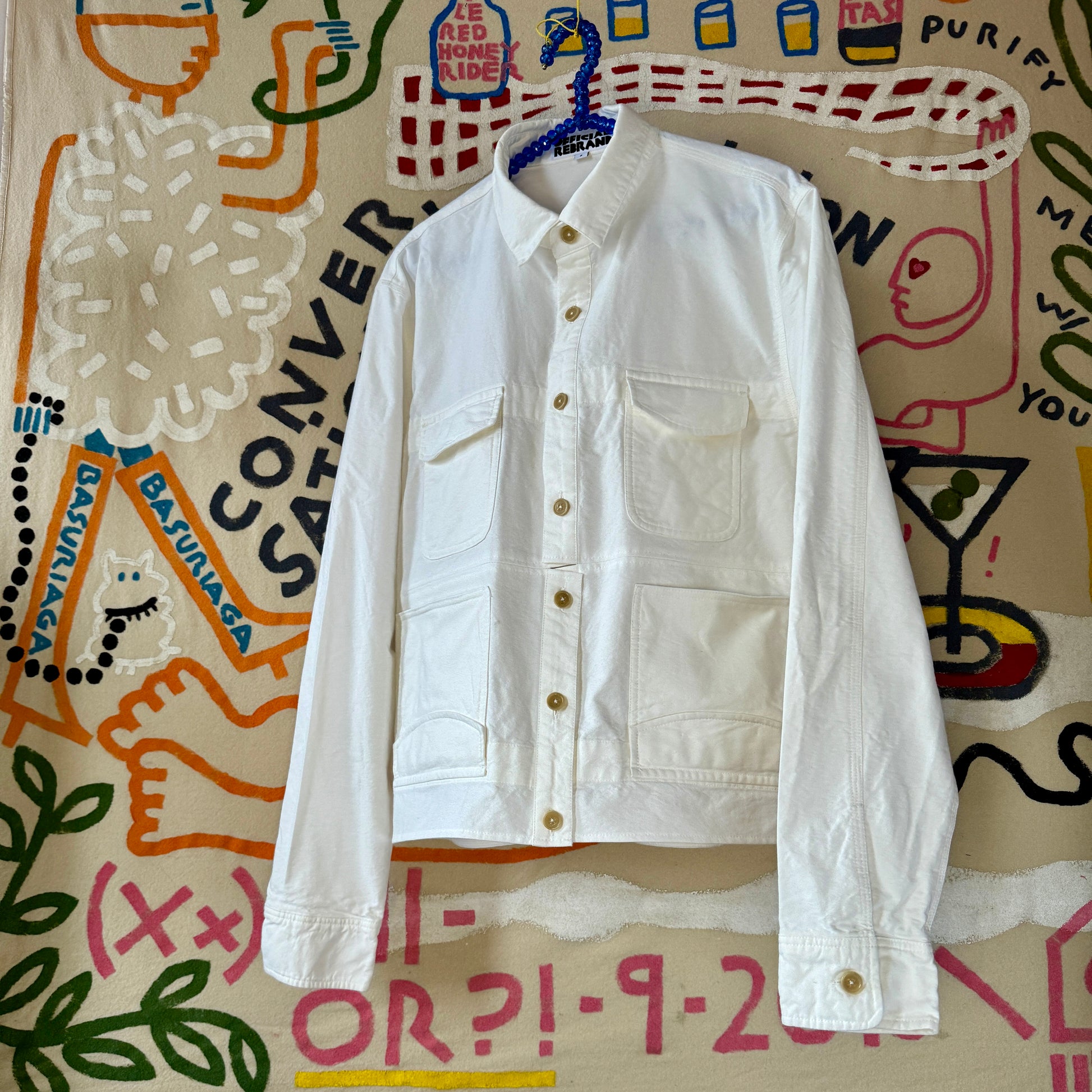 Long sleeved utility pocket: features four front pockets and a canvas-like exterior fabric with a thin fleecy lining. shoulder to shoulder 18 / chest 44 / highest point shoulder to hem 24 / shoulder to cuff 25.5. Original garment marked S.