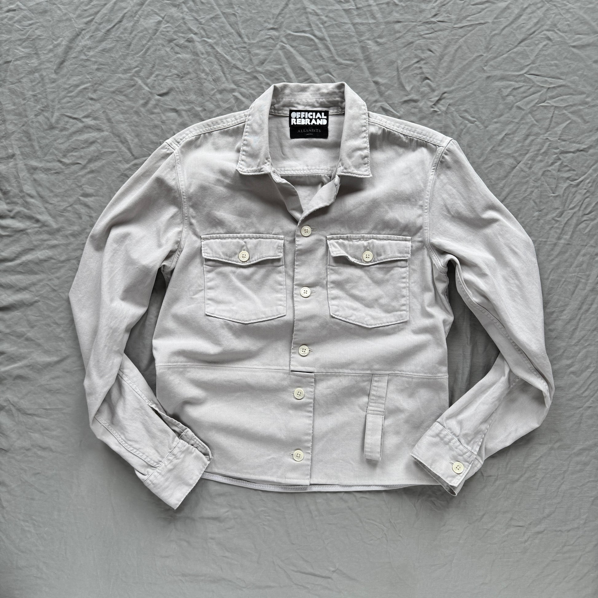 Neutral Allsaints utility shirt: originally marked size S, made in china, 100% cotton. Features two front chest pockets, a utility loop on the side, and a thick and structured cotton fabric. shoulder to shoulder 17 / chest 40 / highest point shoulder to hem 24 / shoulder to cuff 25.5.
