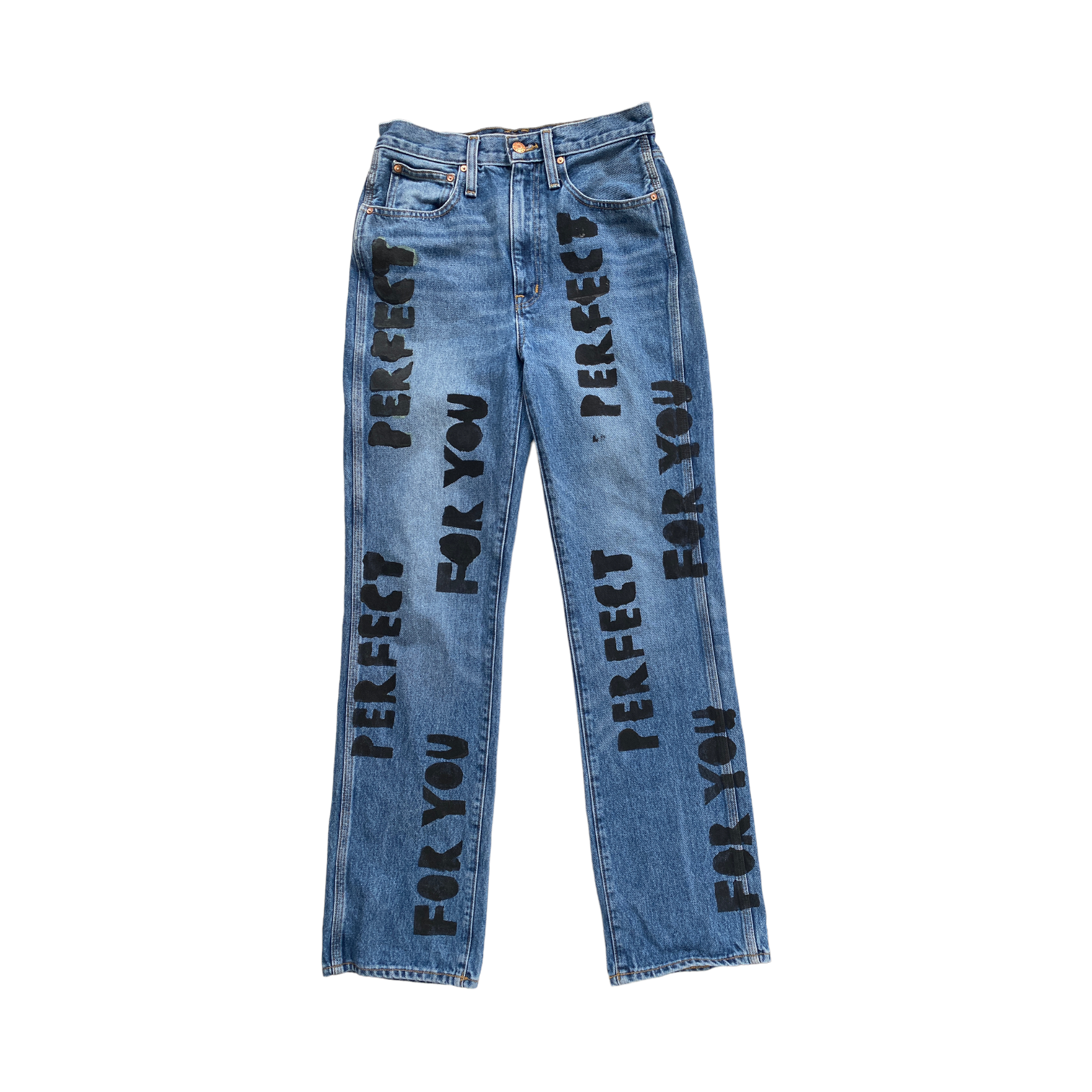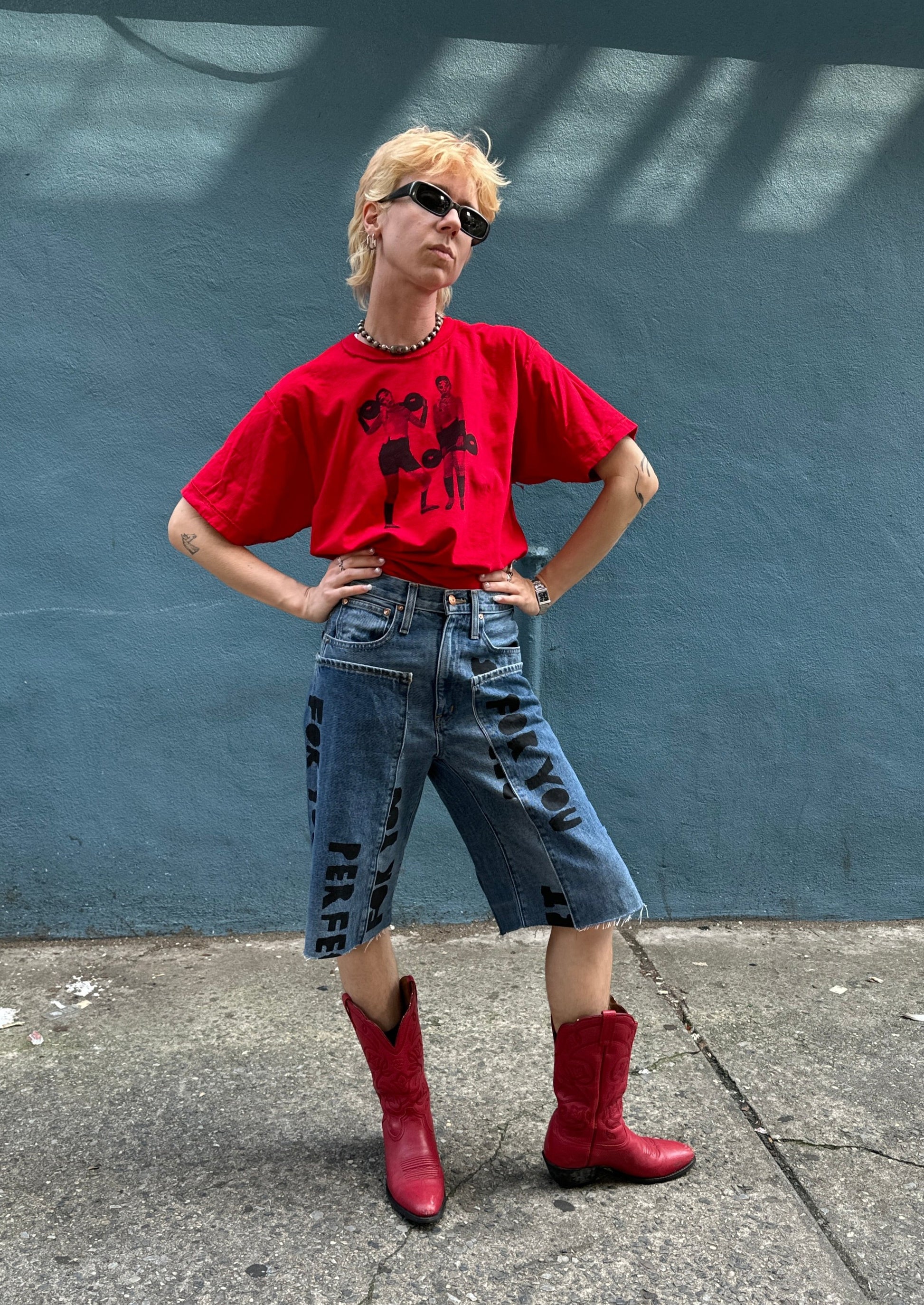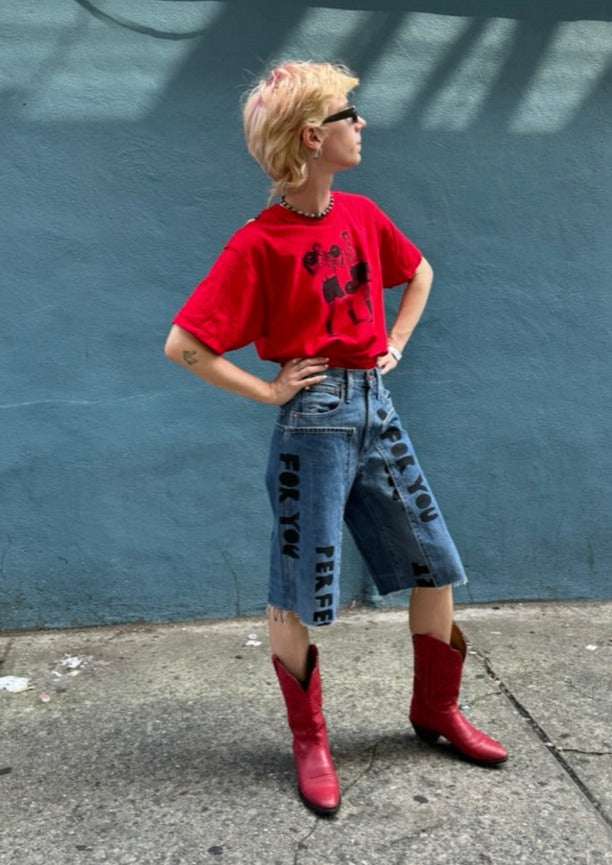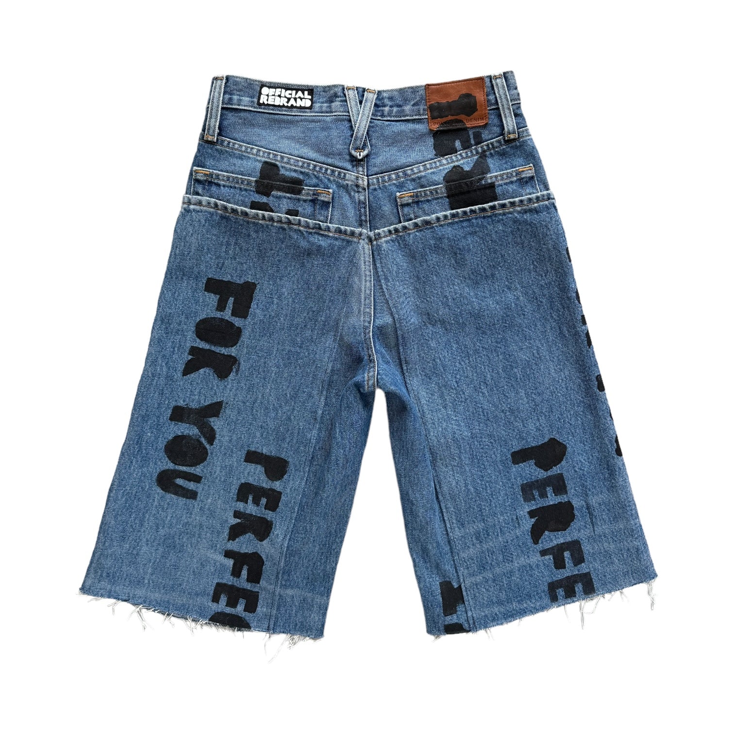 stencil painted shorts with black text reading "PERFECT FOR YOU" over denim upcycled jeans. We unearthed them from our archive for a third redesign. Originally shaped as long straight leg jeans, these bottoms were cut and restructured into shorts with a wider leg, updated for a more relevant look. The method echoes an early upcycling/tailoring technique called "slash and spread". One-of-a-kind piece.