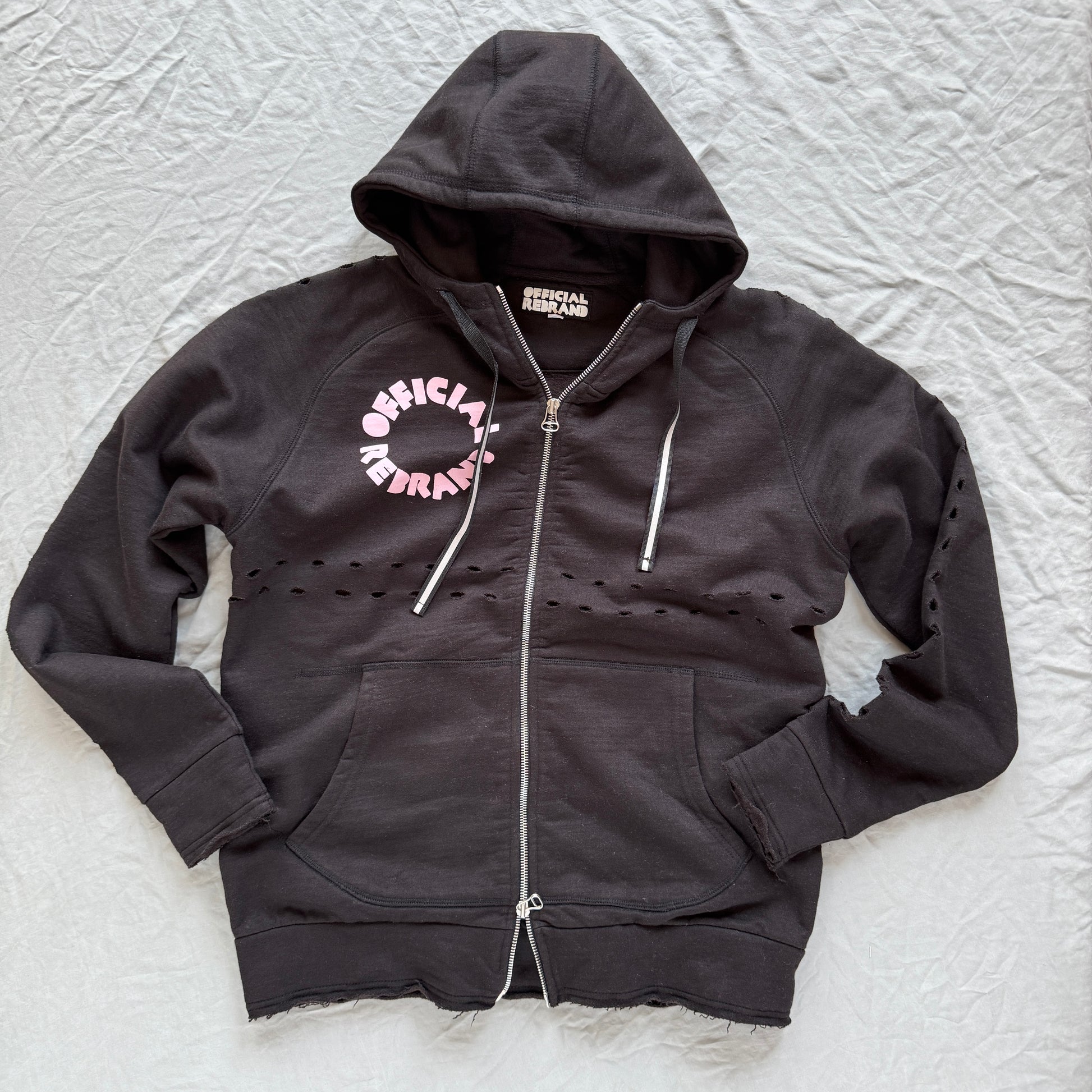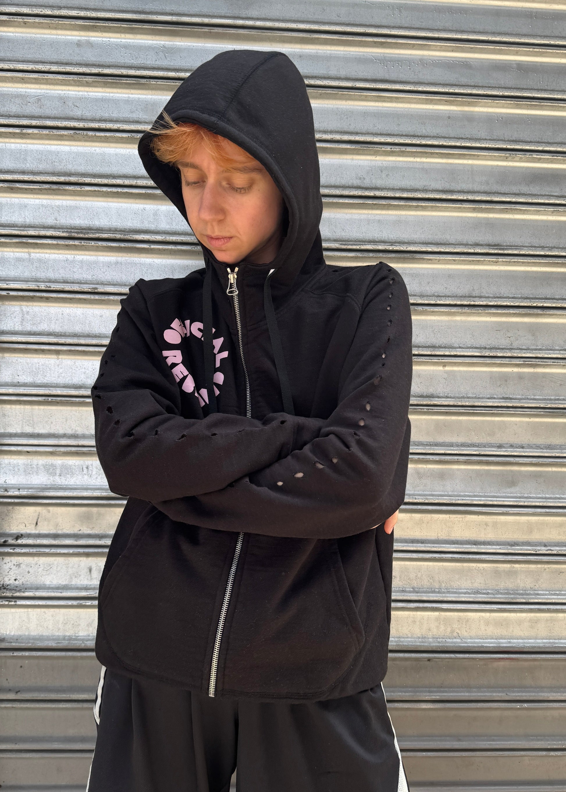 The body of the hoodie was further transformed with small holes in collaboration with Wear and Tear. By upcycling second-hand garments, Wear and Tear throws a wrench into the fashion system that demands hyper-consumerism. The hand-cut garments evolve with every day use. More use begets more love.