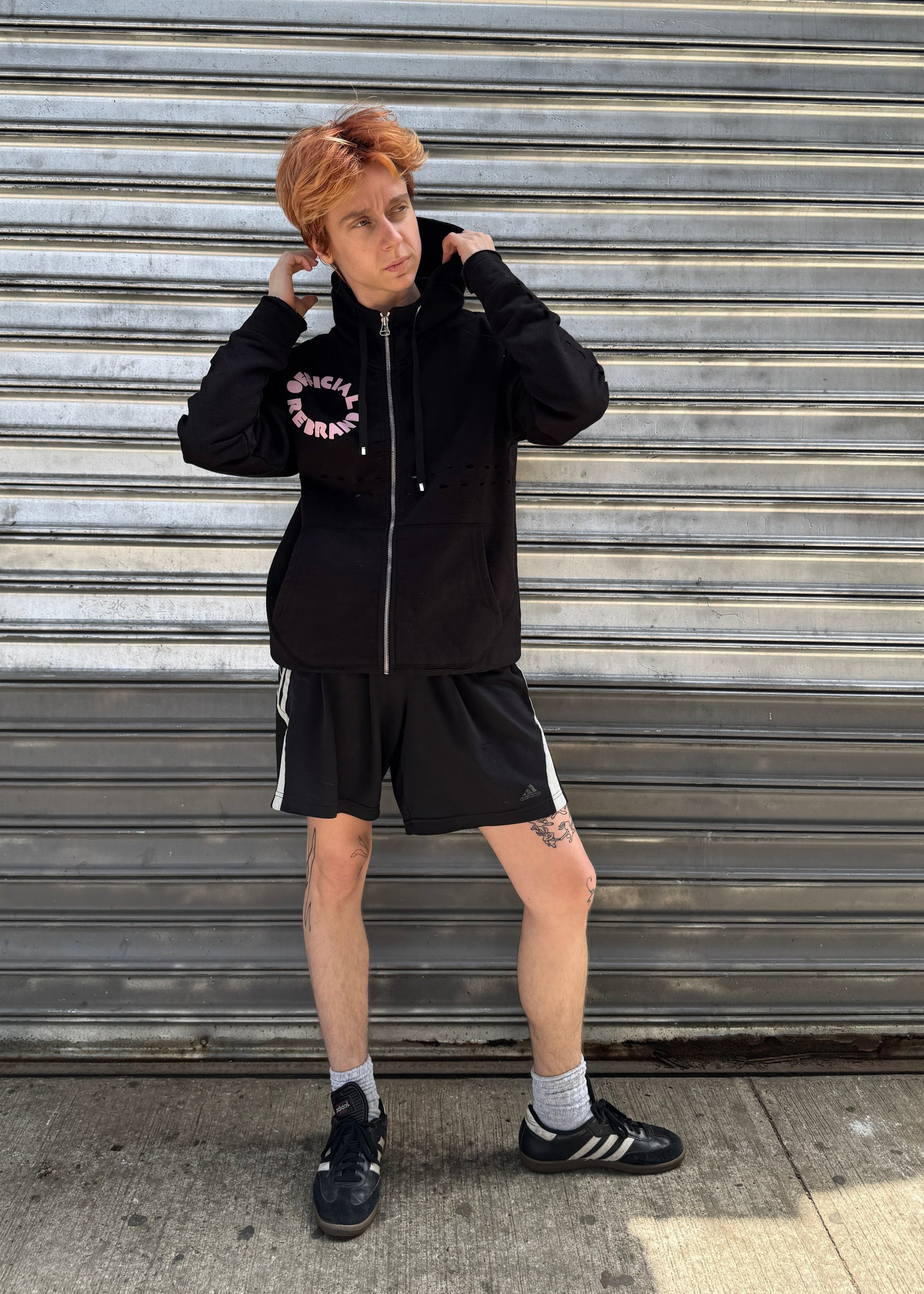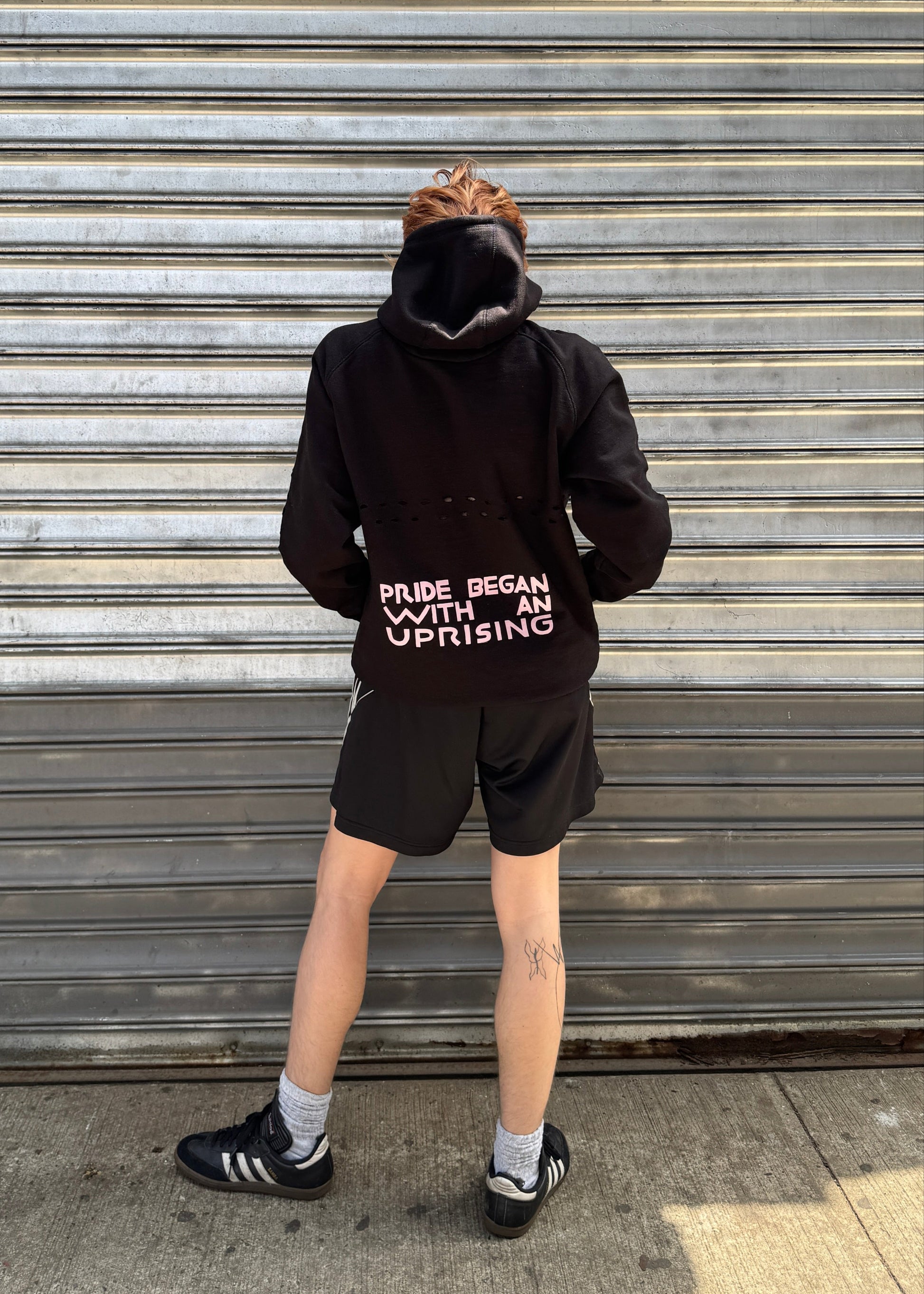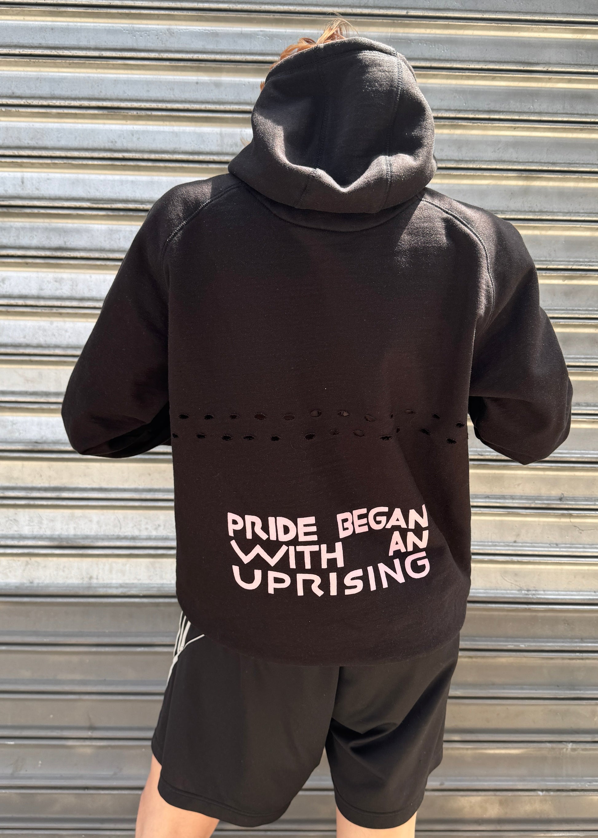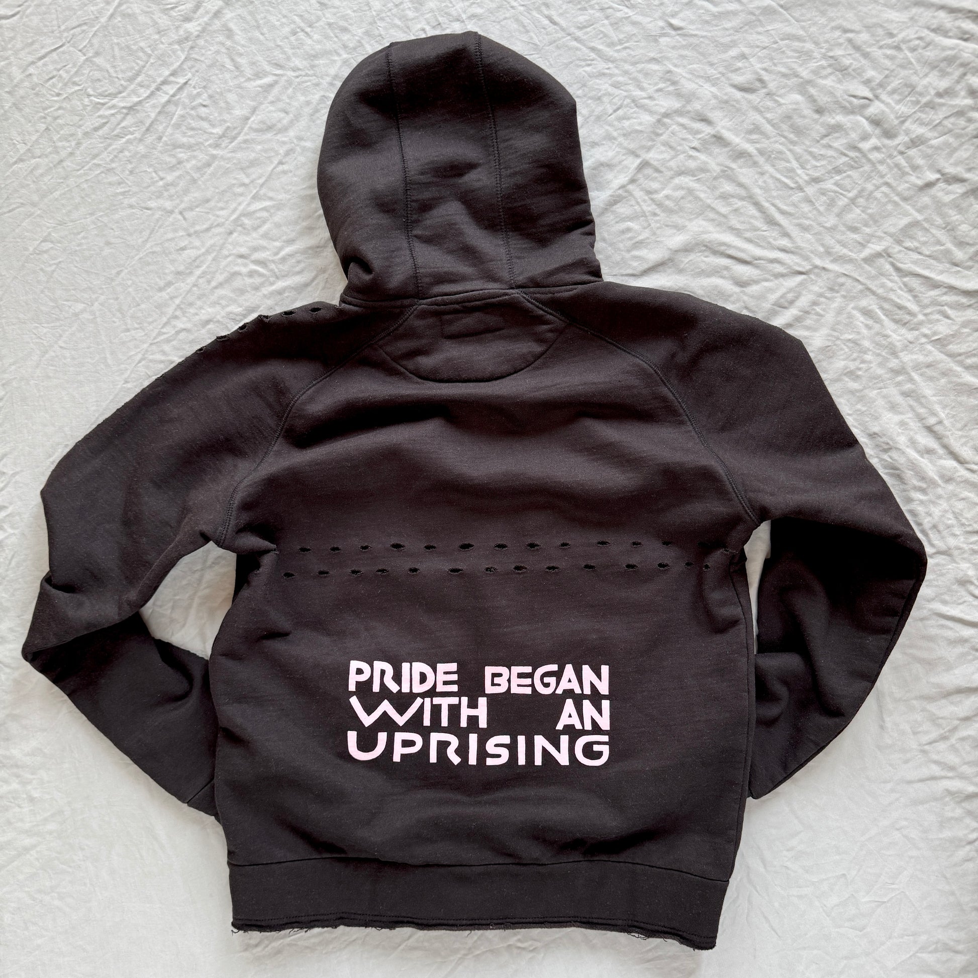 Celebrate the radical origins of Pride! Light pink print on repurposed dead stock hoodies from luxury men's sportswear brand. This heavyweight zip-up sweatshirt with sturdy silver double zipper was revitalized for a second life to conserve the Earth's increasingly limited resources.