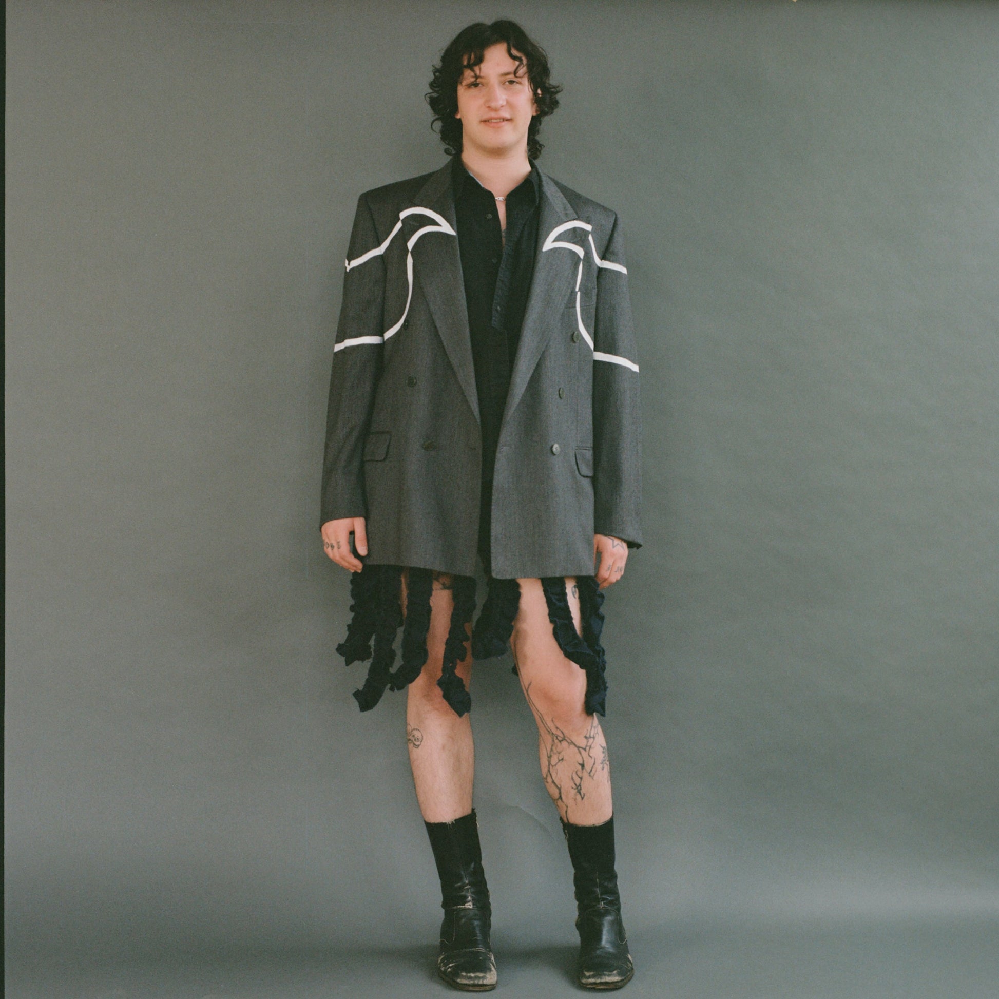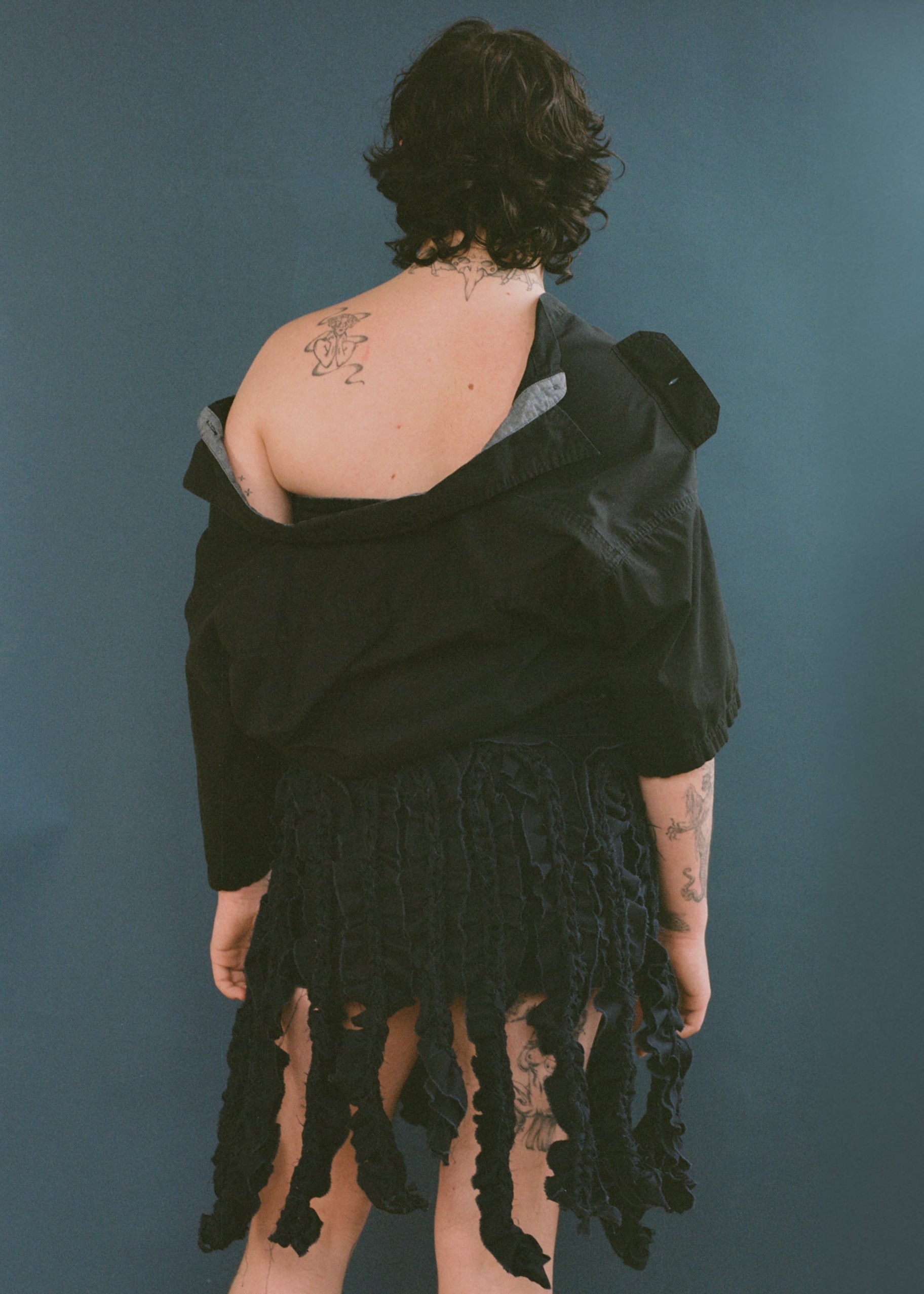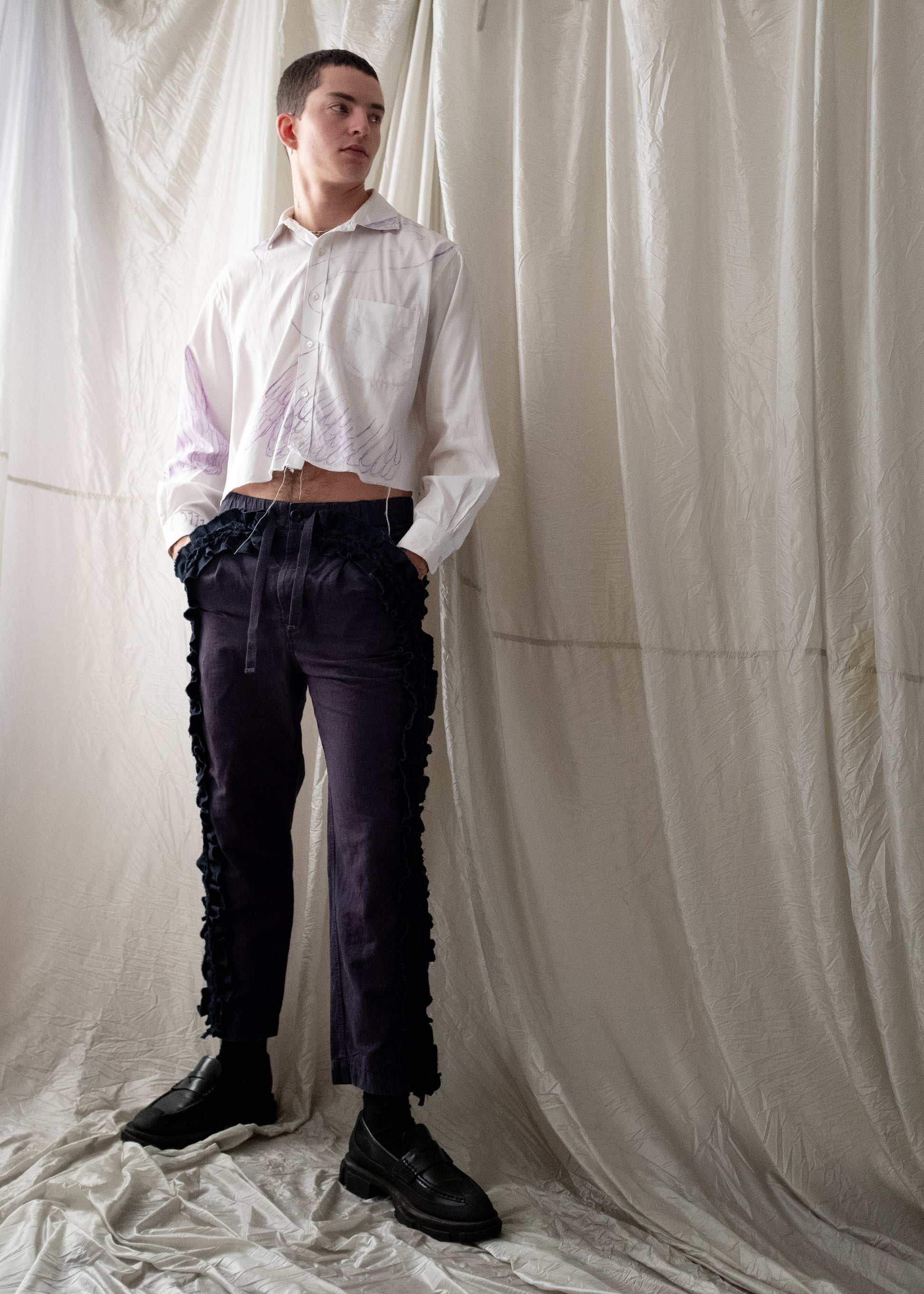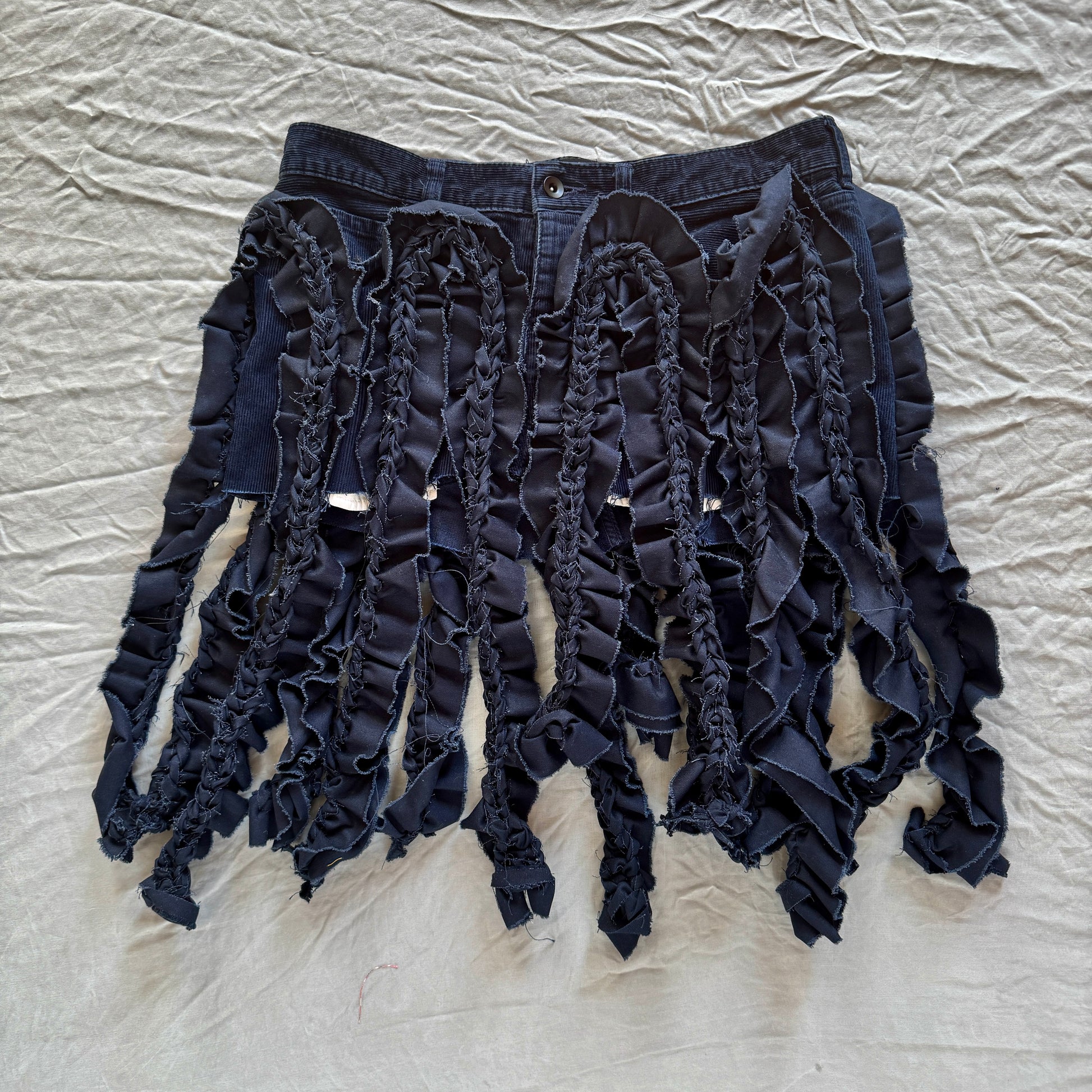 One-of-a-kind navy blue bottoms from our ongoing collaboration with raspaditos, combining woven deadstock tendrils over repurposed garments.