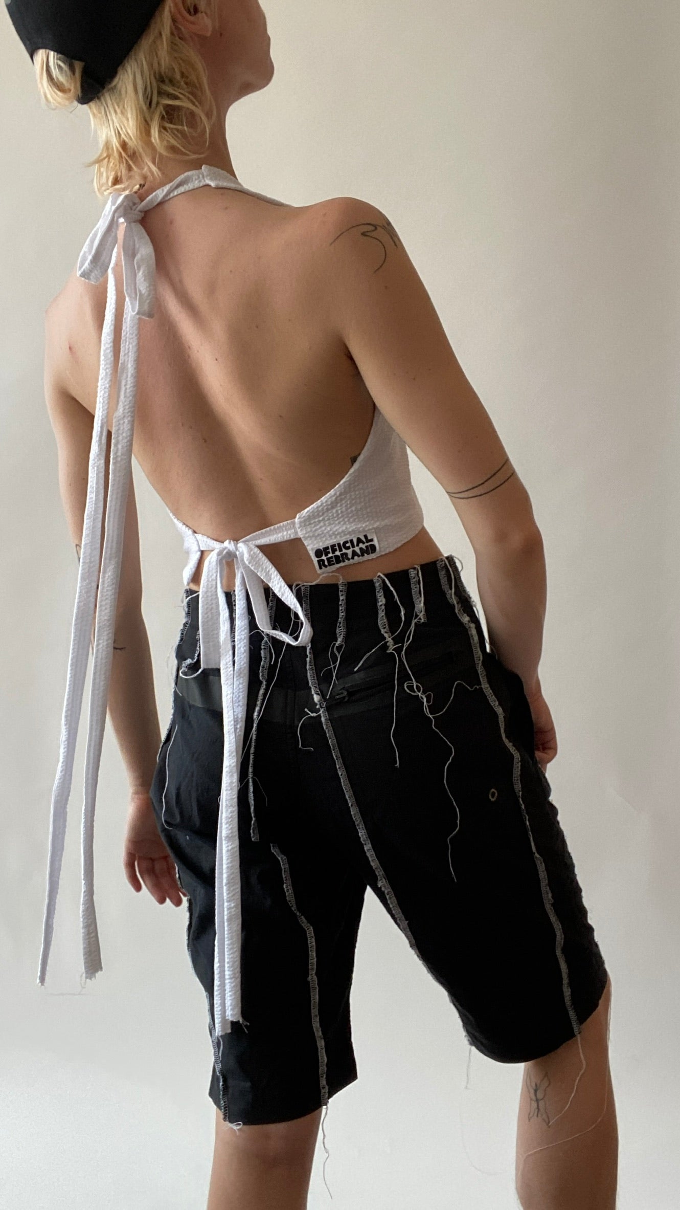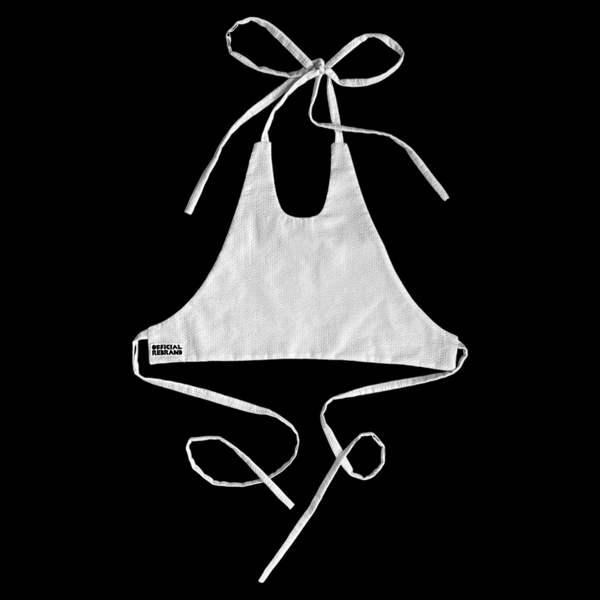 The halter tops are available in white, aqua and white stripe, or oatmeal and white stripe. These pieces are also available for custom painting, so email us at studio@officialrebrand.com for more info on placing a custom order.