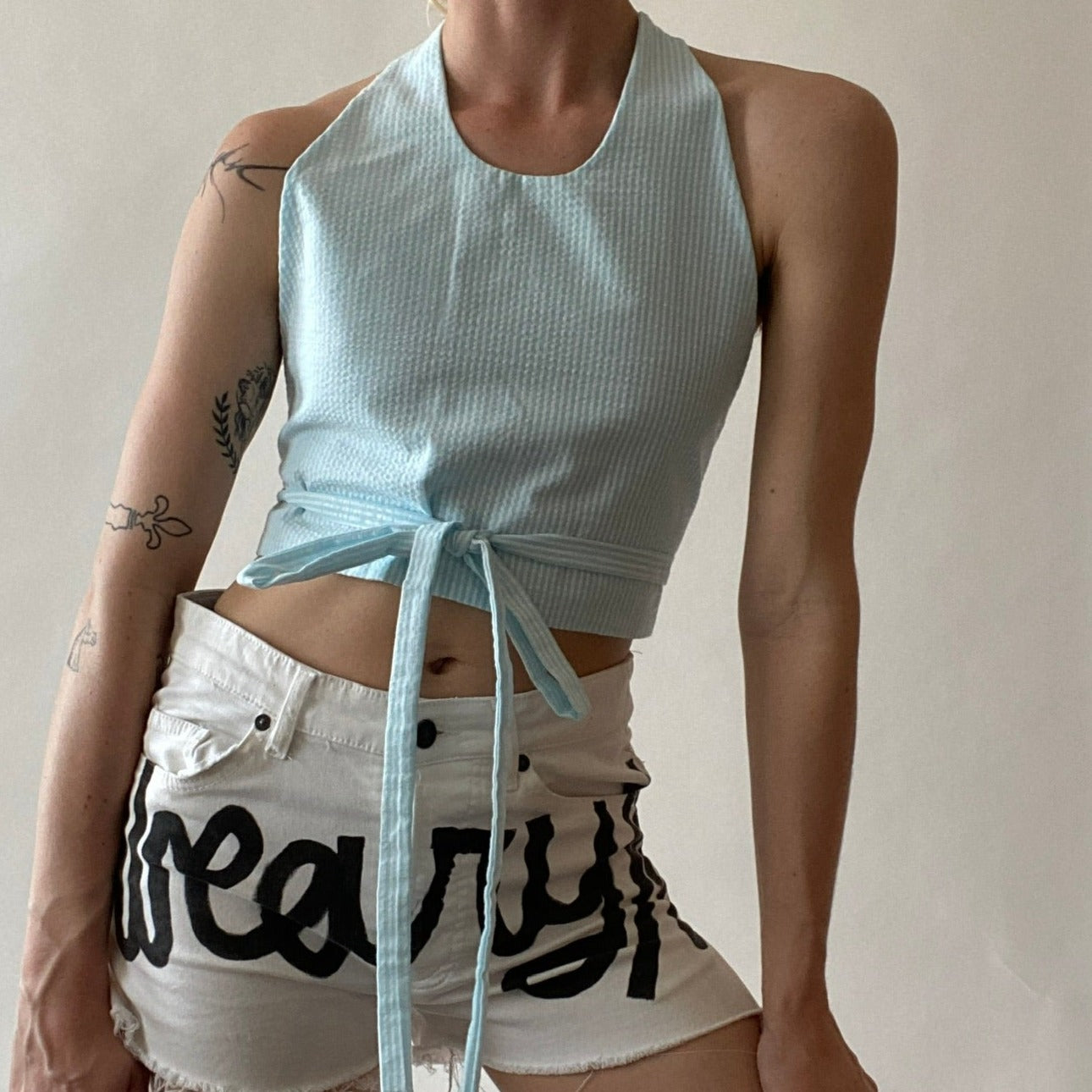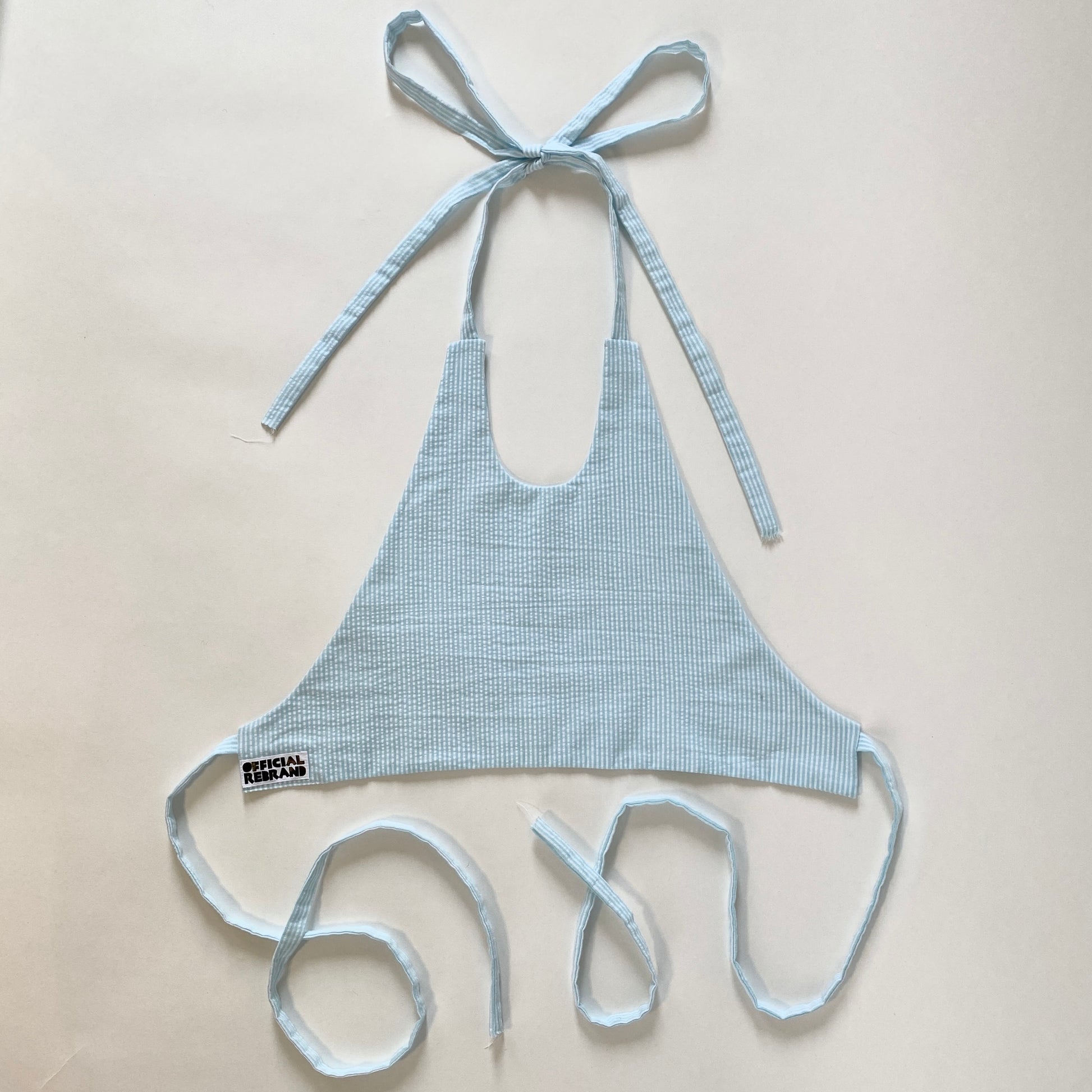 Making use of what already exists, these 100% cotton seersucker halter tops were upcycled from deadstock fabric from a luxury sportswear brand that closed. These breezy tops feature long, adjustable ties that can be styled many ways, and adjusted to fit a large range of sizes and figures.