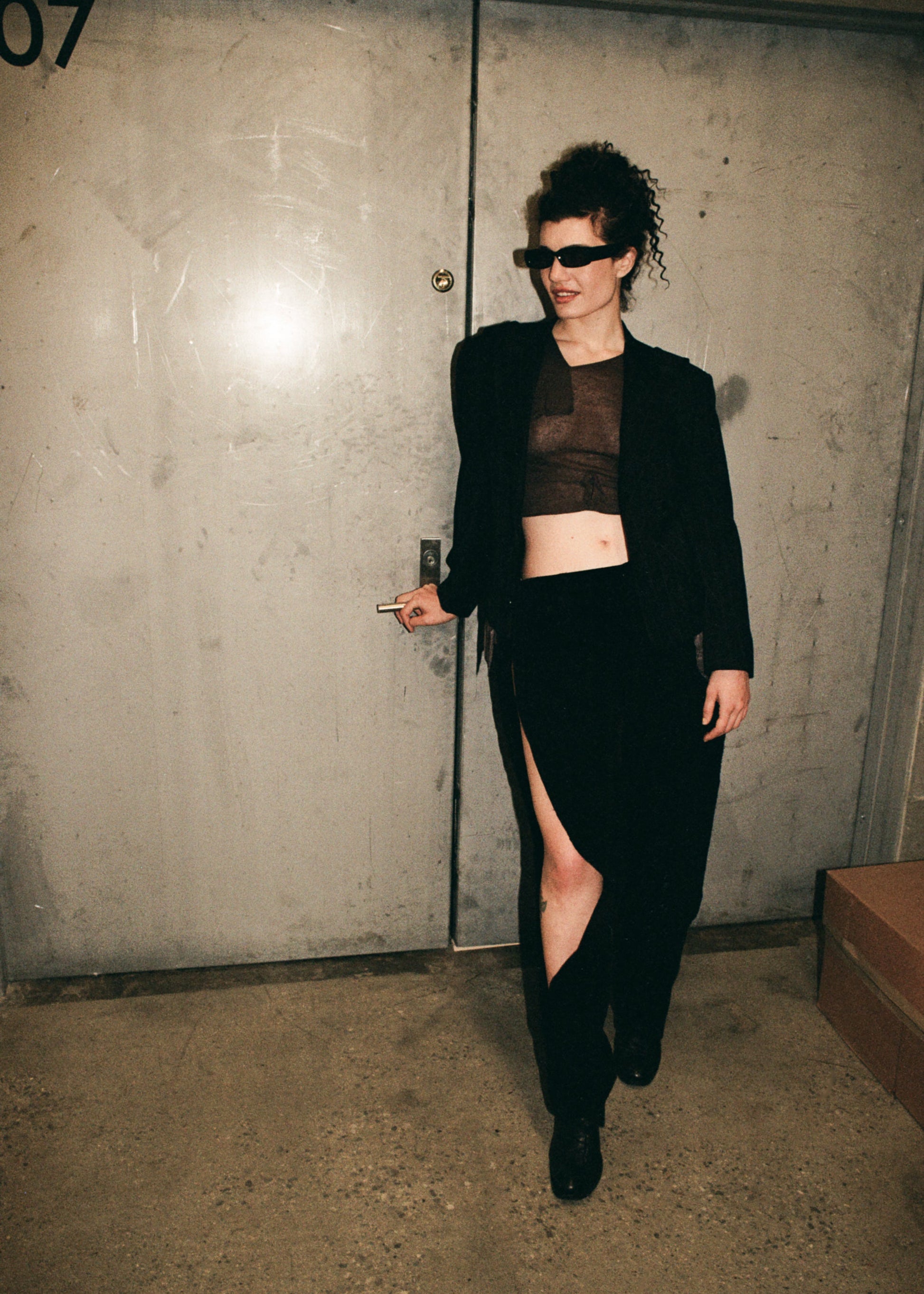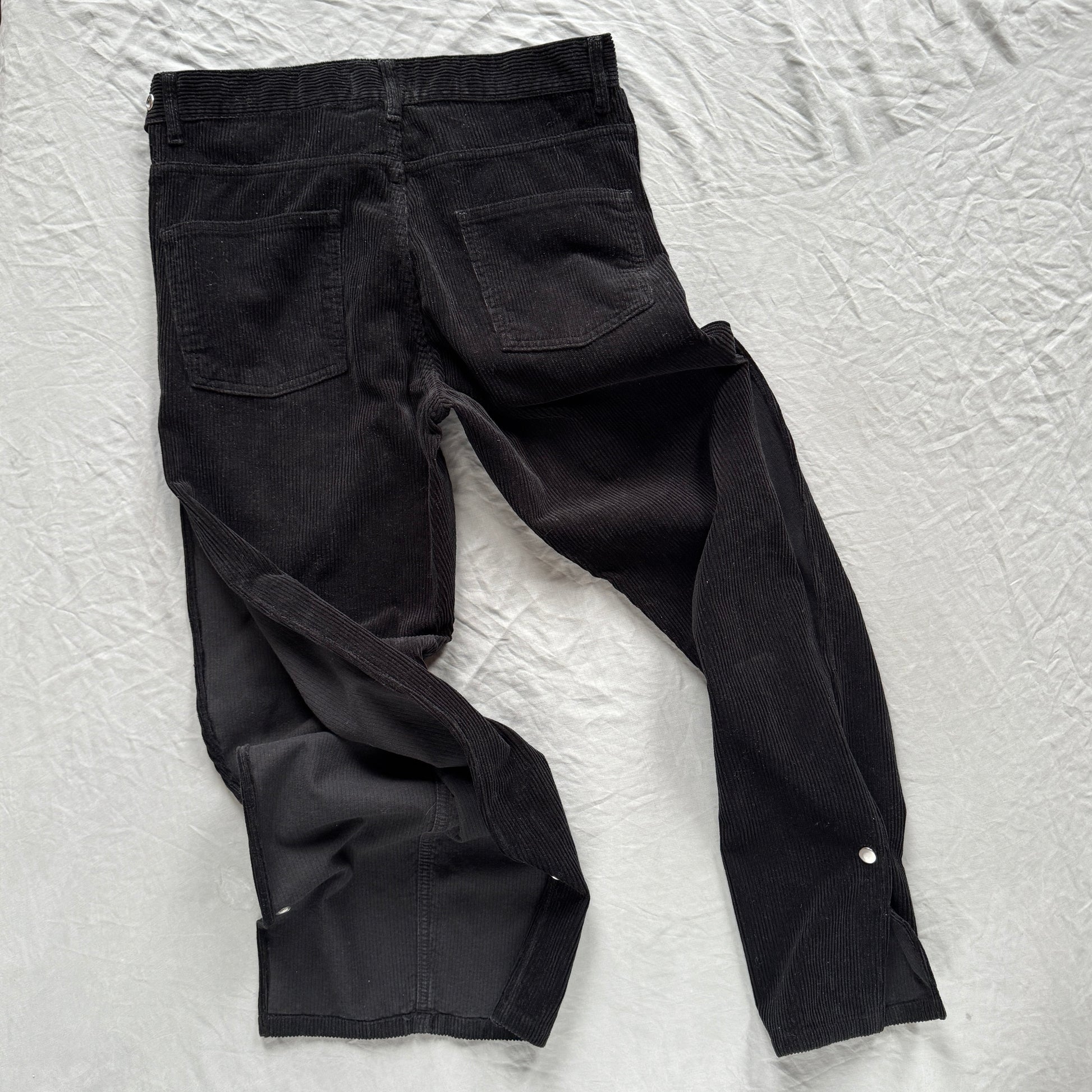 These corduroy pants were repurposed and given a perfect trans-seasonal adjustment: open panels added to the sides of the legs with snap closures at the top and bottom. Feel the breeze through your pant legs or layer up with tights peeking through with these unique bottoms.