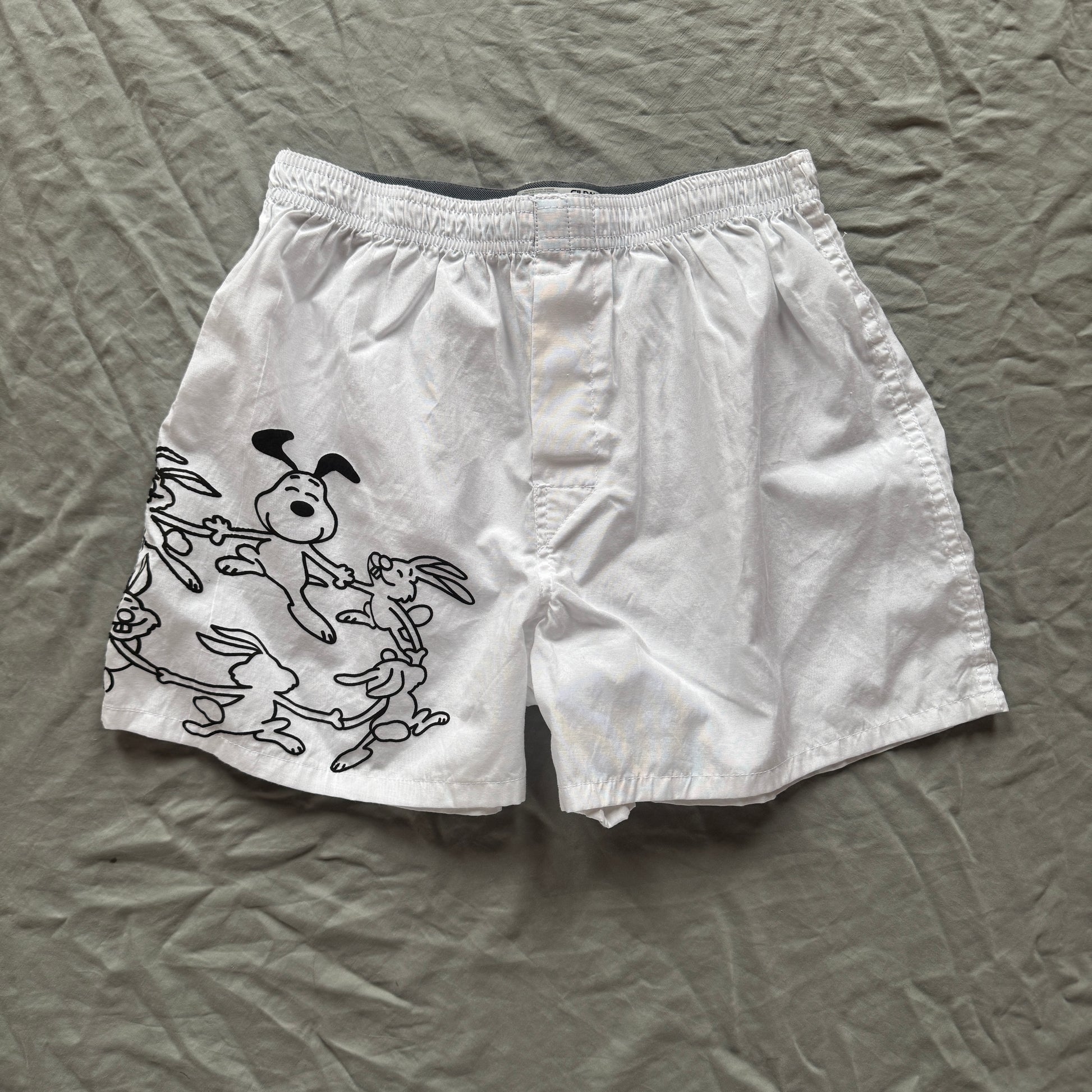 Hand-stamped "snoopy and their bunnies" boxers made of 100% cotton, a classic intimate with a silly fashion twist. Email us at studio@officialrebrand.com to have a custom word stamped on your boxers!