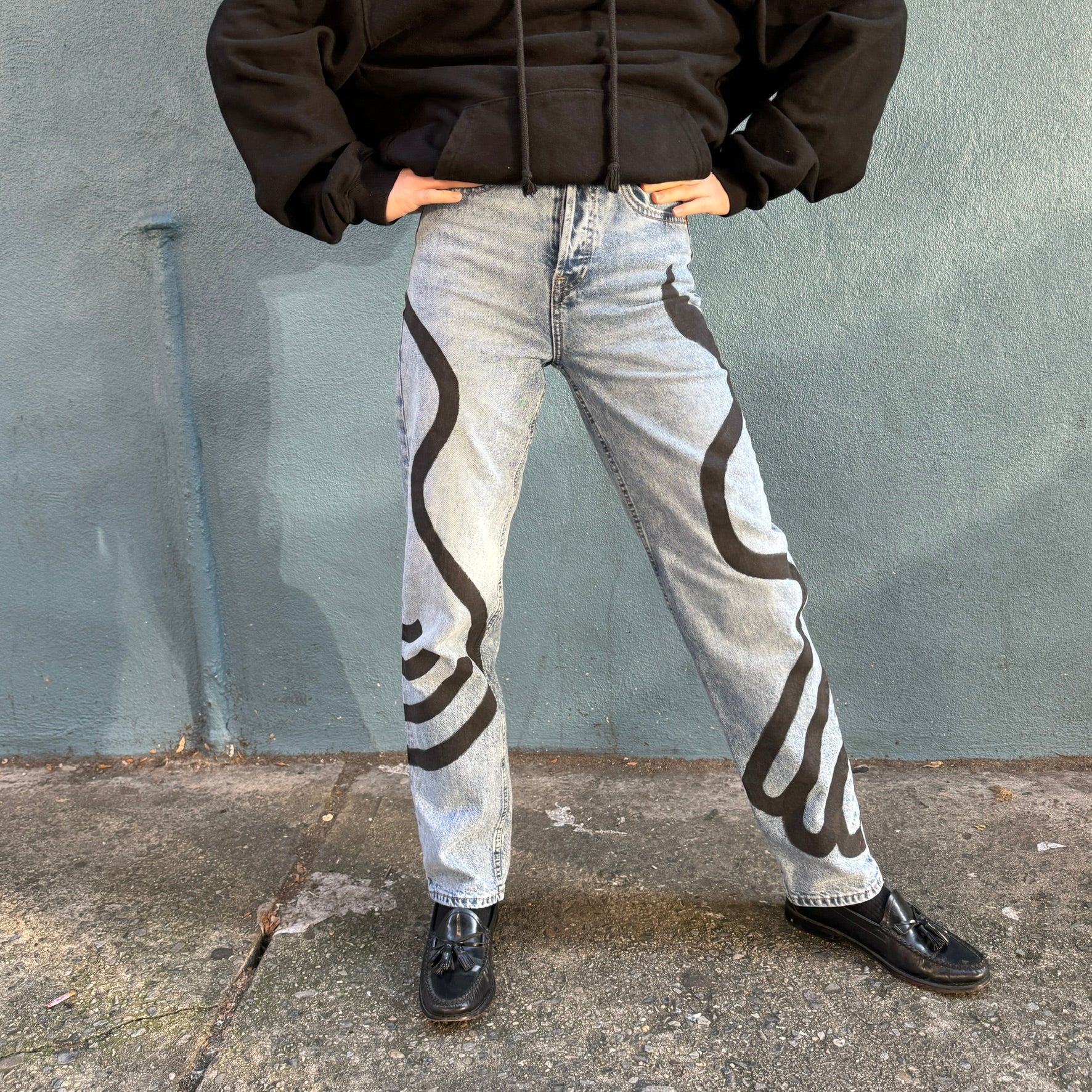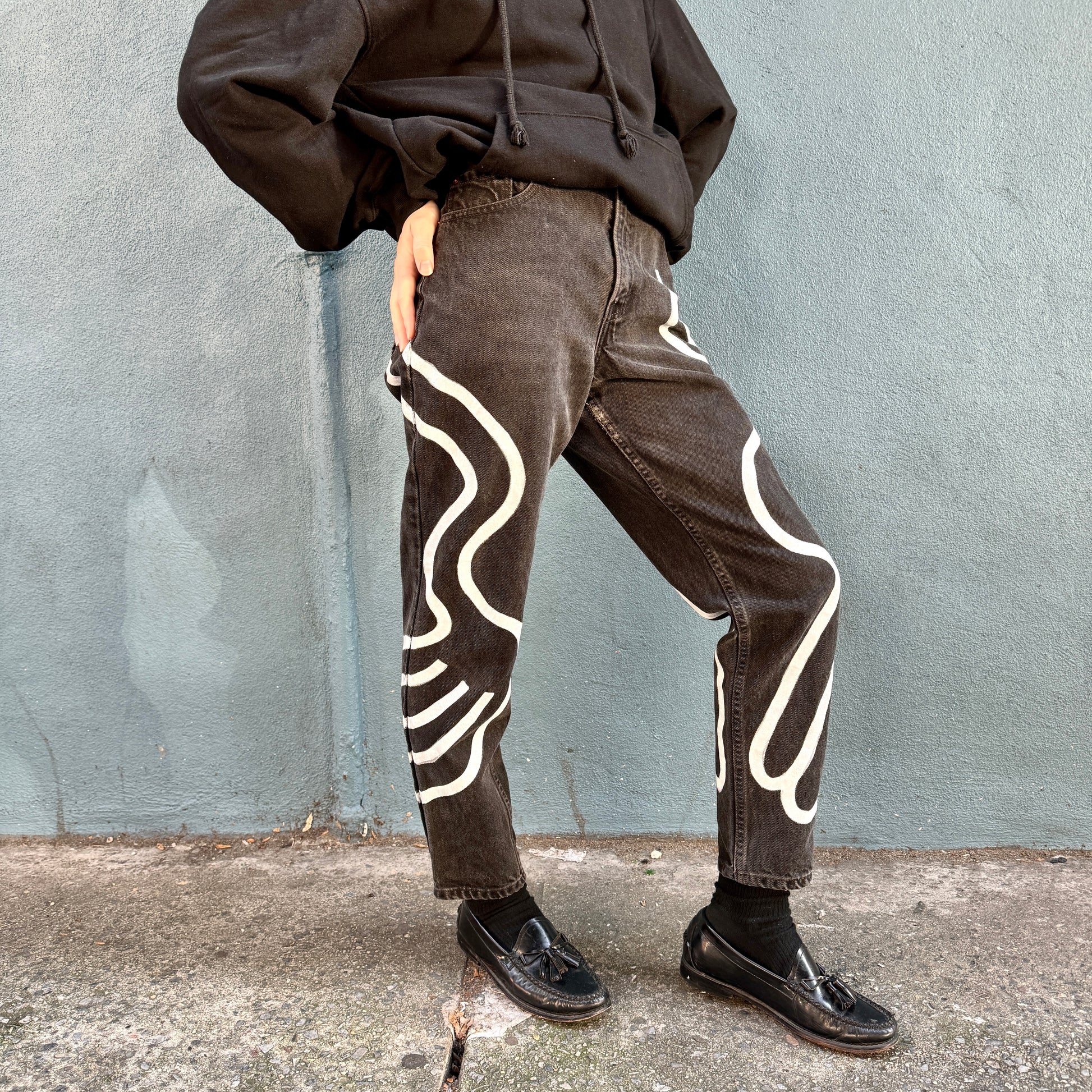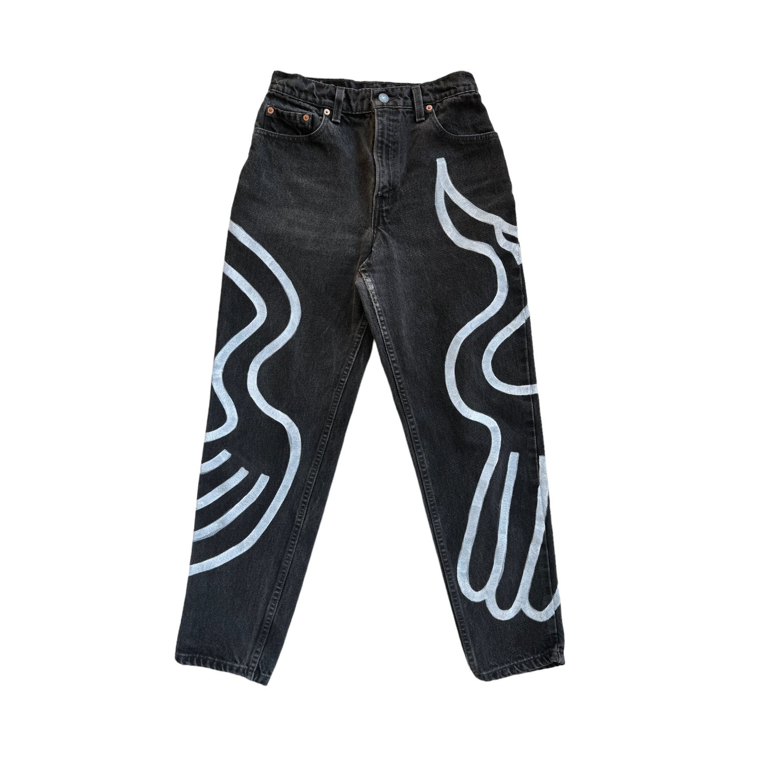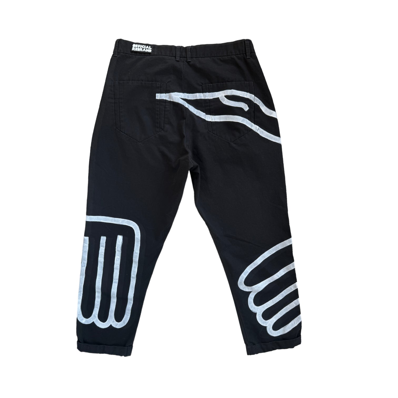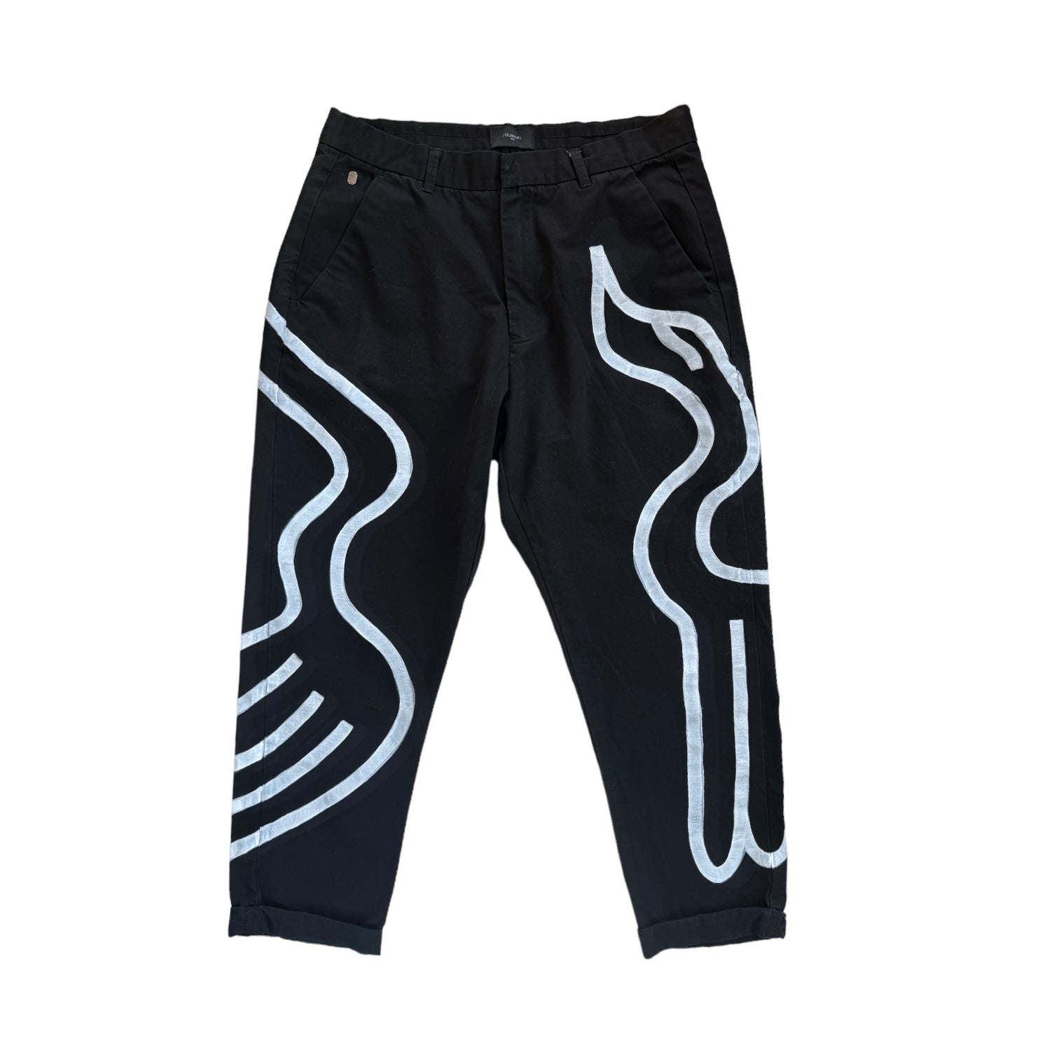 Transformed pants by MI Leggett with thickly painted white or black swans sprawling across the front and back.