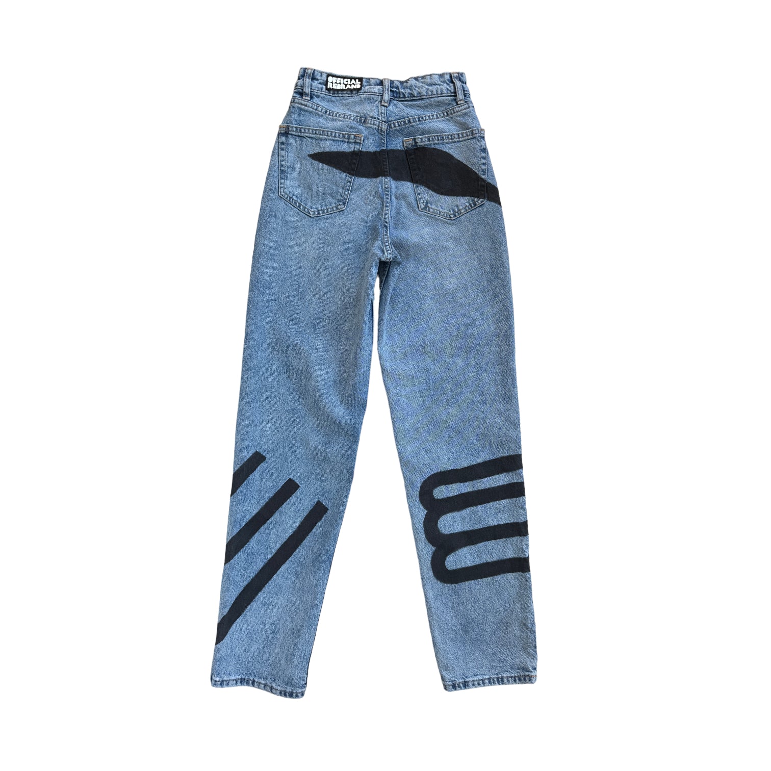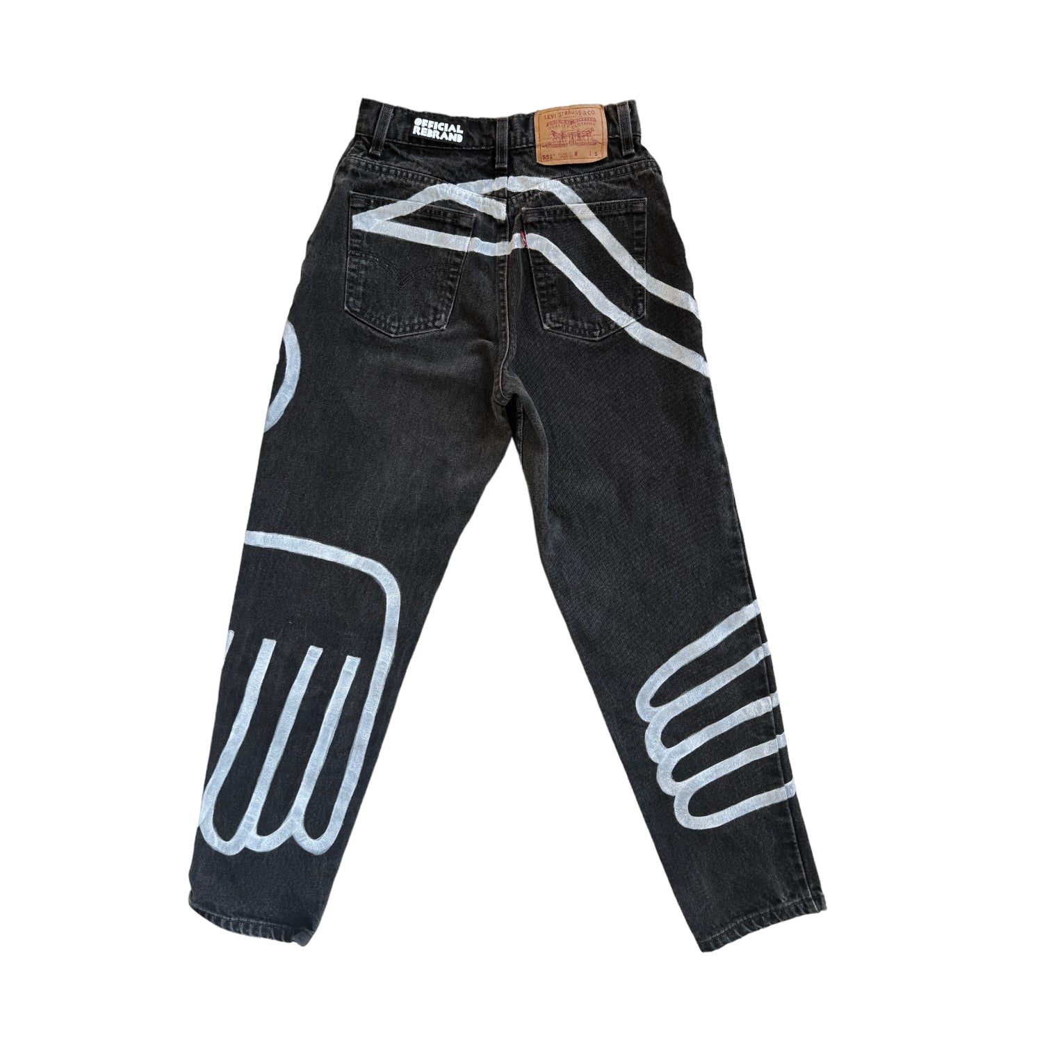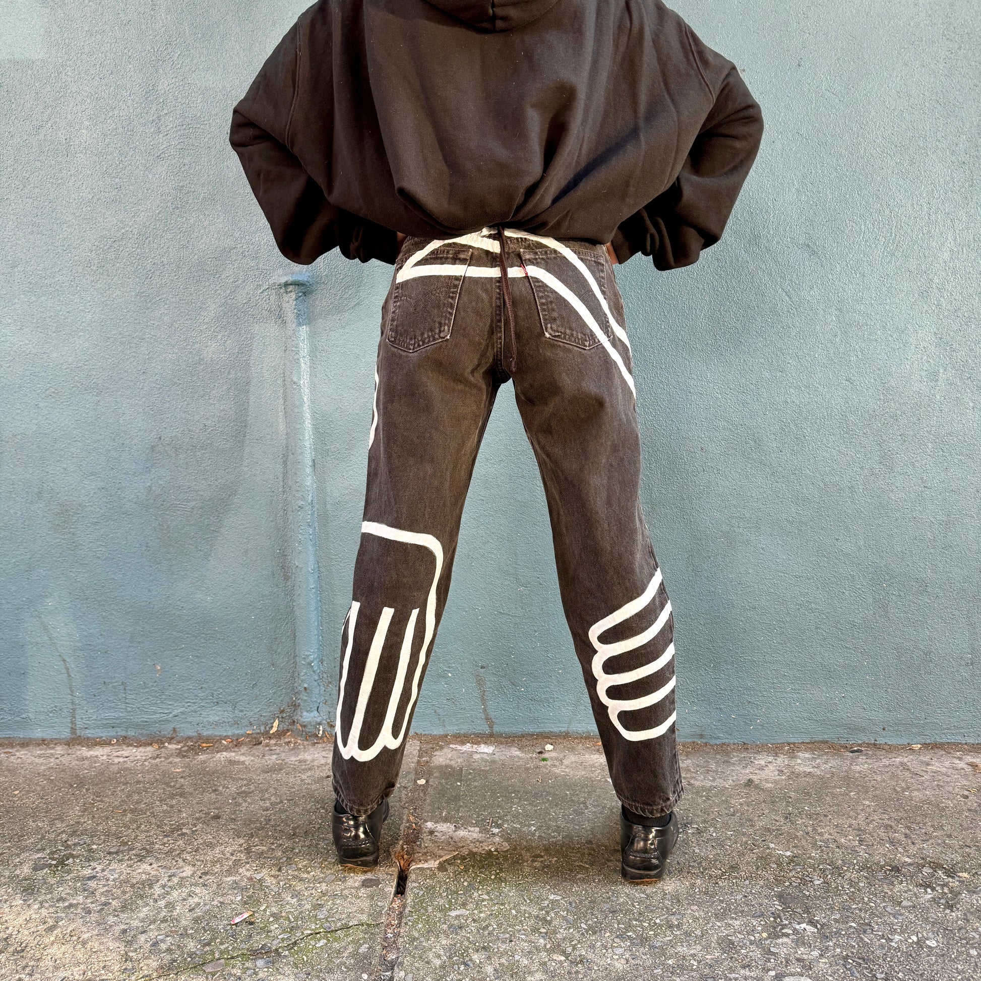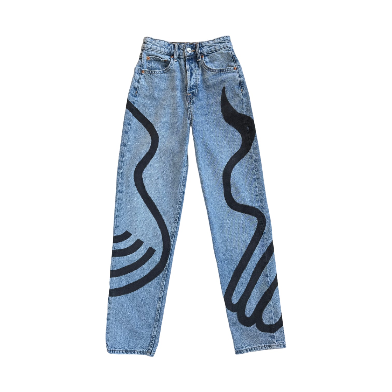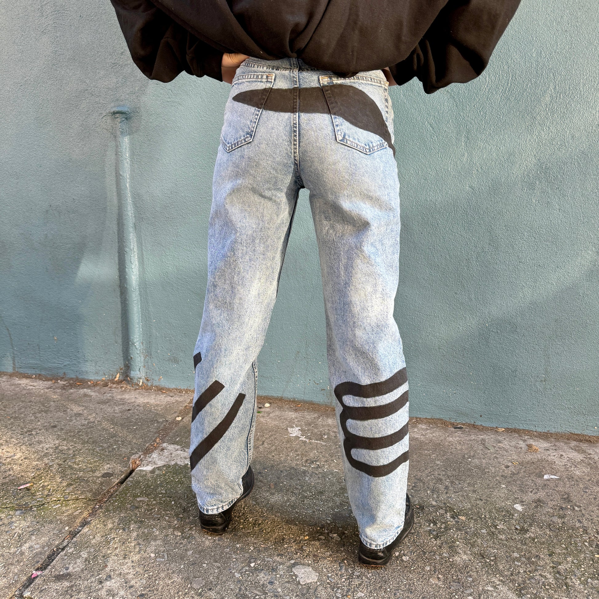 Transformed pants by MI Leggett with thickly painted white or black swans sprawling across the front and back.