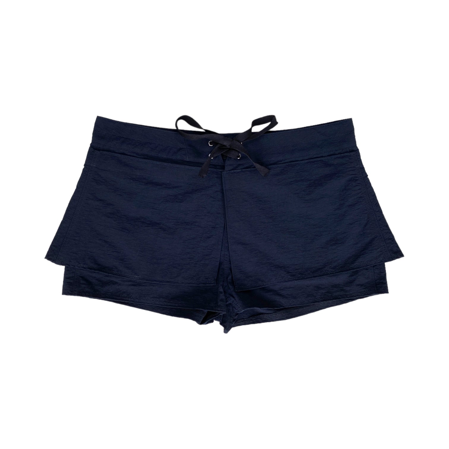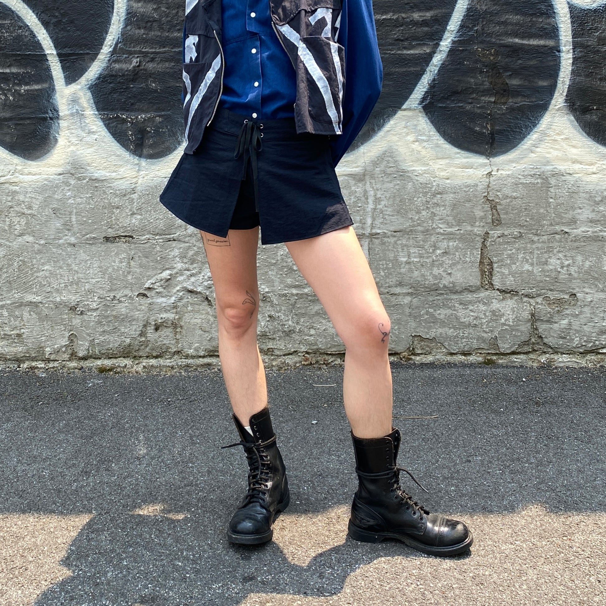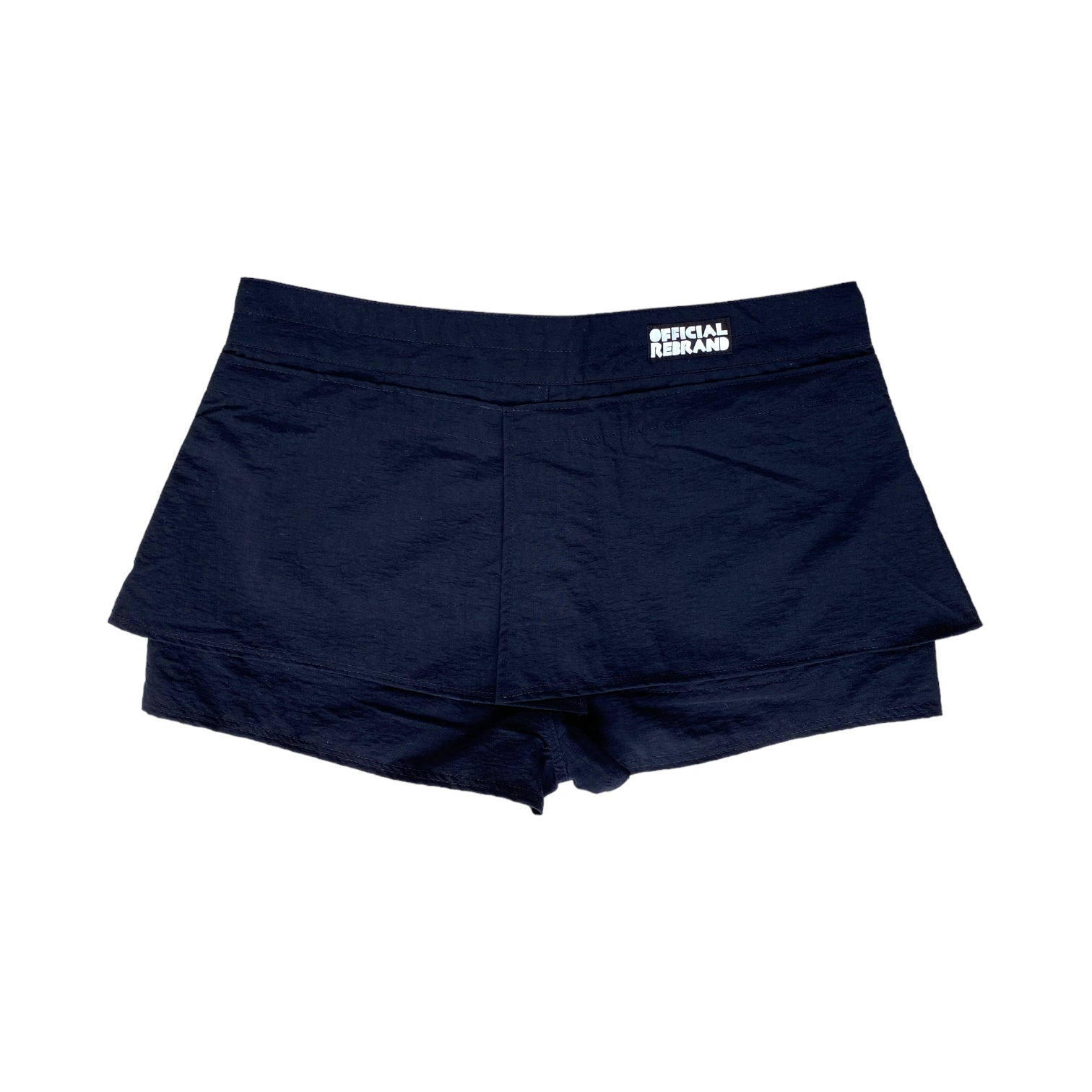 To reduce emissions and make use of what already exists, these dark navy, lightweight, 100% nylon skorts were upcycled from deadstock pants from a men's luxury sportswear brand that closed. These quick-drying, athletic style skorts are extremely breathable and can be worn in the water. They have single a back zippered pocket under the skort flap to keep your items secure and a layer of overlapping skirt panels. Original garments cut & sewn by workers in Pakistan, transformed on a made to order basis by MI Leggett.