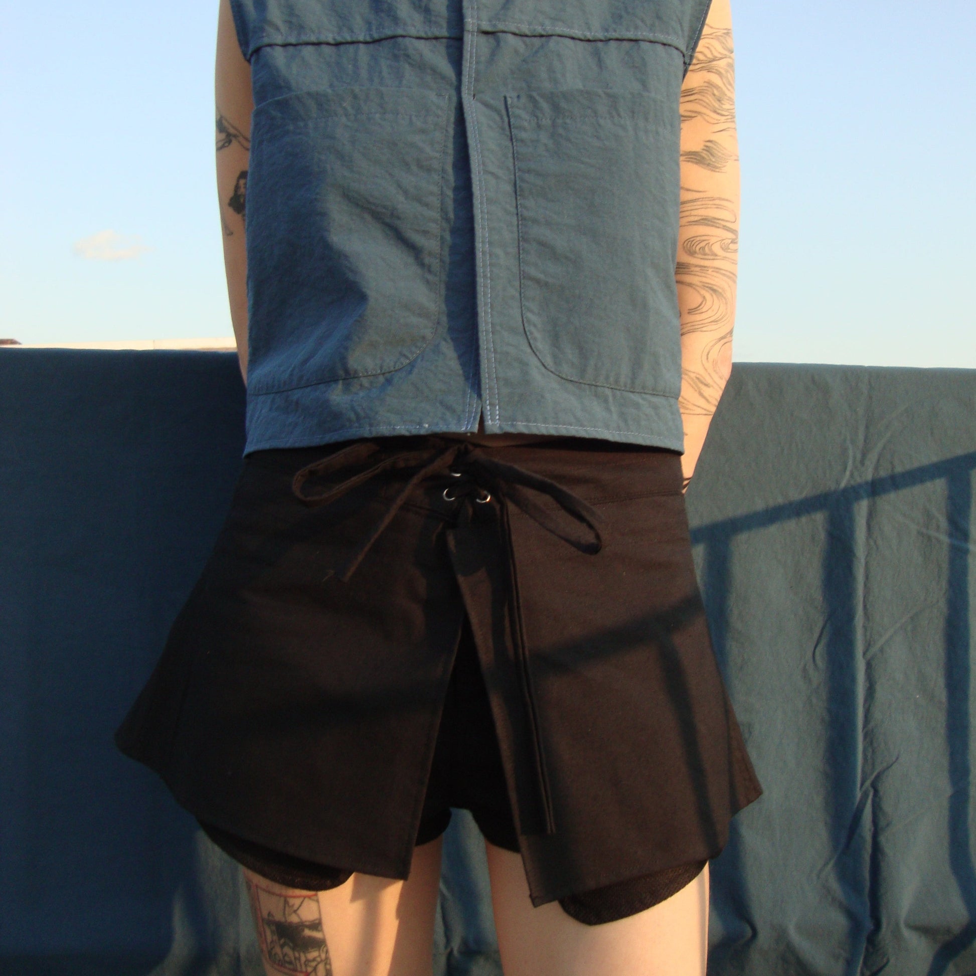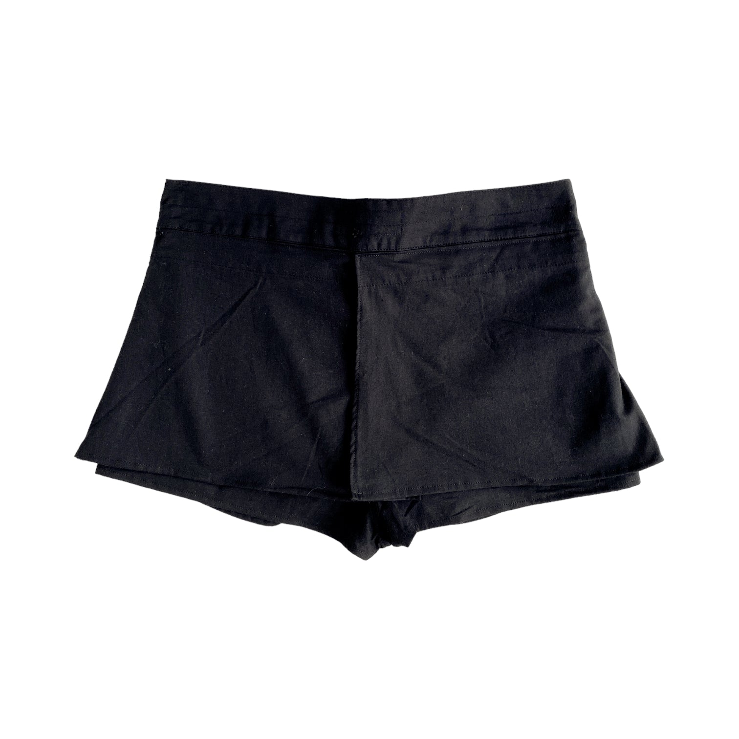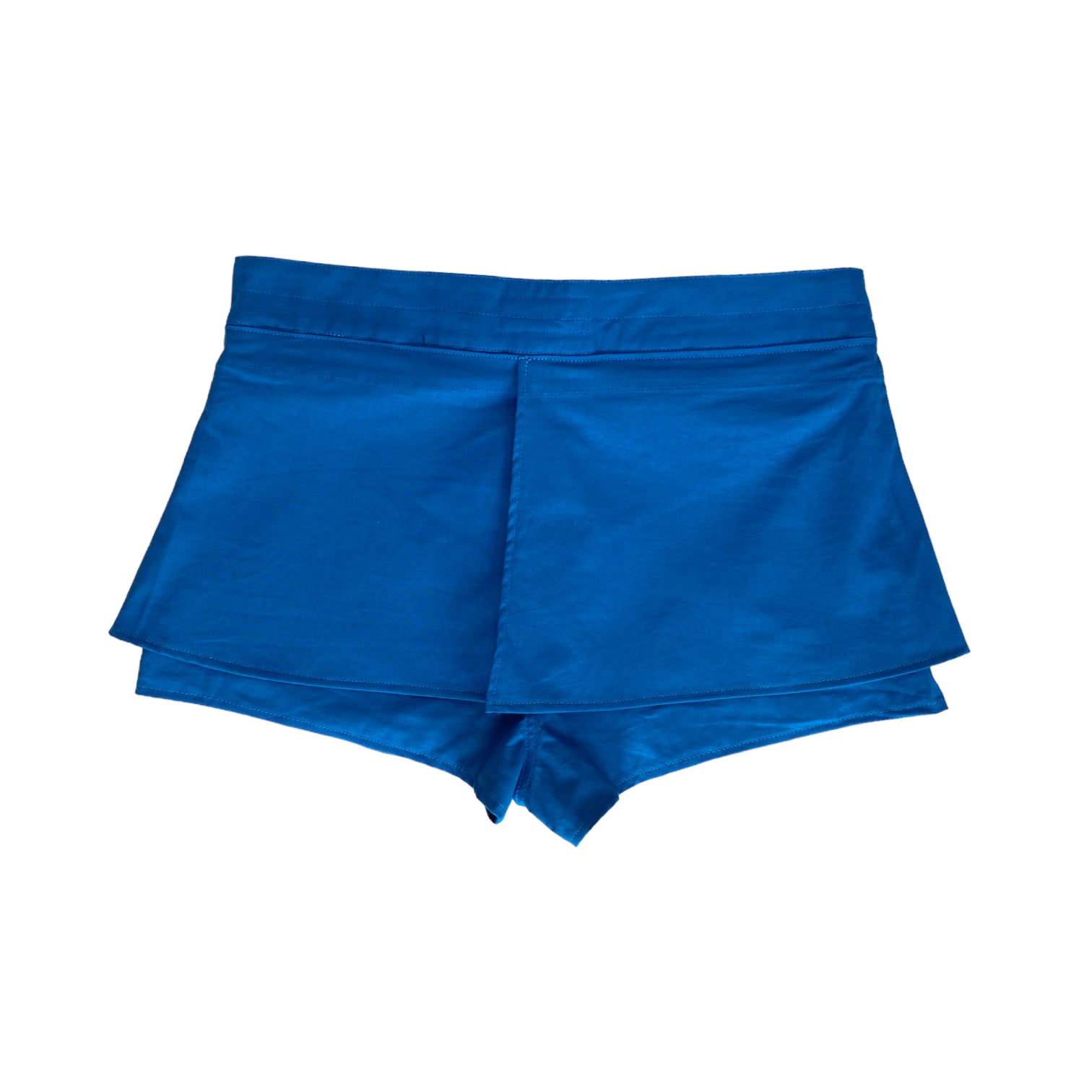 This upcycled skort has been described by customers as an essential staple in their summer wardrobe. Sourced from long board shorts leftover by a closed men's luxury clothing brand, these 100% cotton bottoms feature one zippered back pocket for a stylish and functional look and mesh inner side pockets with extra security as they are concealed by skirt flaps. The shorts were cropped into mini-shorts and the pant legs were made into overlapping skirt panels. The reworked design features a split gusset waistband and snap closures for adjustable comfort and fit. They are available in cream, black, royal blue, and baby blue.
