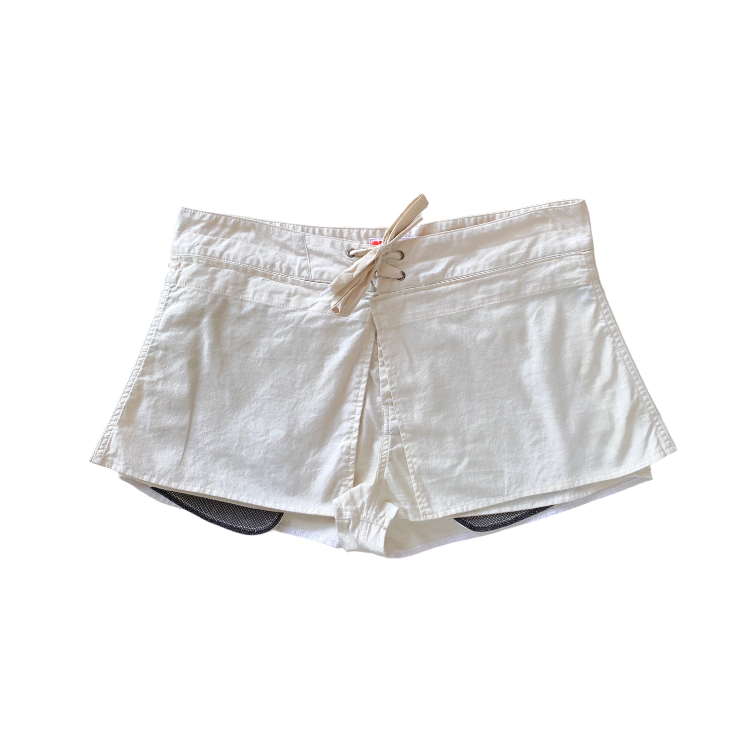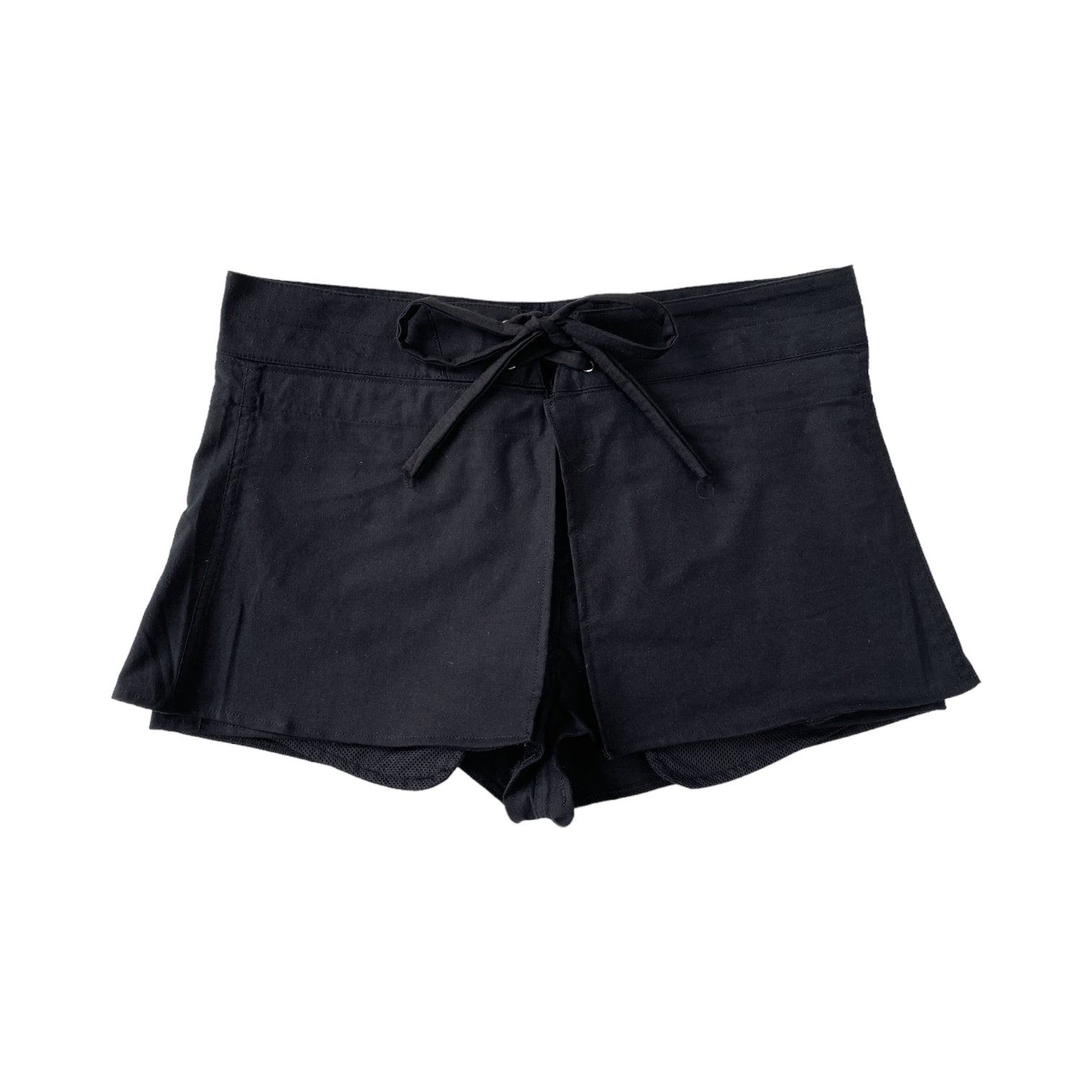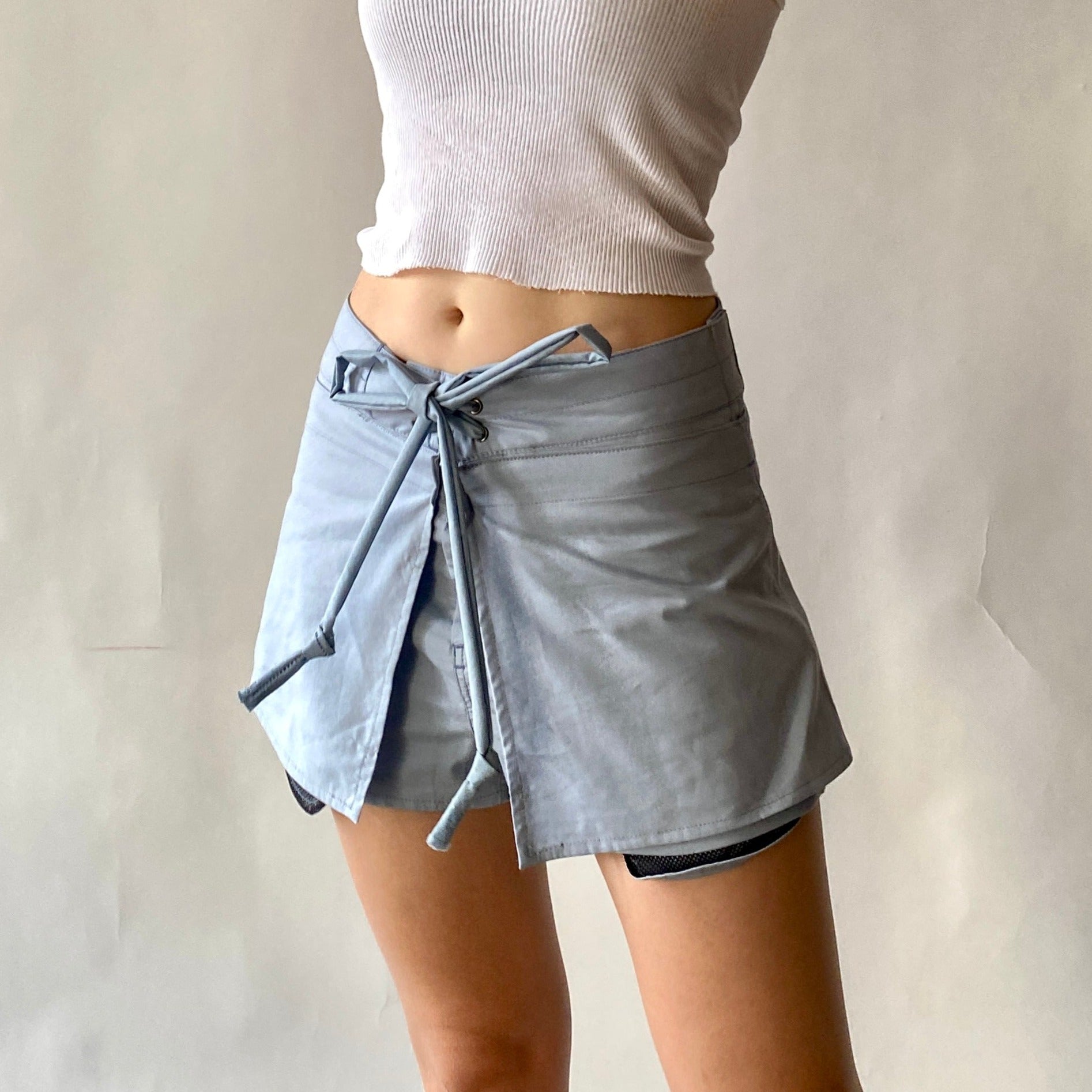This upcycled skort has been described by customers as an essential staple in their summer wardrobe. Sourced from long board shorts leftover by a closed men's luxury clothing brand, these 100% cotton bottoms feature one zippered back pocket for a stylish and functional look and mesh inner side pockets with extra security as they are concealed by skirt flaps. The shorts were cropped into mini-shorts and the pant legs were made into overlapping skirt panels. The reworked design features a split gusset waistband and snap closures for adjustable comfort and fit. They are available in cream, black, royal blue, and baby blue.