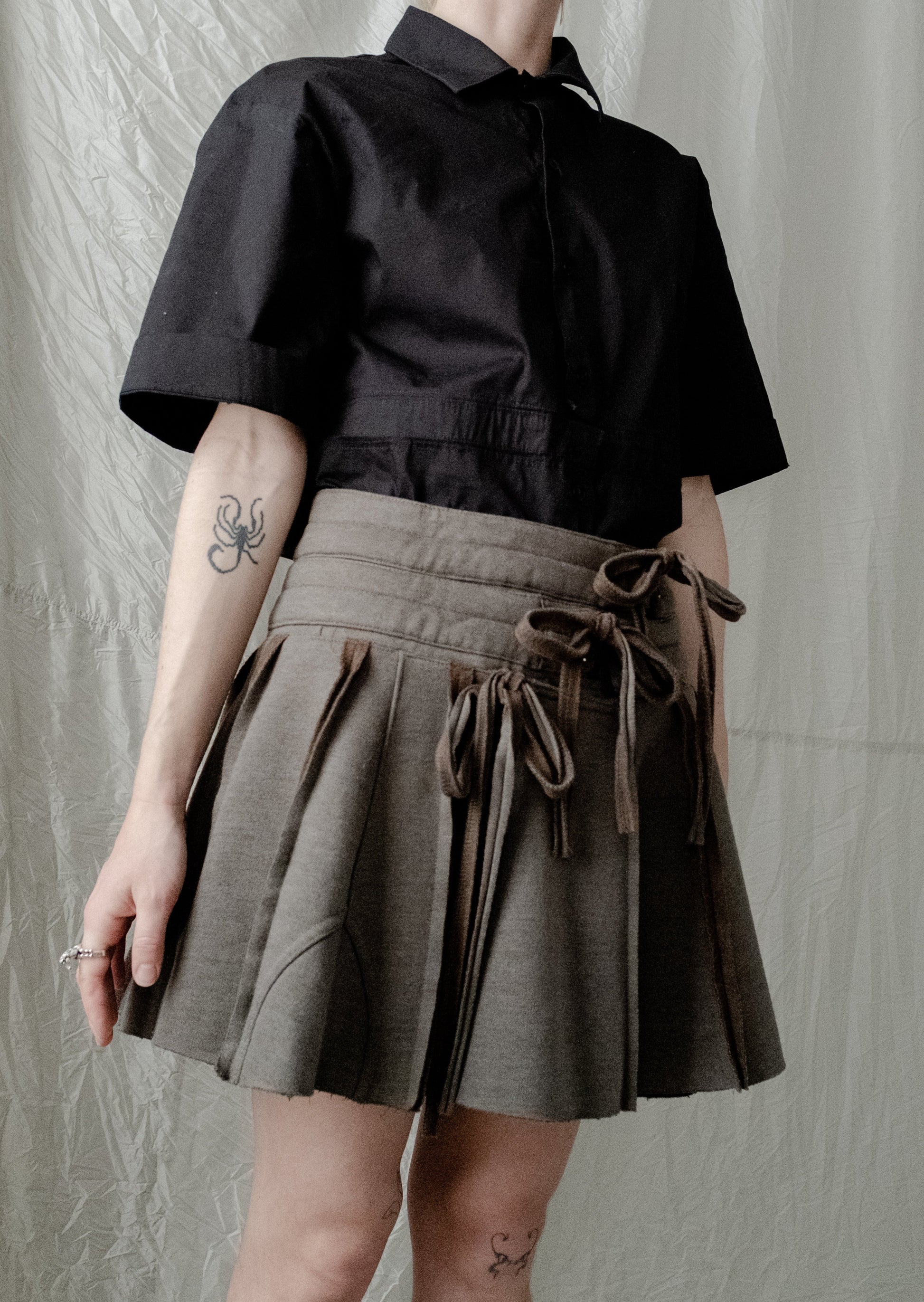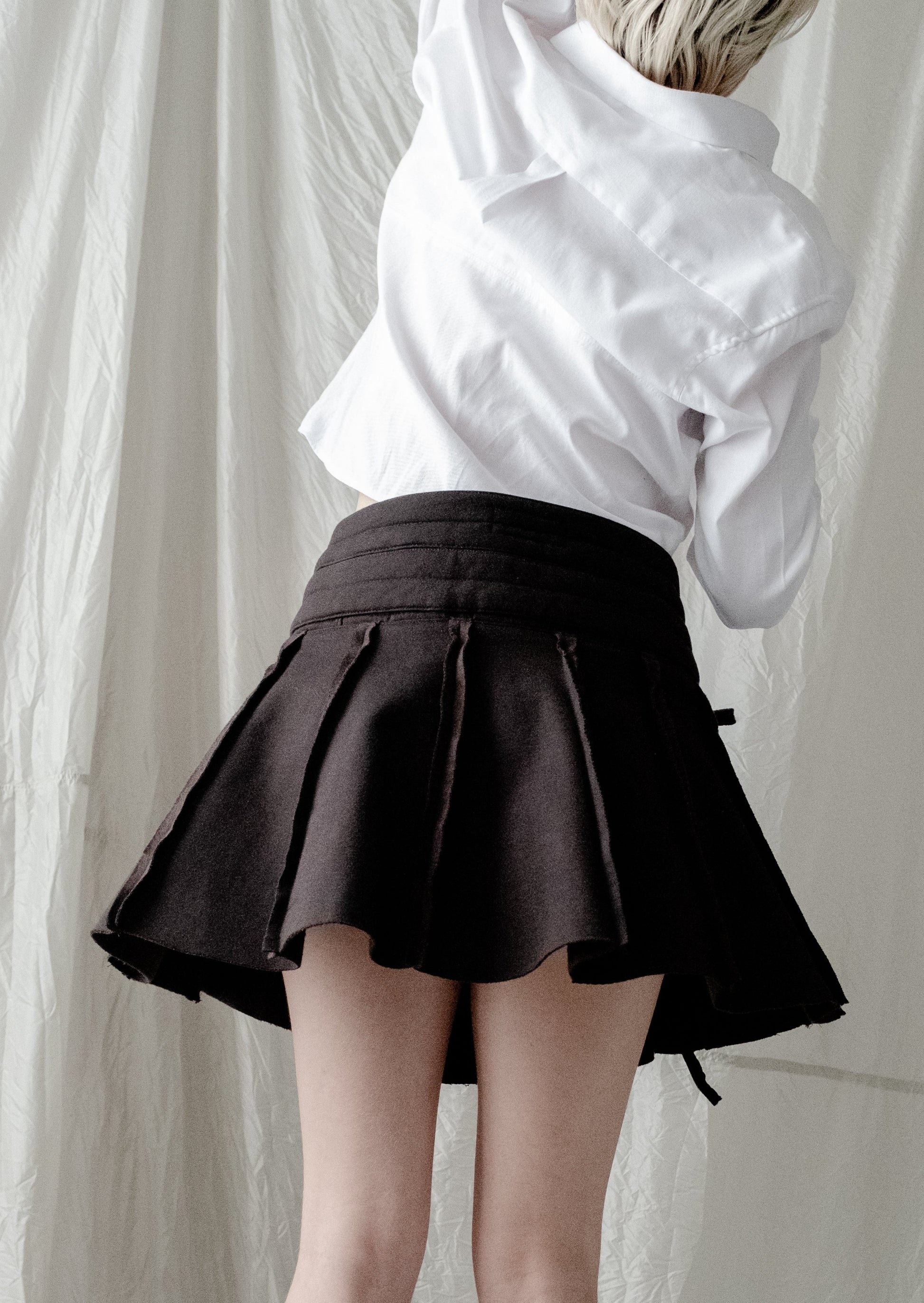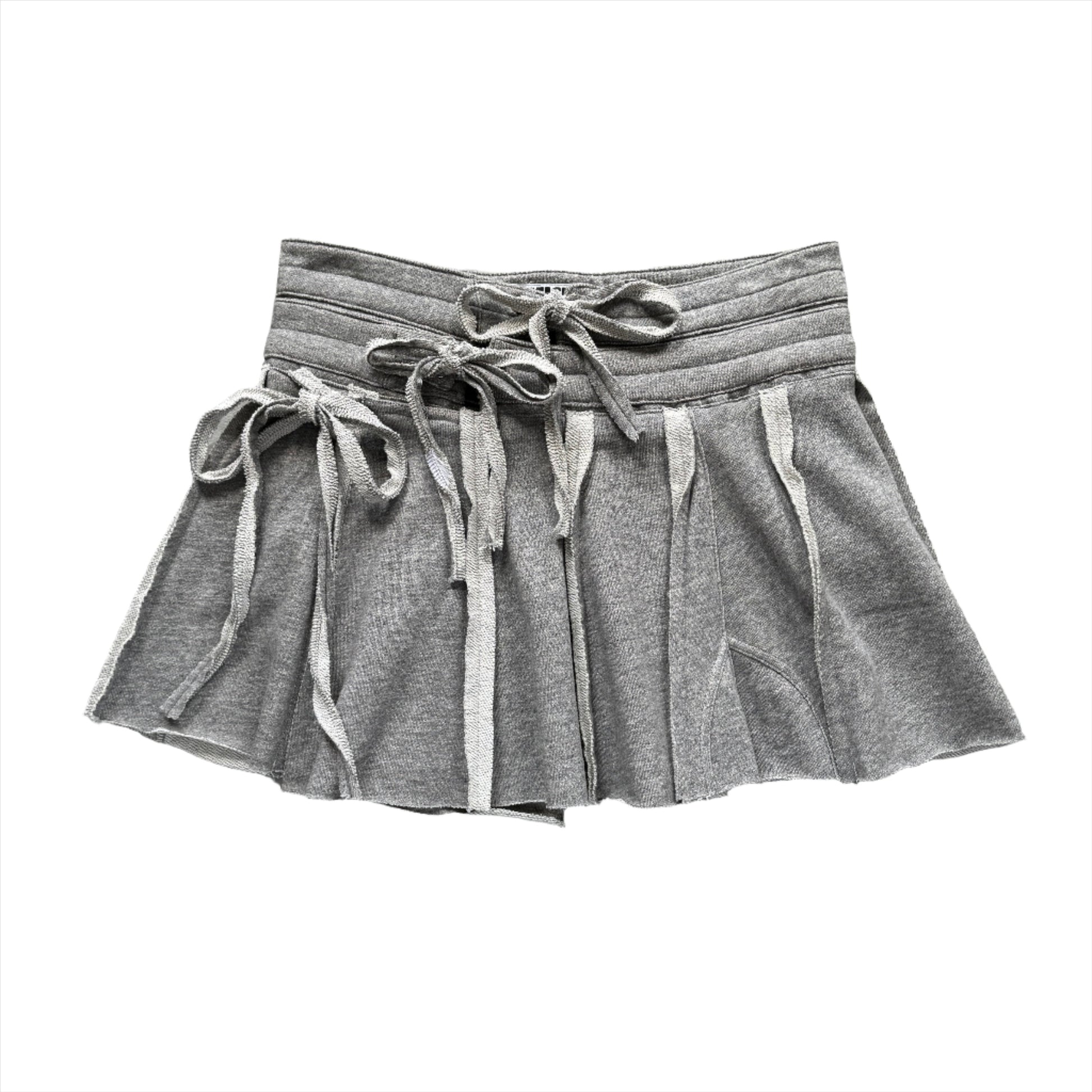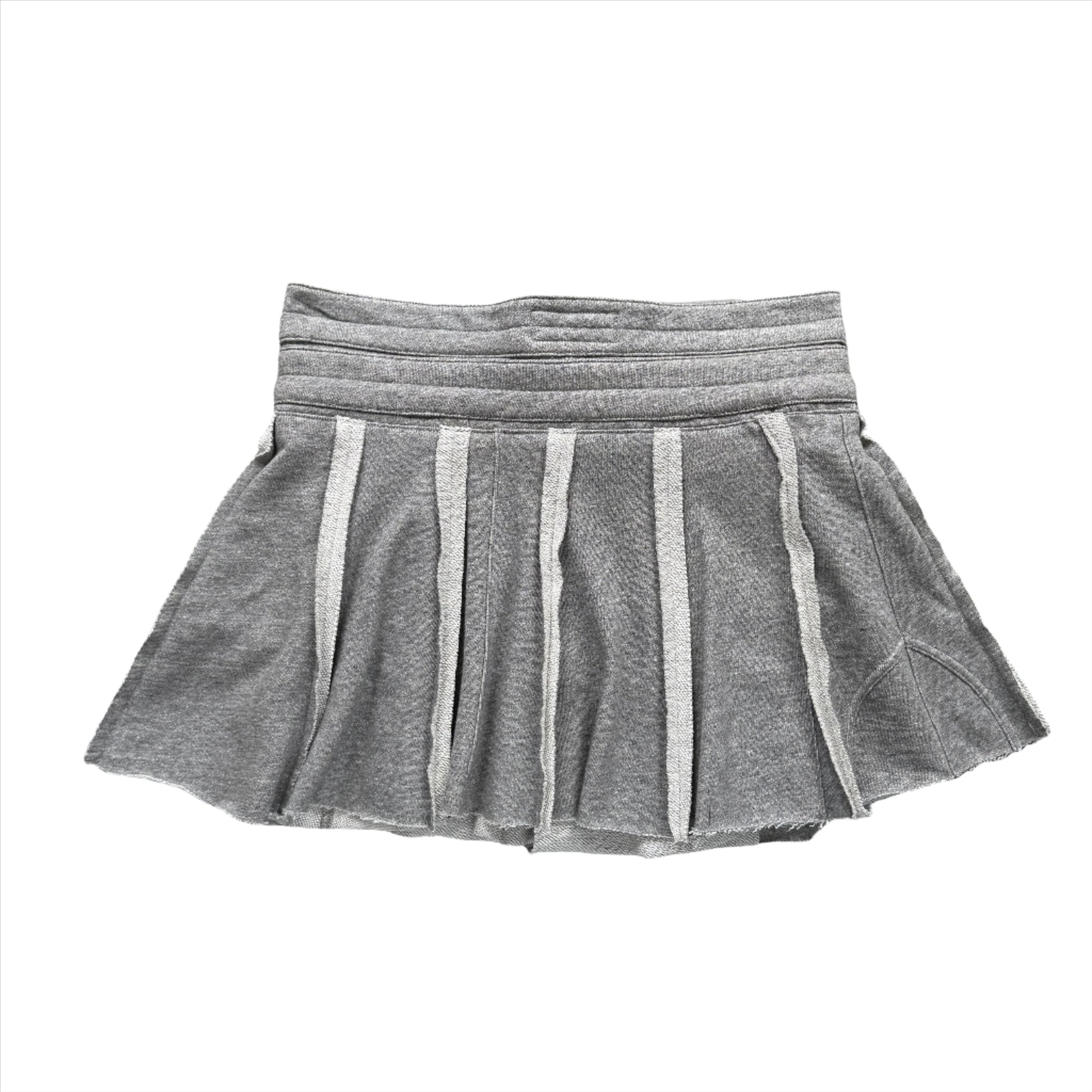 To reduce emissions and make use of what already exists, we are transforming sweatpants from a shuddered men's luxury sporting brand into these adjustable, miniskirts. These flirty and athletic skirts are made from high-quality heavyweight fabric that's remarkably soft. The skirts can be opened fully and wrap around to fit a wide range of body shapes and sizes. The unique double waistband (made from two pairs of pants) with two drawstring closures and a third drawstring to close the wrapped skirt panels provides size adjustability and a pleated, layered look. The skirts have hidden pockets underneath the pleats to keep your items stealthily safe, two on the front and one on the back.