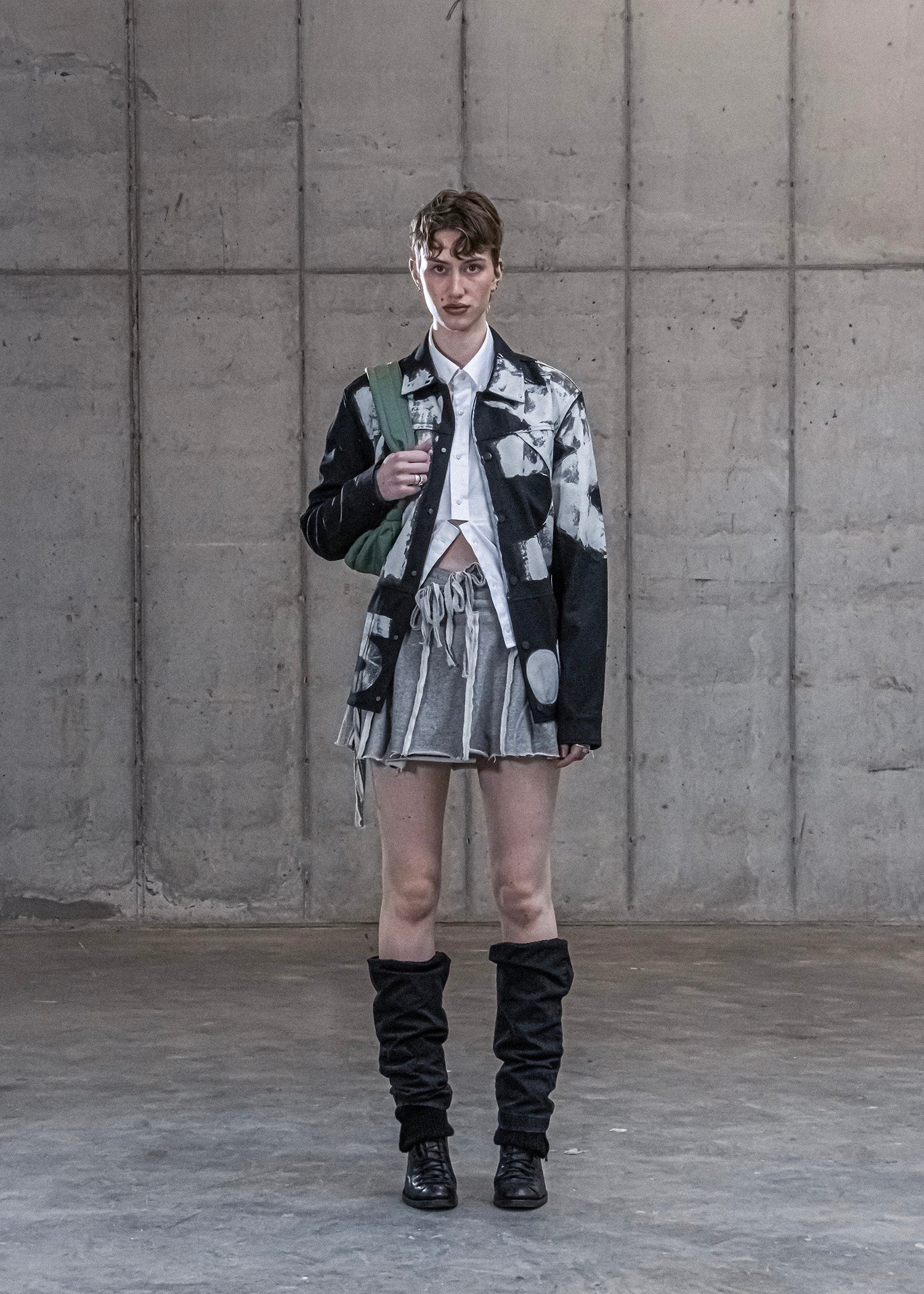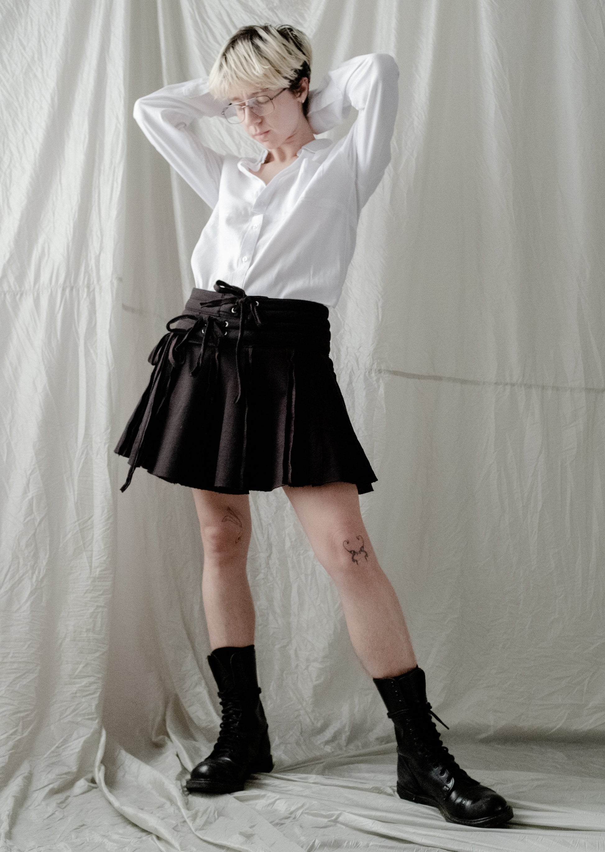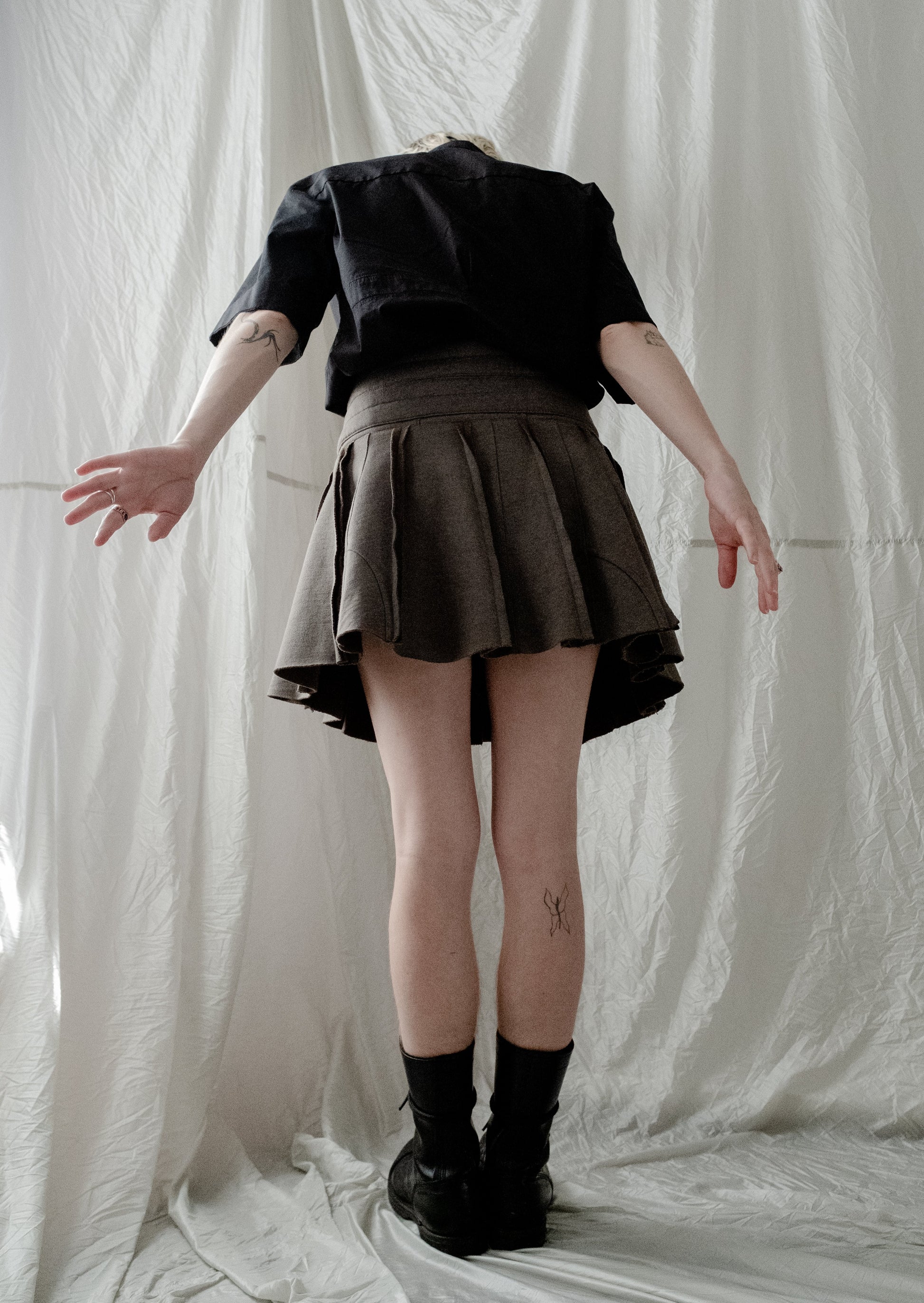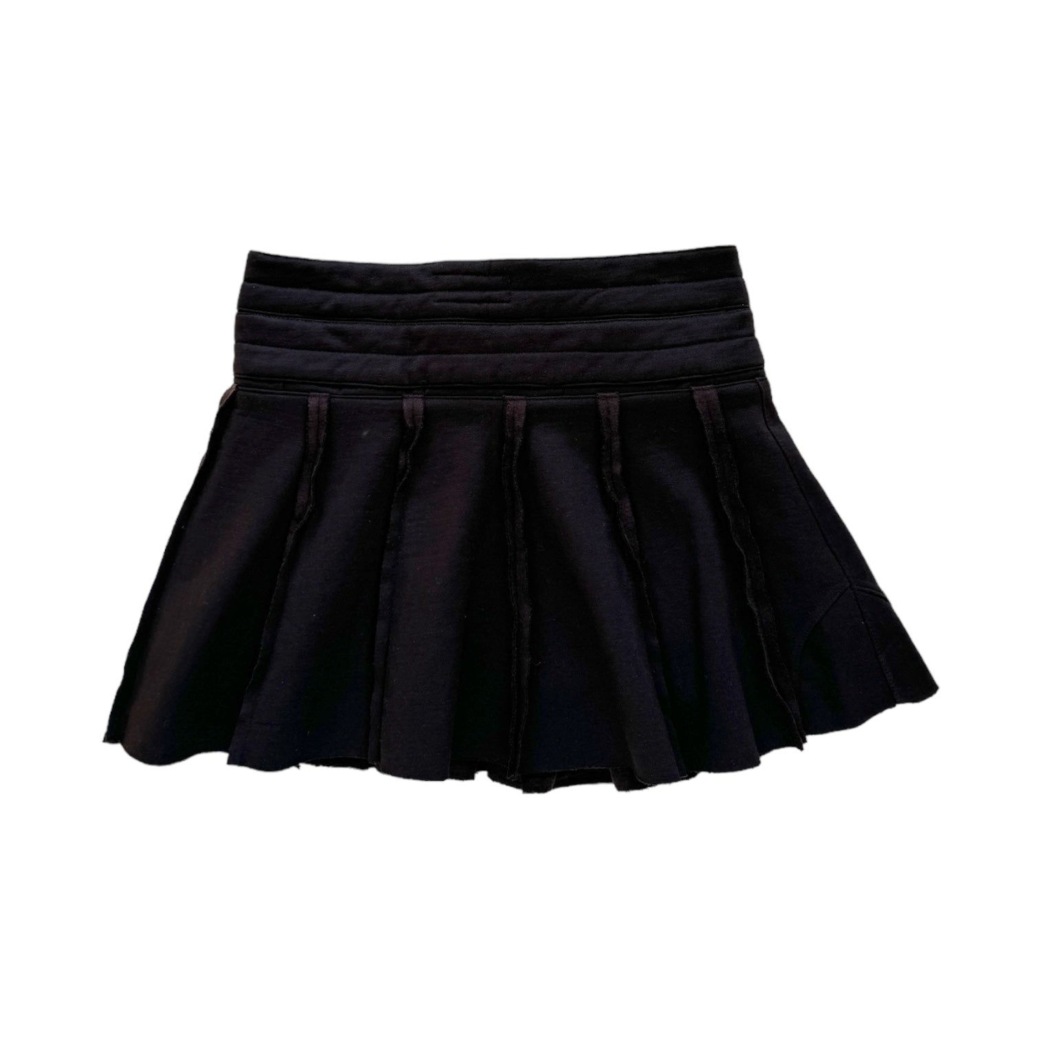 To reduce emissions and make use of what already exists, we are transforming sweatpants from a shuddered men's luxury sporting brand into these adjustable, miniskirts. These flirty and athletic skirts are made from high-quality heavyweight fabric that's remarkably soft. The skirts can be opened fully and wrap around to fit a wide range of body shapes and sizes. The unique double waistband (made from two pairs of pants) with two drawstring closures and a third drawstring to close the wrapped skirt panels provides size adjustability and a pleated, layered look. The skirts have hidden pockets underneath the pleats to keep your items stealthily safe, two on the front and one on the back.